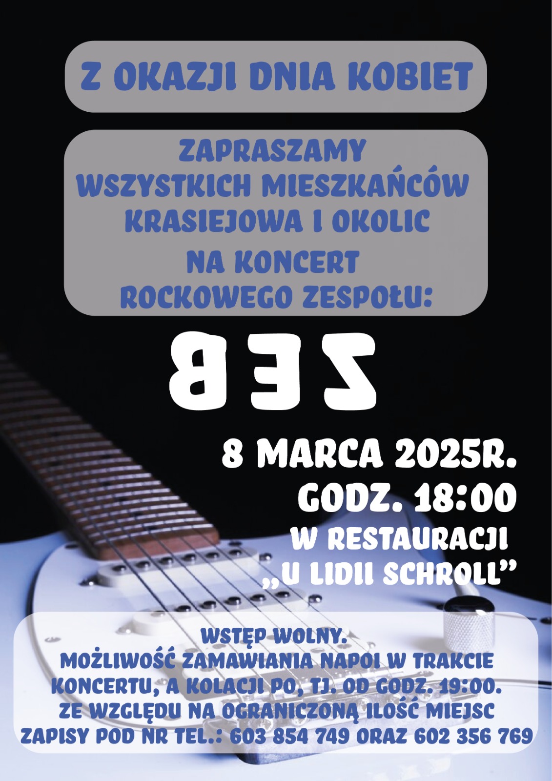 Zapraszamy w Dniu Kobiet o godz. 18.00 na koncert w wykonaniu zespołu BEZ z udziałem mieszkańca naszej miejscowości. Koncert, który odbędzie się w restauracji u Lidii Schroll jest niebiletowany, wolne datki do kapelusza (na nowe struny). W miarę możliwości prosi się o potwierdzenie przybycia telefony: 603 854 749 lub 602 356 769