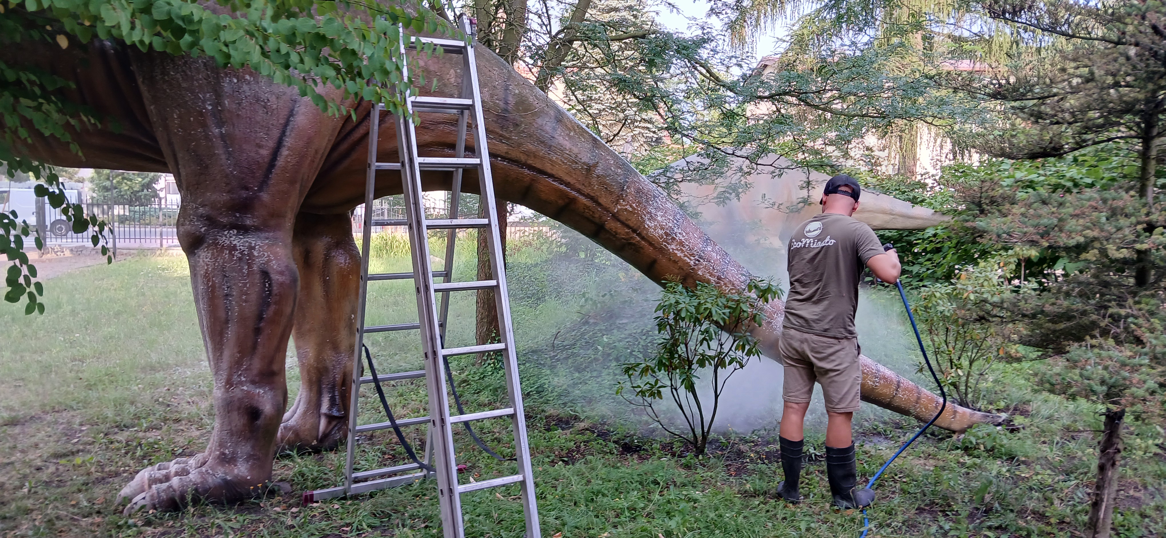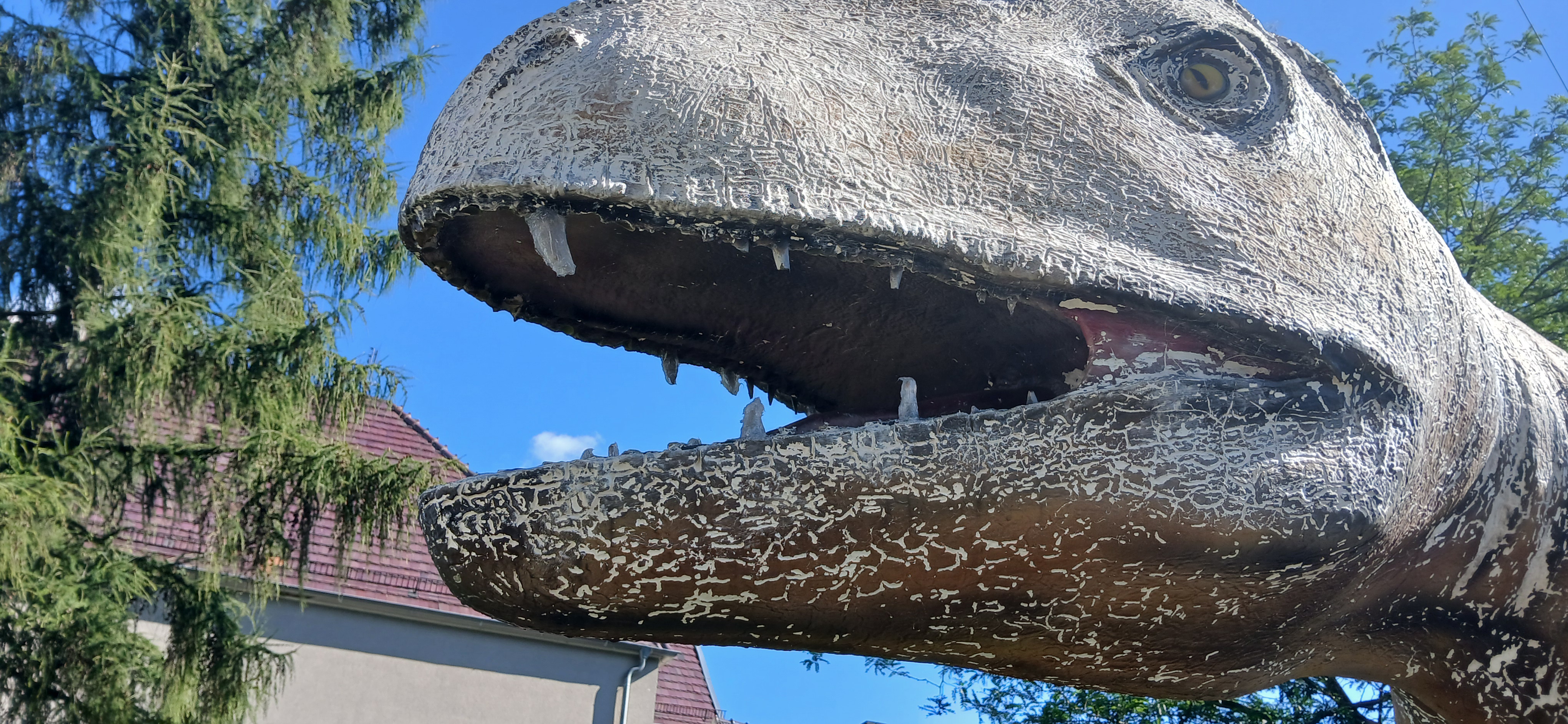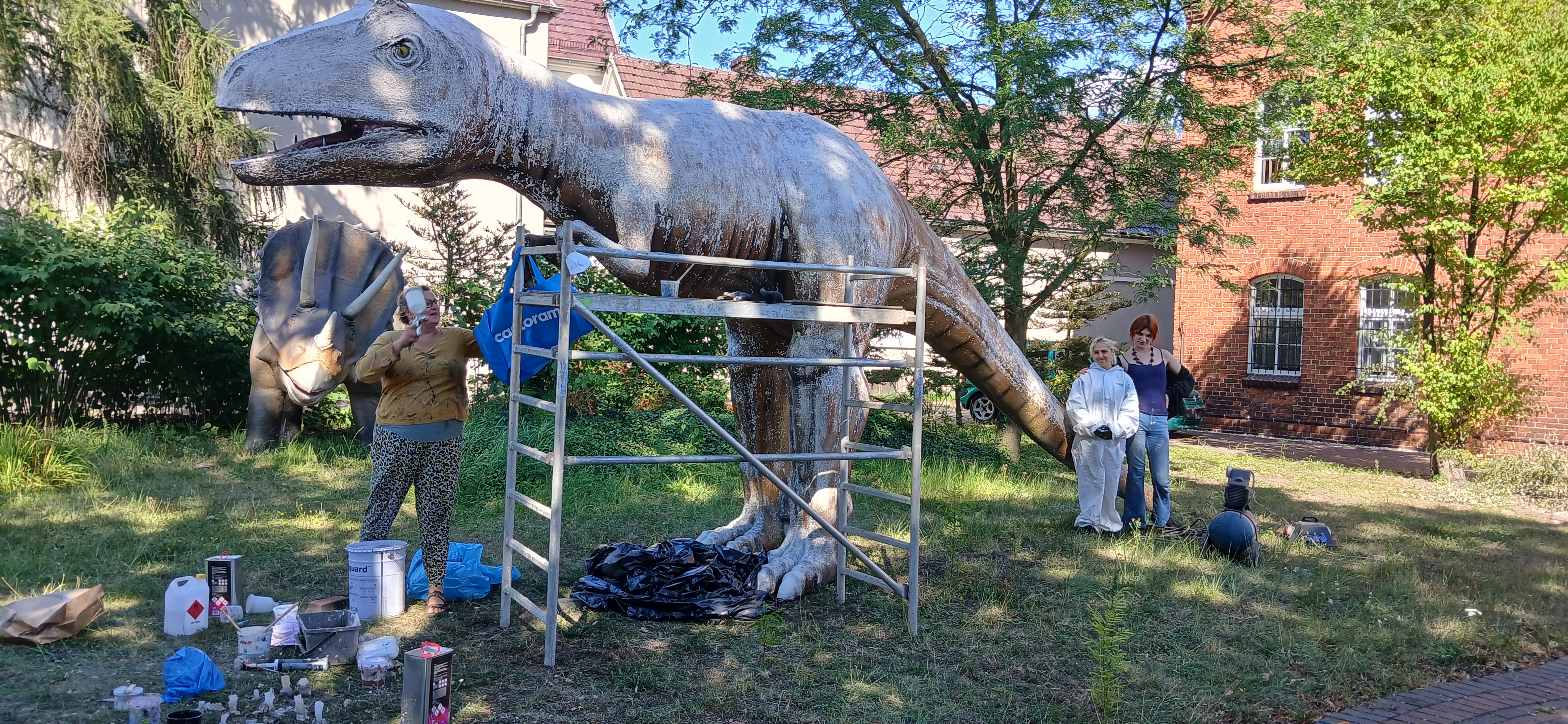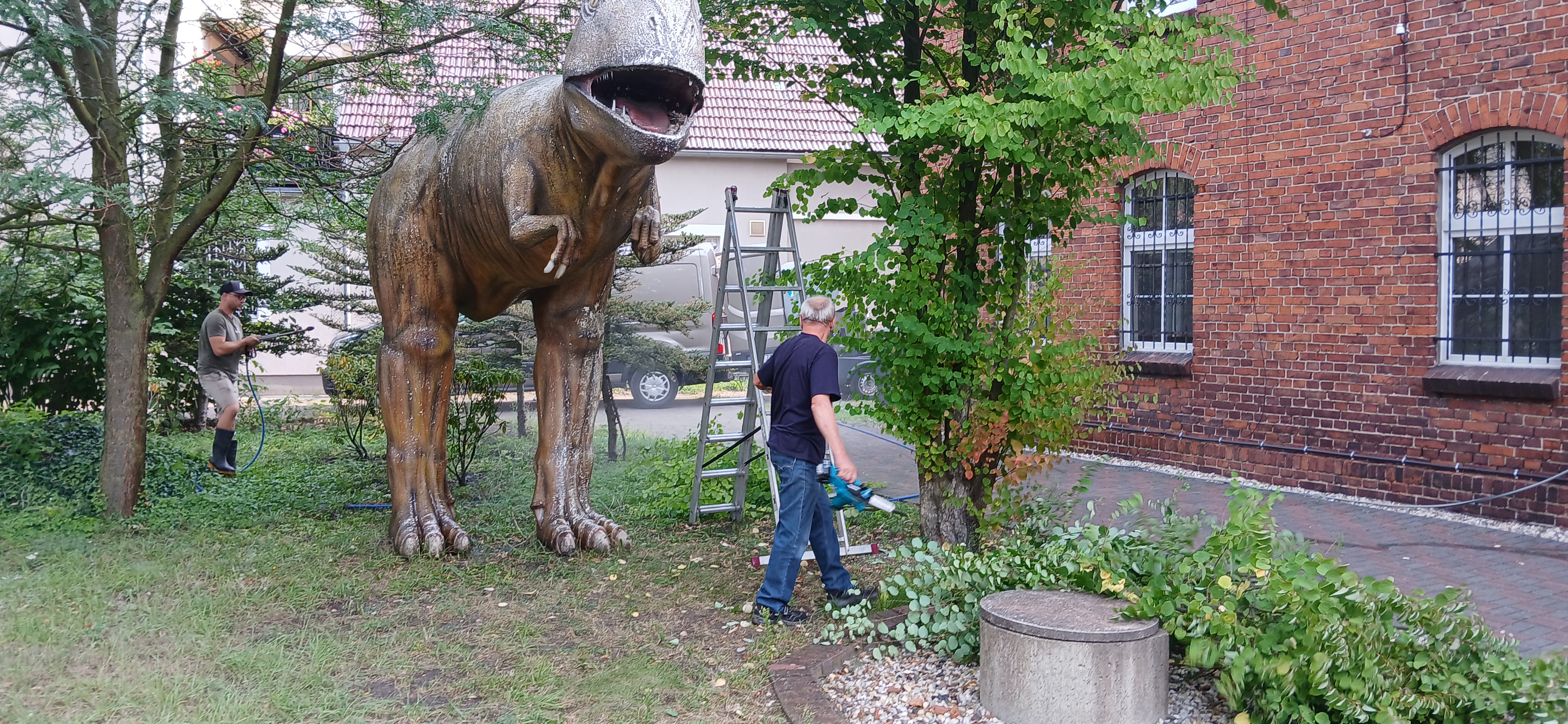 Na placu przed Starą Szkołą trwają prace renowacyjne allozaura. W zeszłym tygodniu został gruntownie umyty, a w tym tygodniu uzupełniano ubytki paznokci u kończyn i uzębienia. Panie formują z masy epoksydowej nowe zęby, szlifują je i mocują w szczęce zwierzęcia. W następnym tygodniu prehistoryczny dinozaur będzie malowany. Prace zostaną sfinansowane z budżetu gminy Ozimek.