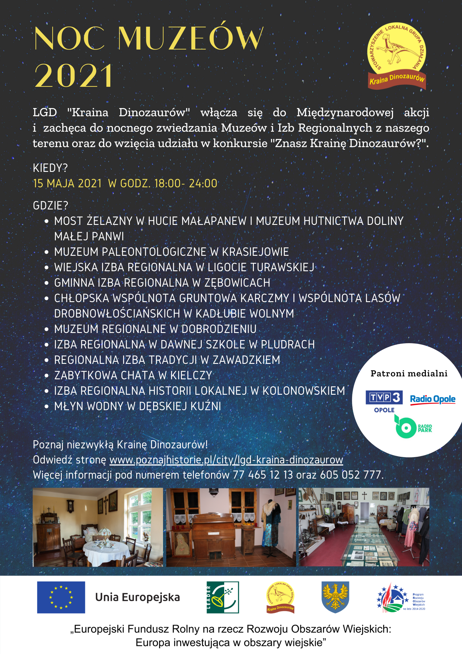 Zapraszamy do udziału w Nocy Muzeów organizowanej przez LGD "Kraina Dinzaurów" w dniu 15.05.2021 w godzinach od 18.00 do 24.00. Więcej informacji na plakatach i w załącznikach. Podczas Nocy Muzeum będziemy gościć Michała Malisza- pasjonata pożarnictwa ze Śląska, którego eksponaty znajdują się w naszym muzeum. Zapraszamy do zwiedzenia i wysłuchania ciekawostek. Wstęp bezpłatny. Można wziąć również udział w konkursie "Czy znasz Krainę Dinozaurów" (czytaj więcej...)