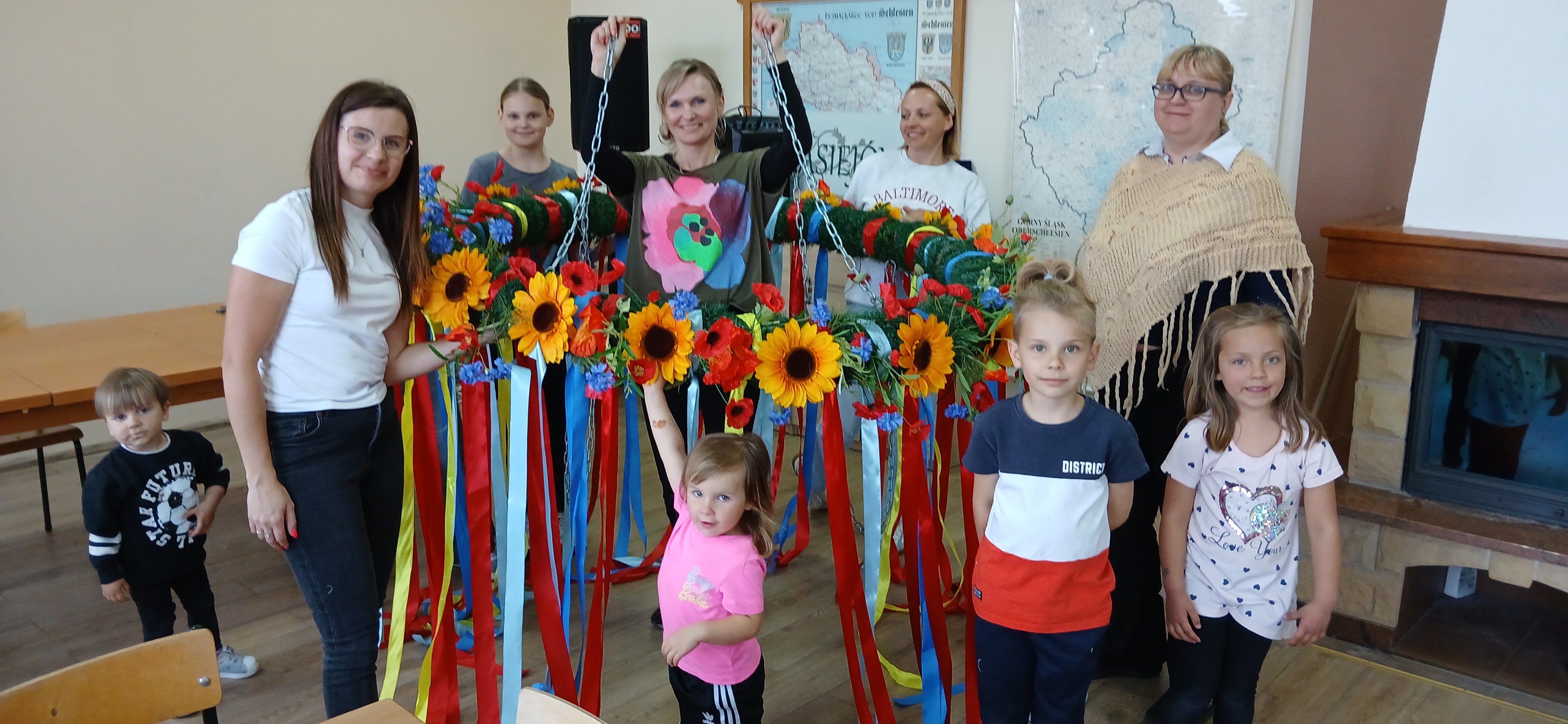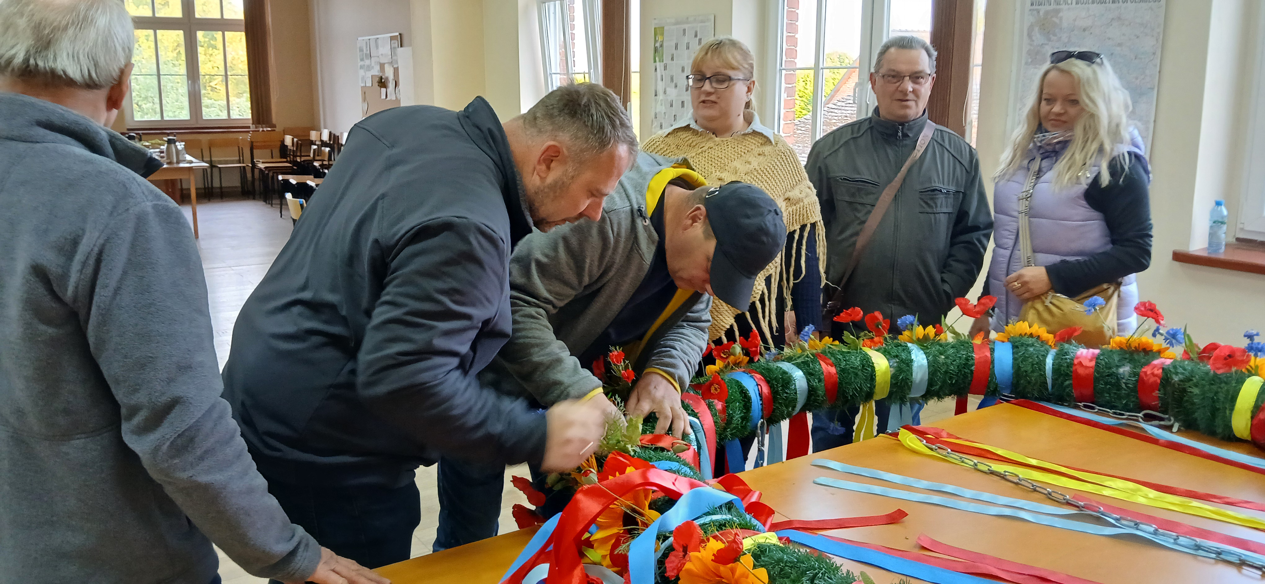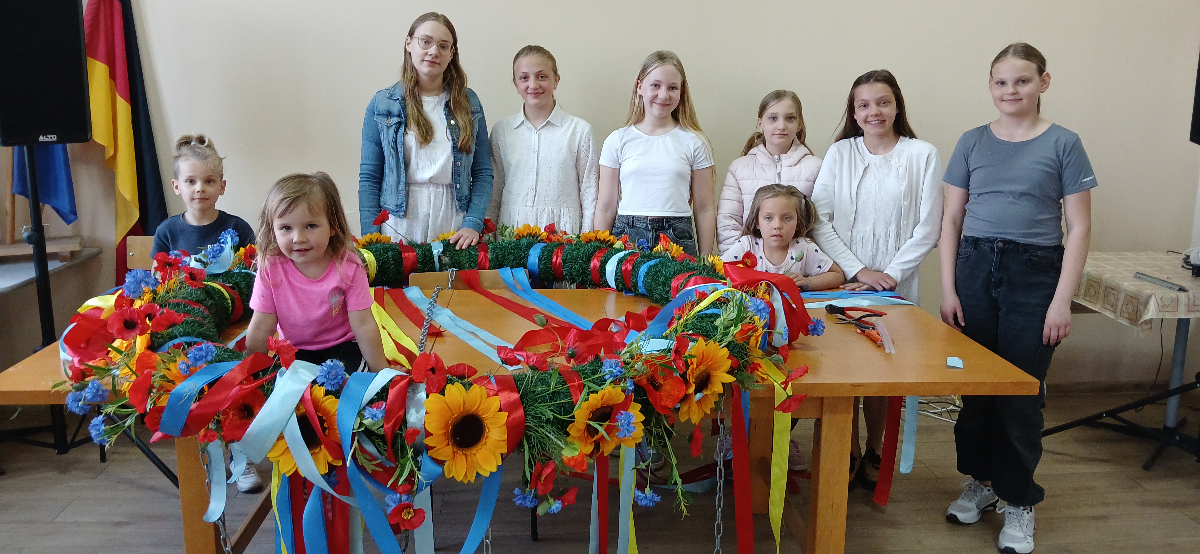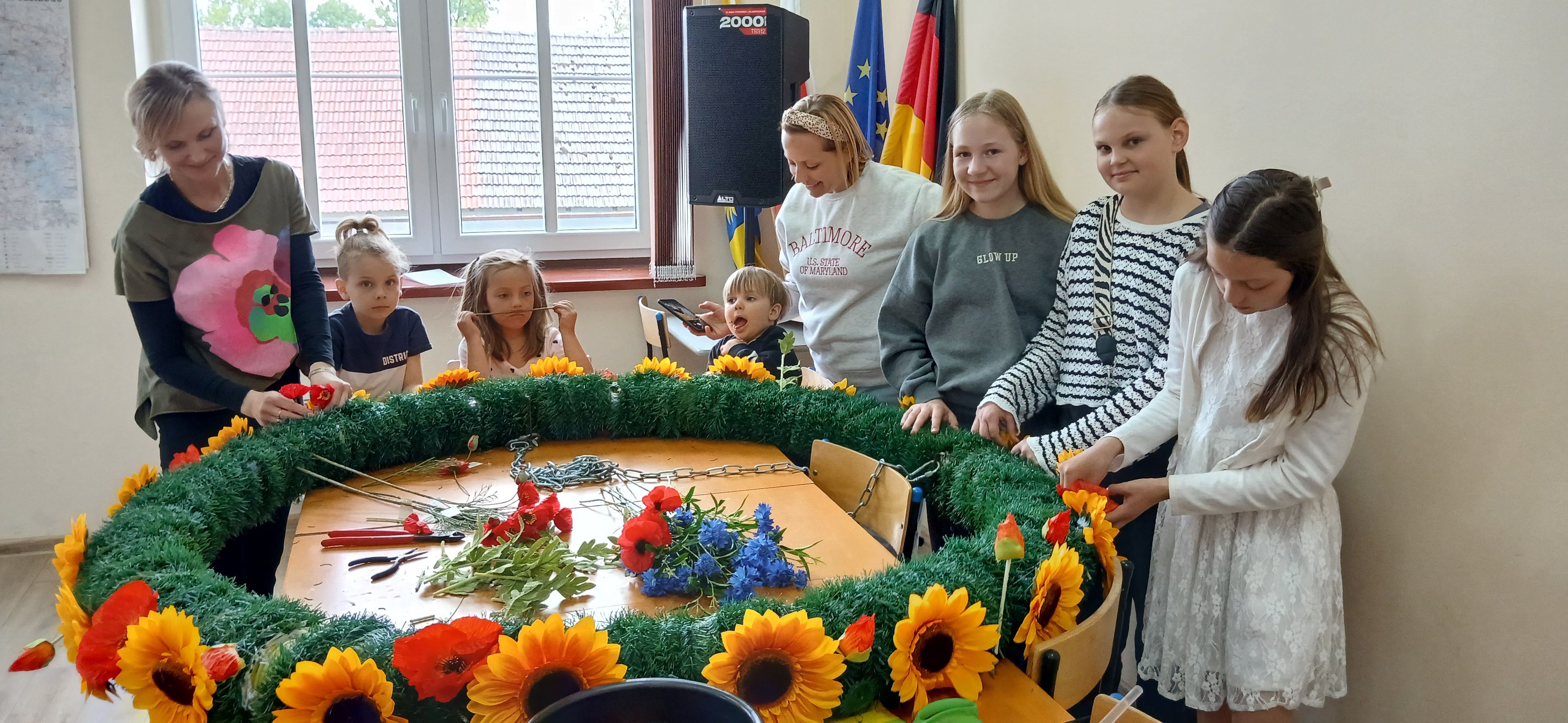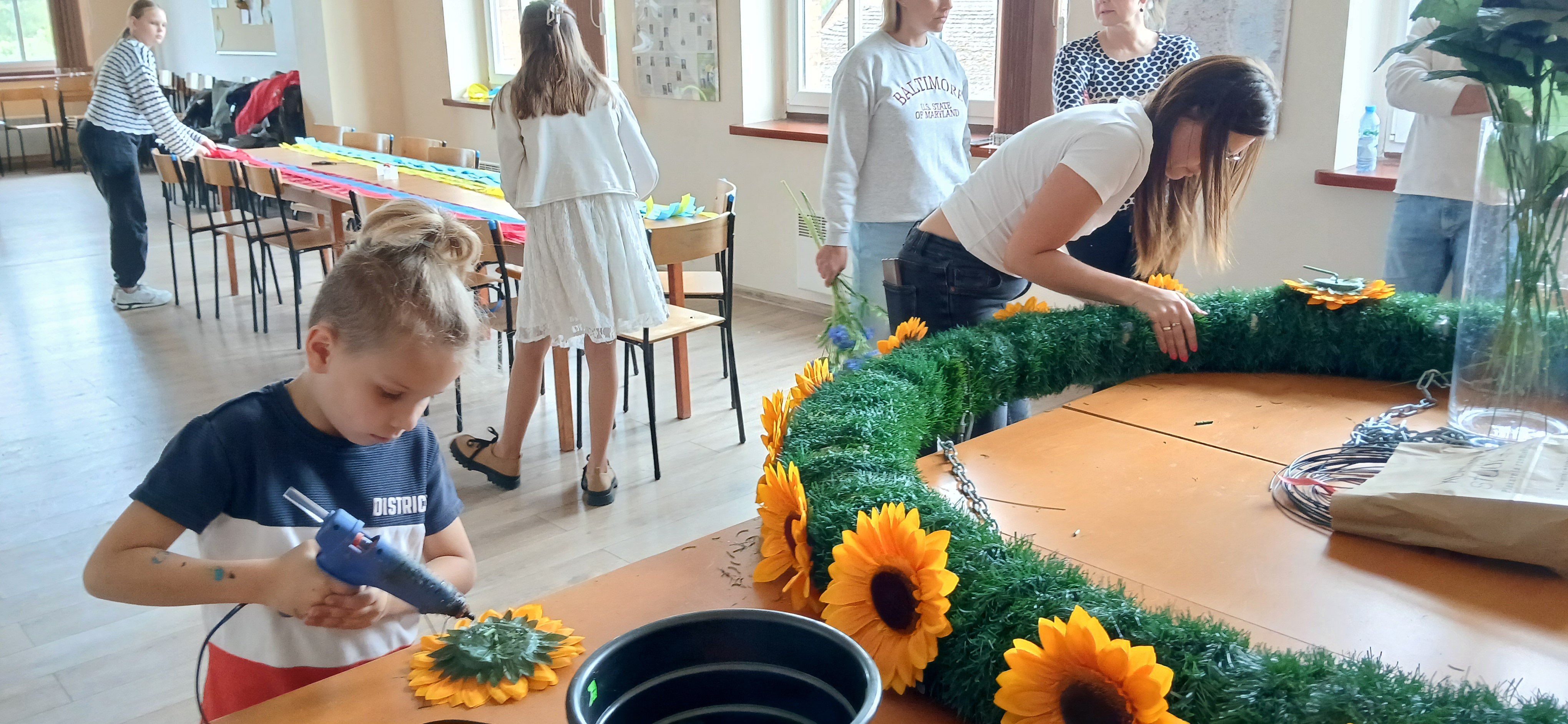 W poniedziałkowy wieczór dn.12 maja grupa dzieci wraz z rodzicami przyszła do świetlicy Starej Szkoły na warsztaty florystyczne zorganizowane przez koło DFK , które miały na celu odnowienie wieńca drzewka majowego. Florystka Katarzyna Sklorz przygotowała materiały, a dzieci z zapałem zabrały się do pracy. Pod okiem instruktorki cięły wstążki, kleiły kwiatki na wieniec, wyginały gałązki, wiązały kolorowe wstęgi i były bardzo zaangażowane w jego upiększanie. Przed zajęciami praktycznymi omówiły w języku polskim i niemieckim genezę drzewka majowego, poznały słownictwo z tym zwyczajem związane, a materiały edukacyjne mogły zabrać do domu. W trakcie zajęć dzieciaki posilały się kanapkami przygotowanymi przez panie Ilonę Feliks, Katarzynę Szubert i Sylwię Widawską. Na zakończenie uczestnicy warsztatów otrzymali słodkie upominki. Efekt prac był wspaniały, wieniec wygląda naprawdę imponująco. Dziękujemy dzieciom i rodzicom za zaangażowanie, Panu Marcinowi Konietzko za napisanie projektu z ramienia DFK, organizatorom warsztatów za wysprzątanie sali, zakupy i wykonanie paczek oraz Pani Katarzynie Sklorz za inspirowanie dzieci do działania. Członkowie Rady Sołeckiej i Sołtys byli zachwyceni wyglądem wieńca majowego. Warsztaty były dofinansowane ze środków Ministerstwa Spraw Wewnętrznych  i Ojczyzny Republiki Federalnej Niemiec za pośrednictwem Związku Niemieckich Stowarzyszeń Społeczno-Kulturalnych w Polsce.