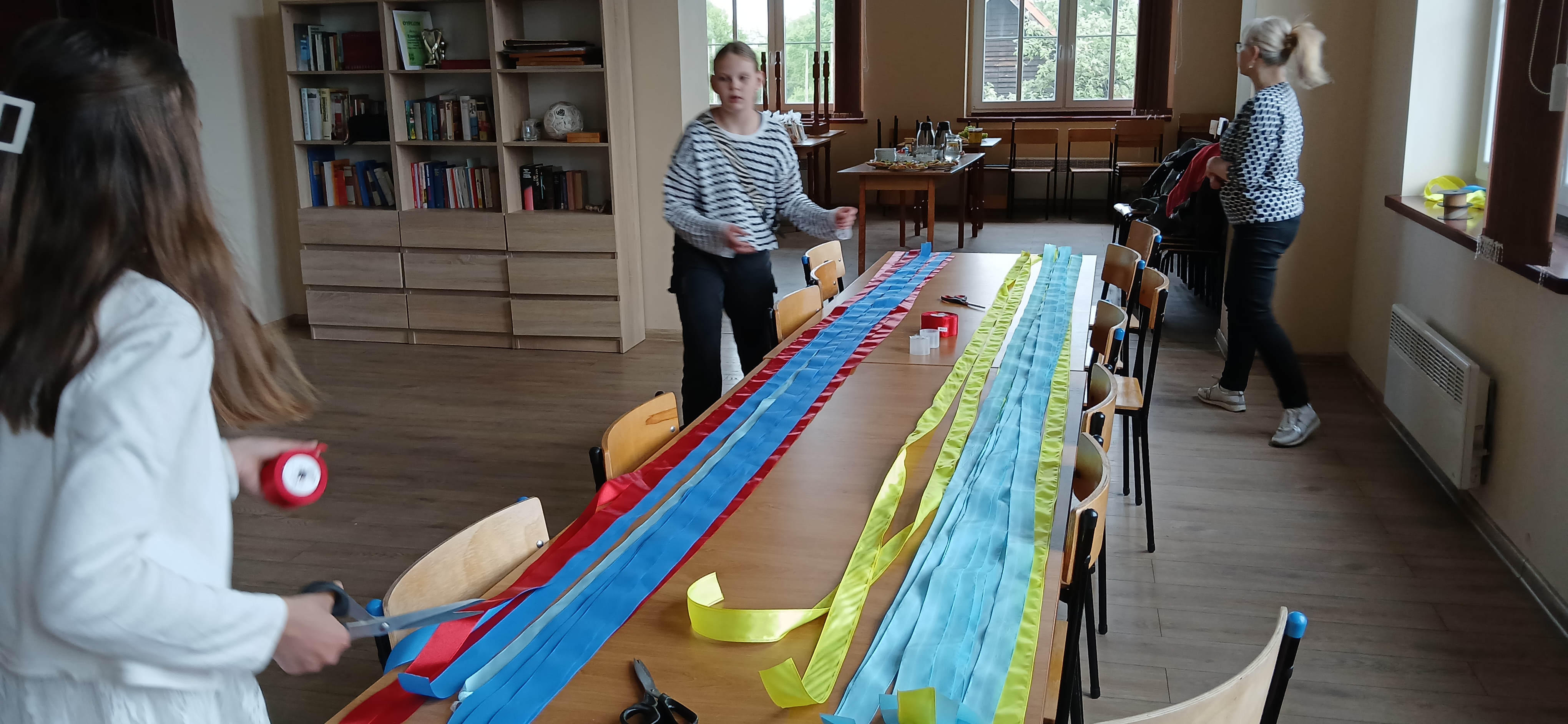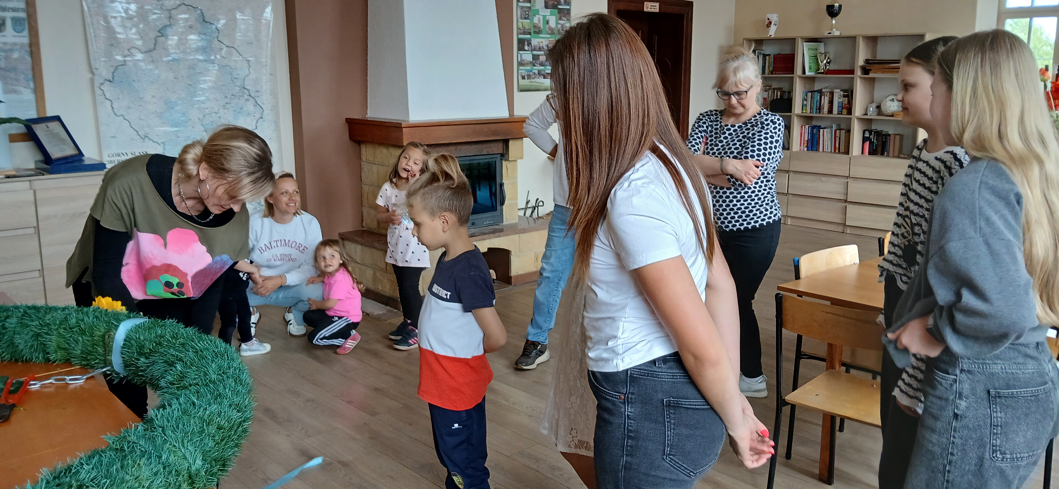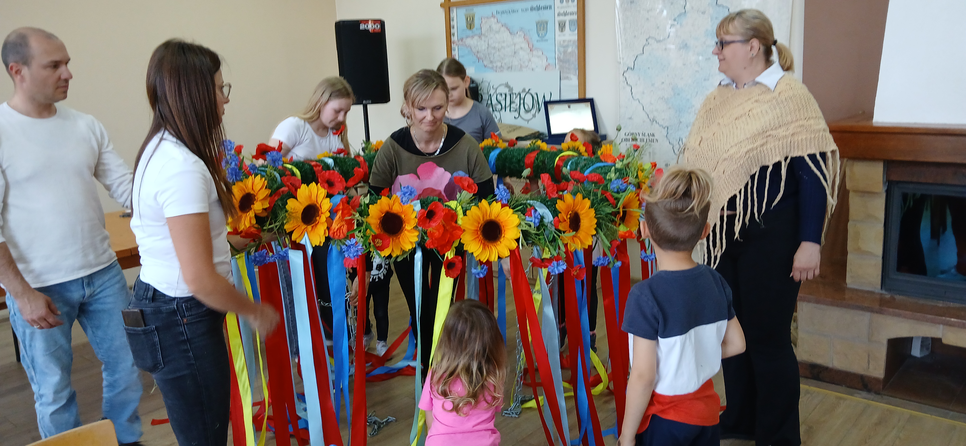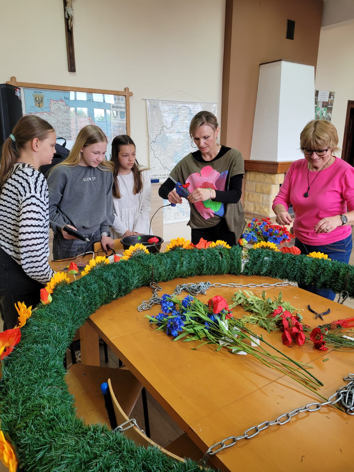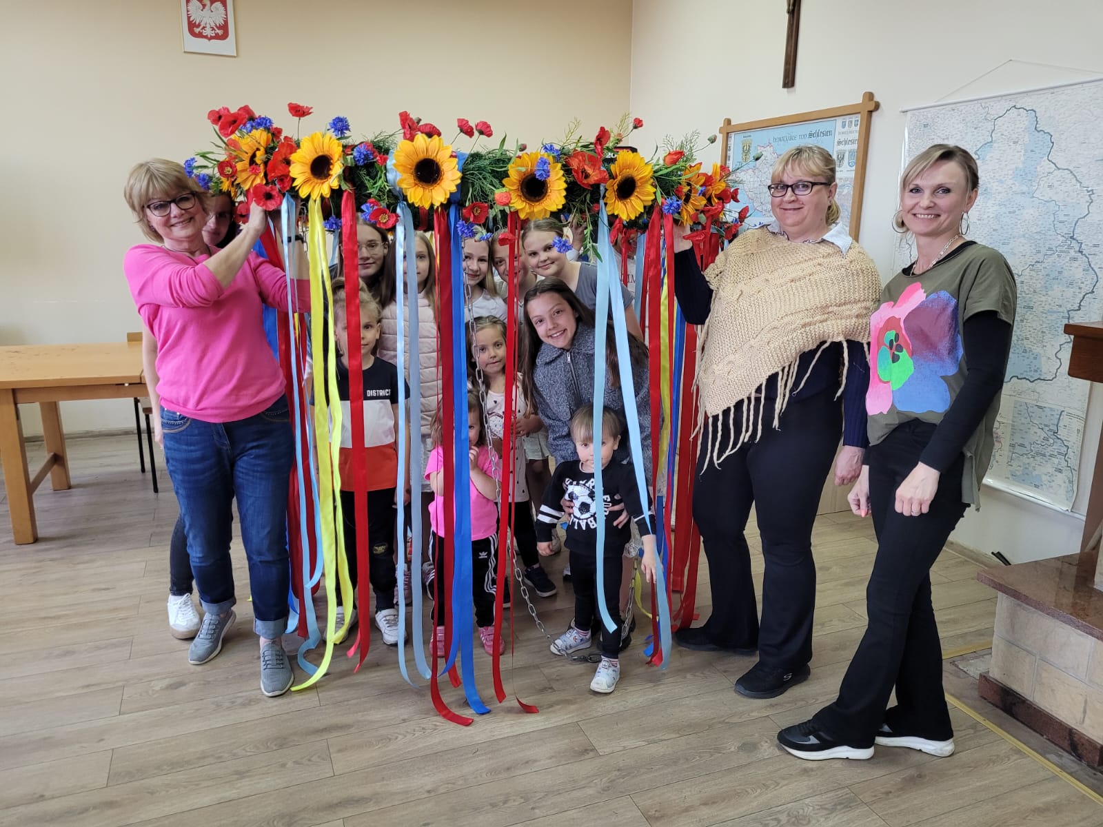 W poniedziałkowy wieczór dn.12 maja grupa dzieci wraz z rodzicami przyszła do świetlicy Starej Szkoły na warsztaty florystyczne zorganizowane przez koło DFK , które miały na celu odnowienie wieńca drzewka majowego. Florystka Katarzyna Sklorz przygotowała materiały, a dzieci z zapałem zabrały się do pracy. Pod okiem instruktorki cięły wstążki, kleiły kwiatki na wieniec, wyginały gałązki, wiązały kolorowe wstęgi i były bardzo zaangażowane w jego upiększanie. Przed zajęciami praktycznymi omówiły w języku polskim i niemieckim genezę drzewka majowego, poznały słownictwo z tym zwyczajem związane, a materiały edukacyjne mogły zabrać do domu. W trakcie zajęć dzieciaki posilały się kanapkami przygotowanymi przez panie Ilonę Feliks, Katarzynę Szubert i Sylwię Widawską. Na zakończenie uczestnicy warsztatów otrzymali słodkie upominki. Efekt prac był wspaniały, wieniec wygląda naprawdę imponująco. Dziękujemy dzieciom i rodzicom za zaangażowanie, Panu Marcinowi Konietzko za napisanie projektu z ramienia DFK, organizatorom warsztatów za wysprzątanie sali, zakupy i wykonanie paczek oraz Pani Katarzynie Sklorz za inspirowanie dzieci do działania. Członkowie Rady Sołeckiej i Sołtys byli zachwyceni wyglądem wieńca majowego. Warsztaty były dofinansowane ze środków Ministerstwa Spraw Wewnętrznych  i Ojczyzny Republiki Federalnej Niemiec za pośrednictwem Związku Niemieckich Stowarzyszeń Społeczno-Kulturalnych w Polsce.