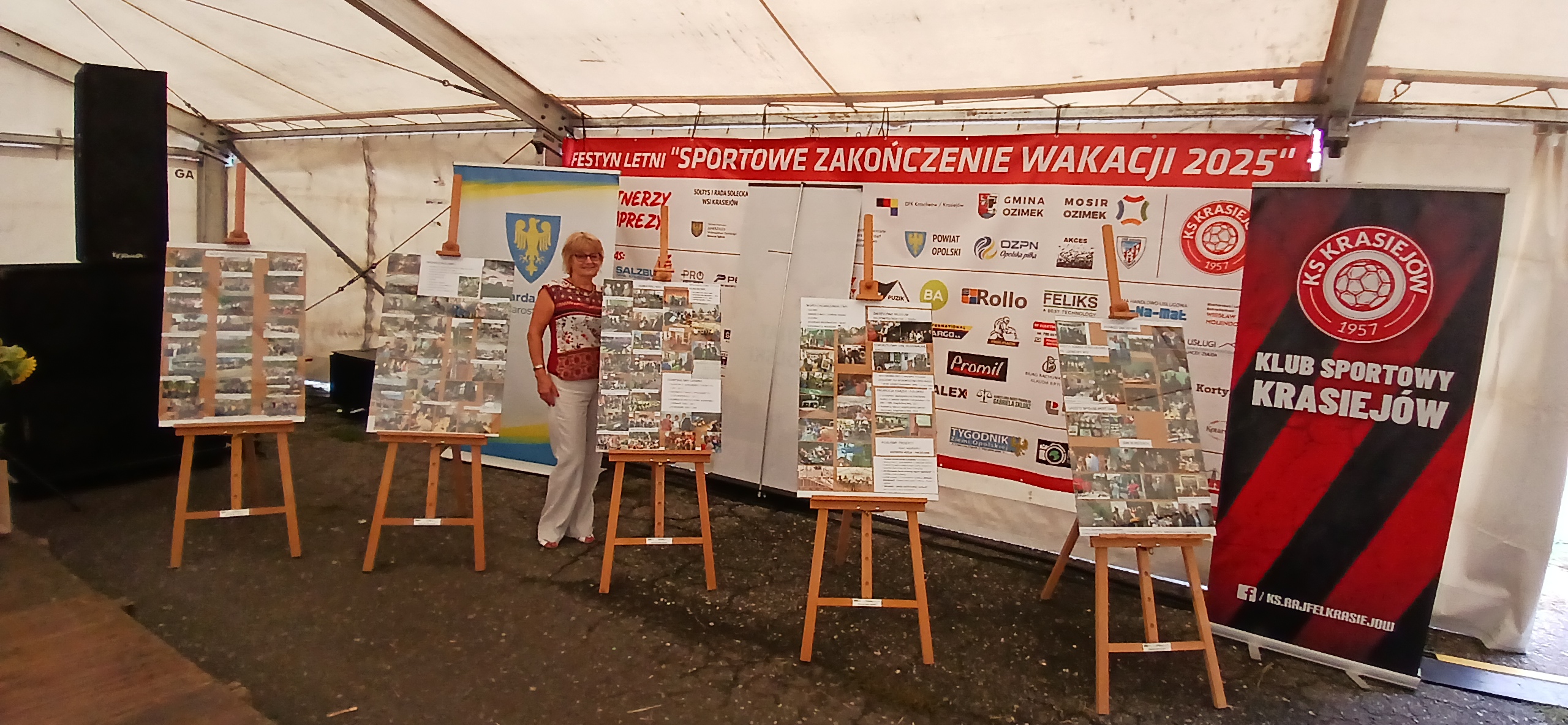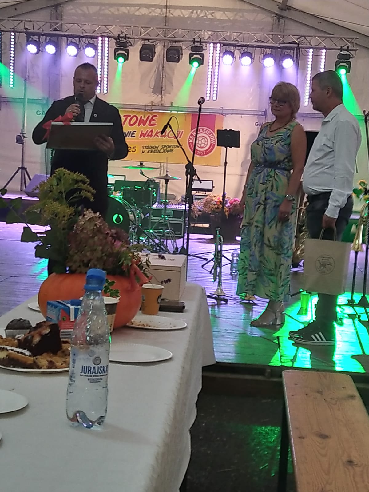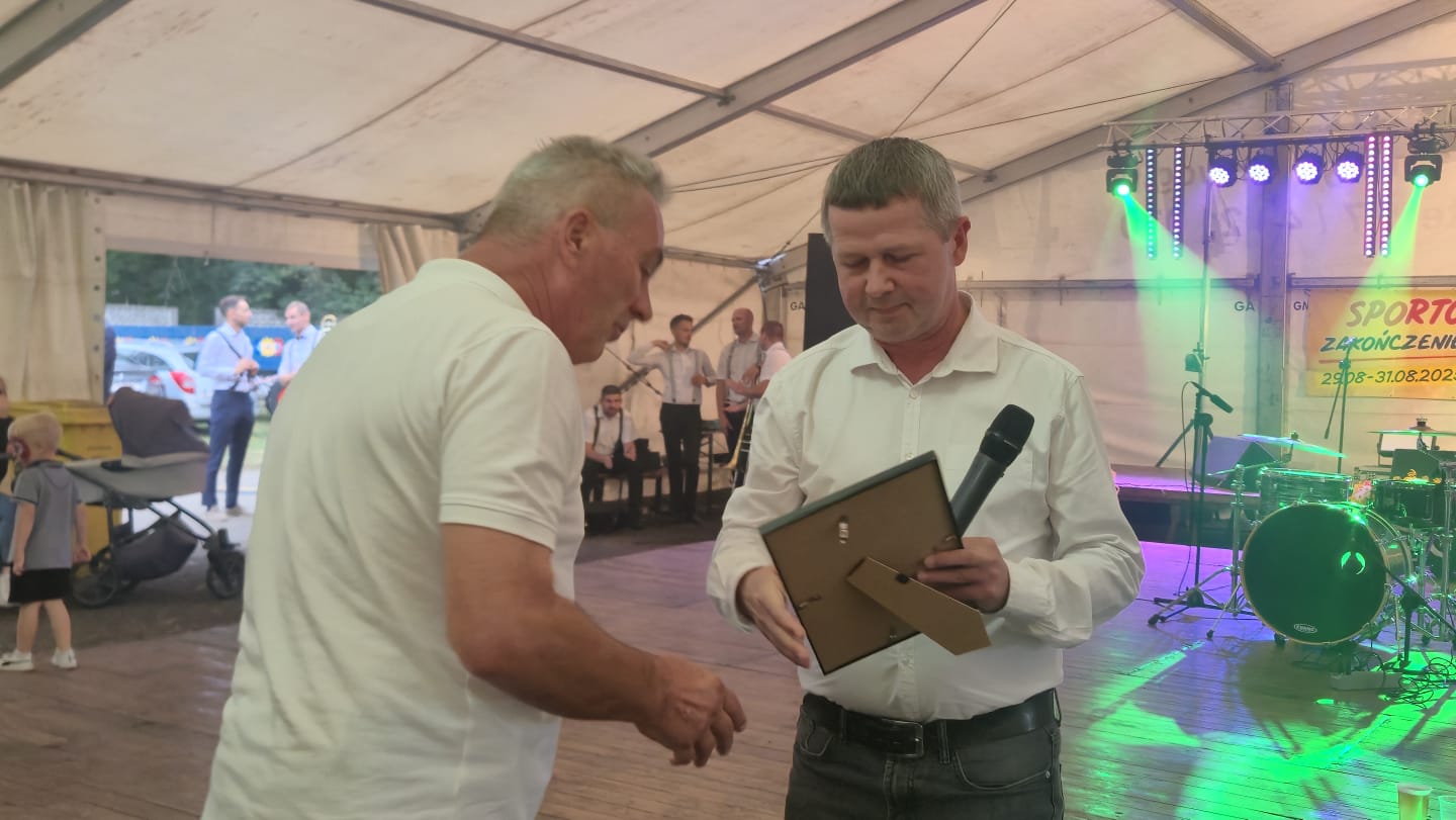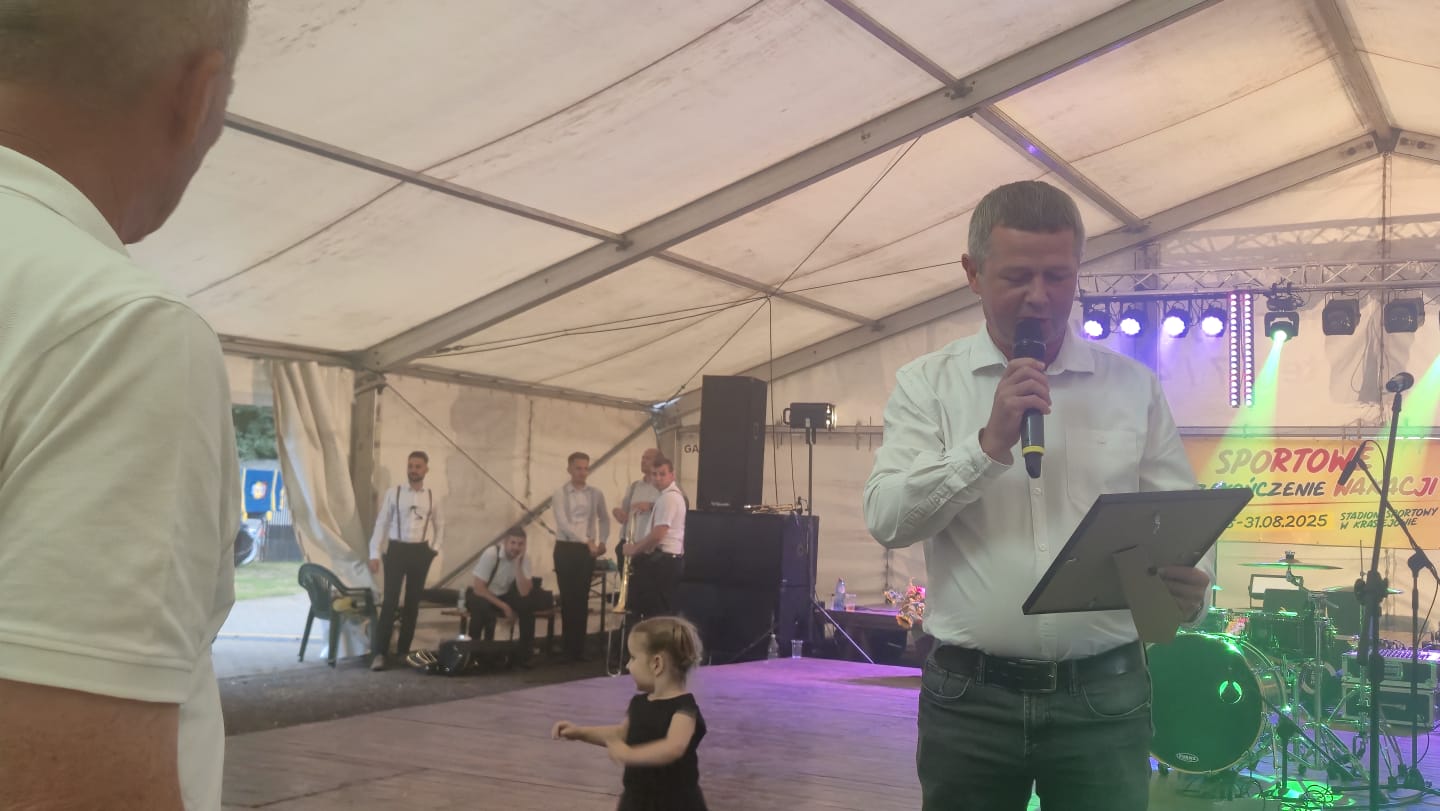 Ostatni dzień  "Sportowego Zakończenia Wakacji", który odbył się dn. 31 sierpnia obejmował cztery wydarzenia: Zawody jednostek OSP Gminy Ozimek i zaprzyjaźnionego Heinsberga, święto 25-lecia Stowarzyszenia Miłośników Krasiejowa, występy artystyczne i zabawę taneczną. O zawodach strażackich piszemy w odzielnym poście, bo tam działo się naprawdę dużo. Popołudnie zaczęło się pod namiotem o godz. 15.30 występem Młodzieżowej Orkiestry Dętej z Gminy Chrząstowice. Młodzi muzycy zaprezentowali się wspaniale wzbudzając aplauz wśród słuchaczy. Po godzinnym koncercie na scenie pojawilła się Mirosława Drozd - Duda z żywiołowym koncertem związanym tematycznie z końcem lata. Zdziwiła się nieco, gdy na parkiecie pojawił się olbrzymi niedżwiedź polarny, bo artystka nie wiedziała, że nasz dinozaur jest w renowacji. A zwierzę z dalekiej północy do Krasiejowa zagnała zwykla ciekawość. Po pięknym występie konferansjer tego dnia - Krzysztof Koźlik poprosił Sylwię Widawską - sekretarza organizacji i kustosza Muzeum Paleontologicznego o podsumowanie 25-letniej działalności SMK. Odrębne sprawozdanie ukaże się niebawem na stronie wsi. Po wygłoszeniu przemówienia wręczono koszulki z logiem SMK członkom, którzy w tej organizacji działają już 25 lat, a należą do nich: Krzysztof Koźlik, Werner Klimek, Sylwia, Widawska, Arnold Bolcek, Jan Sklorz, Ryszard Skrzypczyk, Andrzej Staś i Zygmunt Wystarch. Ponadto wyróżniono  Lidię Schroll,  Magdalenę Moj, Jana Bonka, Michała Malisza i Ryszarda Gallę - honorowego członka SMK. Specjalne podziękowania z okolicznościowymi dyplomami skierowano na ręce Burmistrza Ozimka Mirosława Wieszołka i Anny Golec - Prezes LGD Kraina Dinozaurów za wspieranie działalności statutowej SMK  oraz dla Wernera Klimka- organizatora wycieczek krajoznawczych. Po wręczeniu pamiątek głos zabrał przybyły na festyn zastępca Burmistrza Marcin Widera. Złożył na ręce prezesa SMK i kustosz Muzeum wyrazy uznania za dotychczasowe działania i osiągnięcia życząc dalszej owocnej pracy. Podziękowania napłynęły też ze strony prezes LGD - Anny Golec.