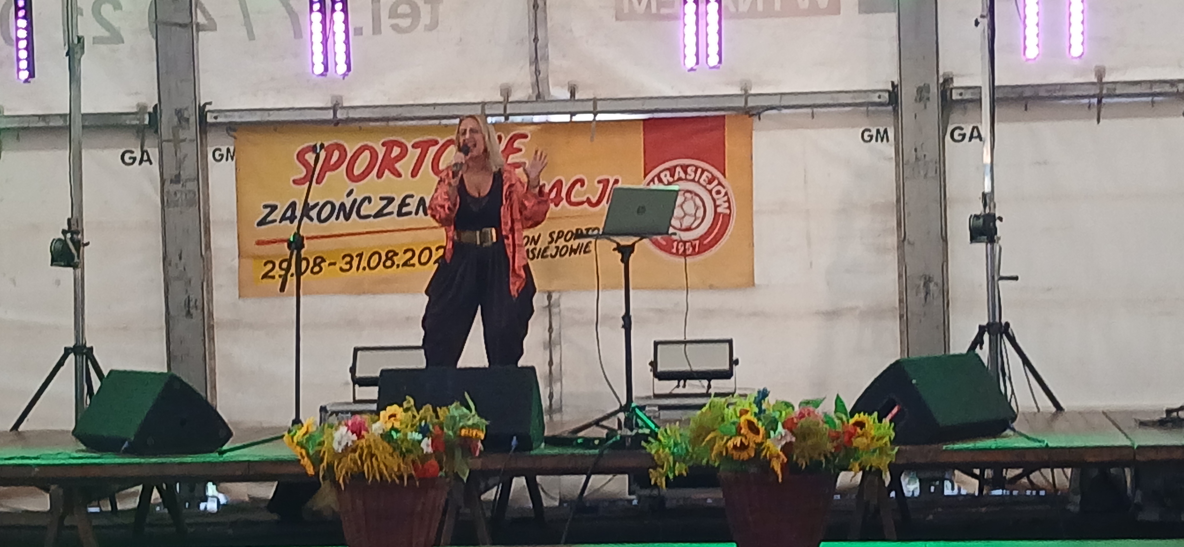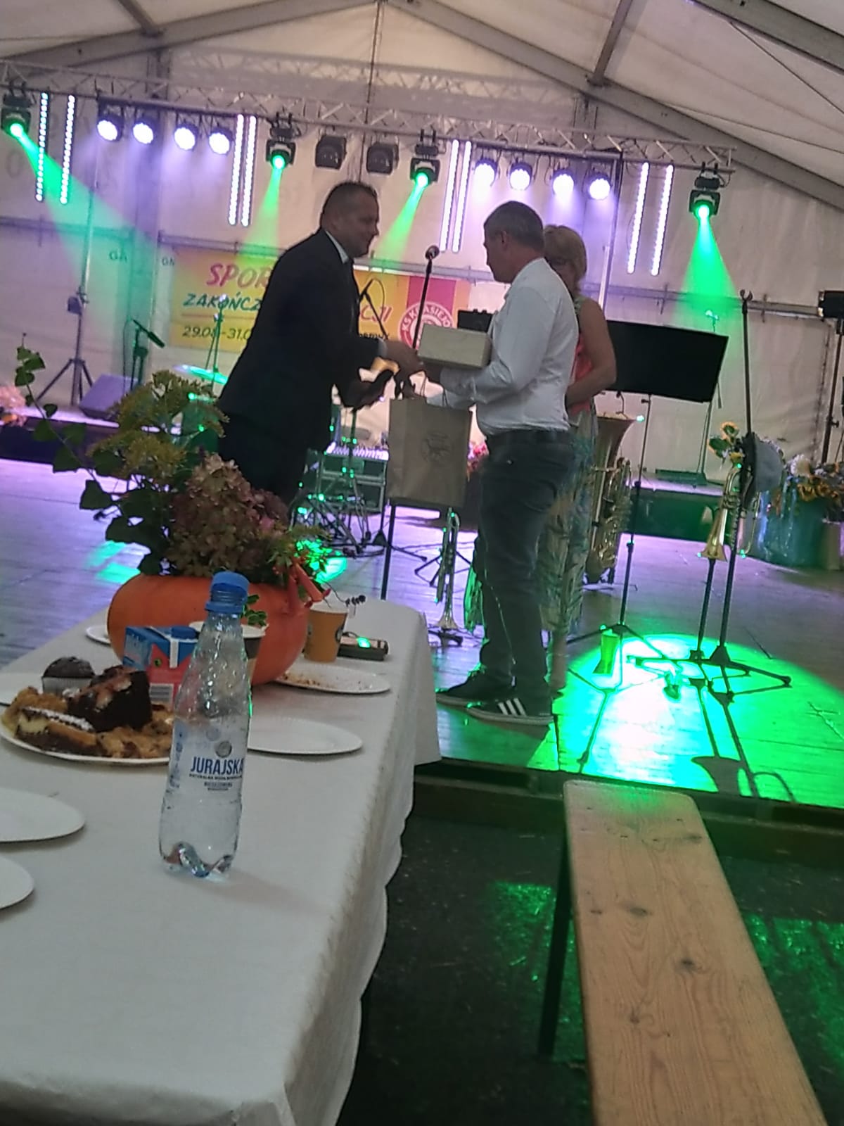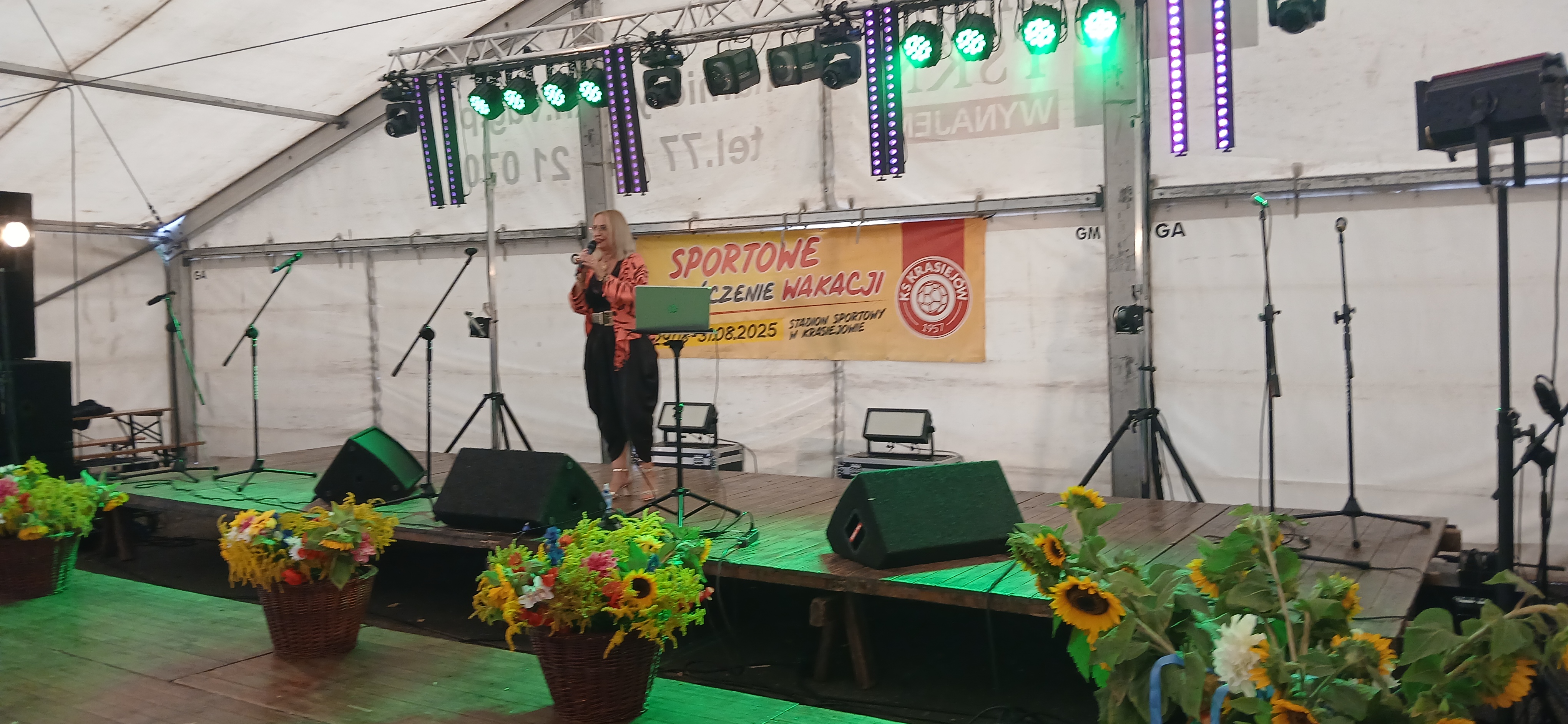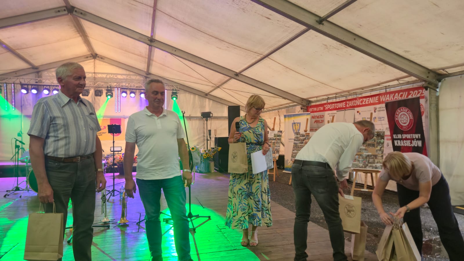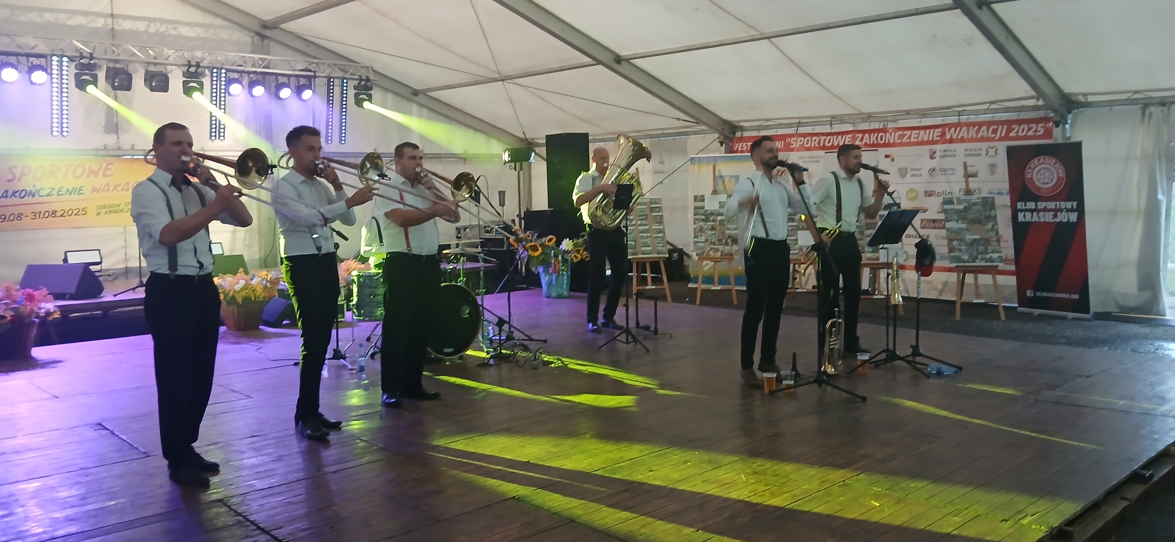 Ostatni dzień  "Sportowego Zakończenia Wakacji", który odbył się dn. 31 sierpnia obejmował cztery wydarzenia: Zawody jednostek OSP Gminy Ozimek i zaprzyjaźnionego Heinsberga, święto 25-lecia Stowarzyszenia Miłośników Krasiejowa, występy artystyczne i zabawę taneczną. O zawodach strażackich piszemy w odzielnym poście, bo tam działo się naprawdę dużo. Popołudnie zaczęło się pod namiotem o godz. 15.30 występem Młodzieżowej Orkiestry Dętej z Gminy Chrząstowice. Młodzi muzycy zaprezentowali się wspaniale wzbudzając aplauz wśród słuchaczy. Po godzinnym koncercie na scenie pojawilła się Mirosława Drozd - Duda z żywiołowym koncertem związanym tematycznie z końcem lata. Zdziwiła się nieco, gdy na parkiecie pojawił się olbrzymi niedżwiedź polarny, bo artystka nie wiedziała, że nasz dinozaur jest w renowacji. A zwierzę z dalekiej północy do Krasiejowa zagnała zwykla ciekawość. Po pięknym występie konferansjer tego dnia - Krzysztof Koźlik poprosił Sylwię Widawską - sekretarza organizacji i kustosza Muzeum Paleontologicznego o podsumowanie 25-letniej działalności SMK. Odrębne sprawozdanie ukaże się niebawem na stronie wsi. Po wygłoszeniu przemówienia wręczono koszulki z logiem SMK członkom, którzy w tej organizacji działają już 25 lat, a należą do nich: Krzysztof Koźlik, Werner Klimek, Sylwia, Widawska, Arnold Bolcek, Jan Sklorz, Ryszard Skrzypczyk, Andrzej Staś i Zygmunt Wystarch. Ponadto wyróżniono  Lidię Schroll,  Magdalenę Moj, Jana Bonka, Michała Malisza i Ryszarda Gallę - honorowego członka SMK. Specjalne podziękowania z okolicznościowymi dyplomami skierowano na ręce Burmistrza Ozimka Mirosława Wieszołka i Anny Golec - Prezes LGD Kraina Dinozaurów za wspieranie działalności statutowej SMK  oraz dla Wernera Klimka- organizatora wycieczek krajoznawczych. Po wręczeniu pamiątek głos zabrał przybyły na festyn zastępca Burmistrza Marcin Widera. Złożył na ręce prezesa SMK i kustosz Muzeum wyrazy uznania za dotychczasowe działania i osiągnięcia życząc dalszej owocnej pracy. Podziękowania napłynęły też ze strony prezes LGD - Anny Golec.