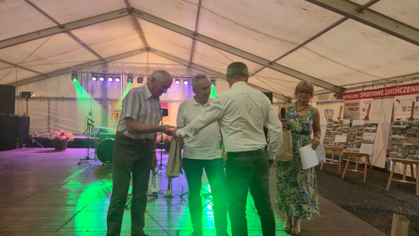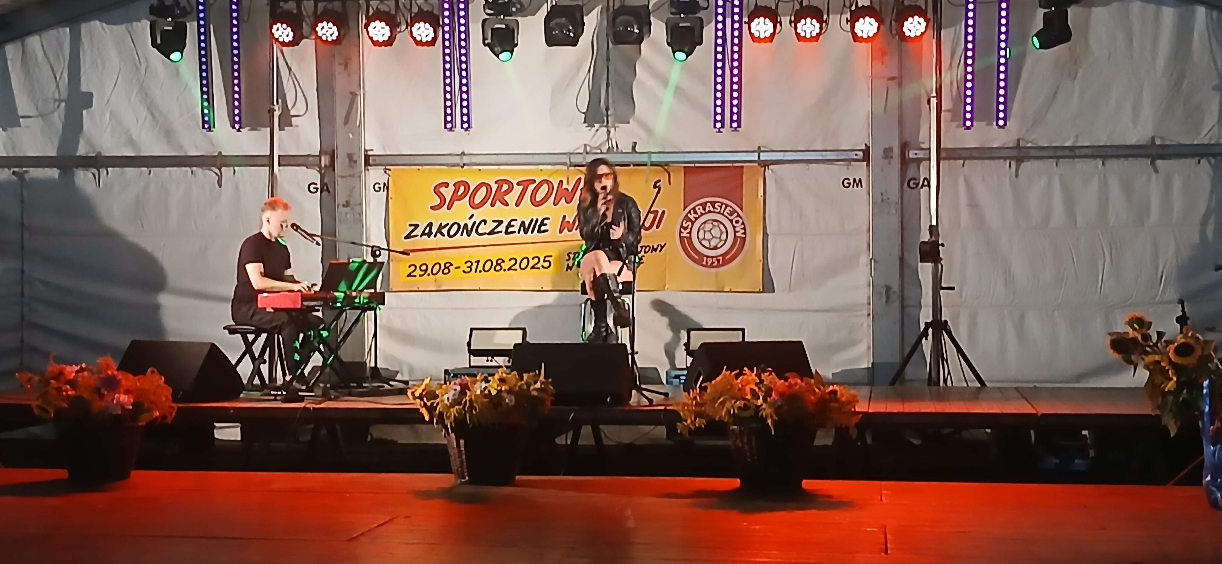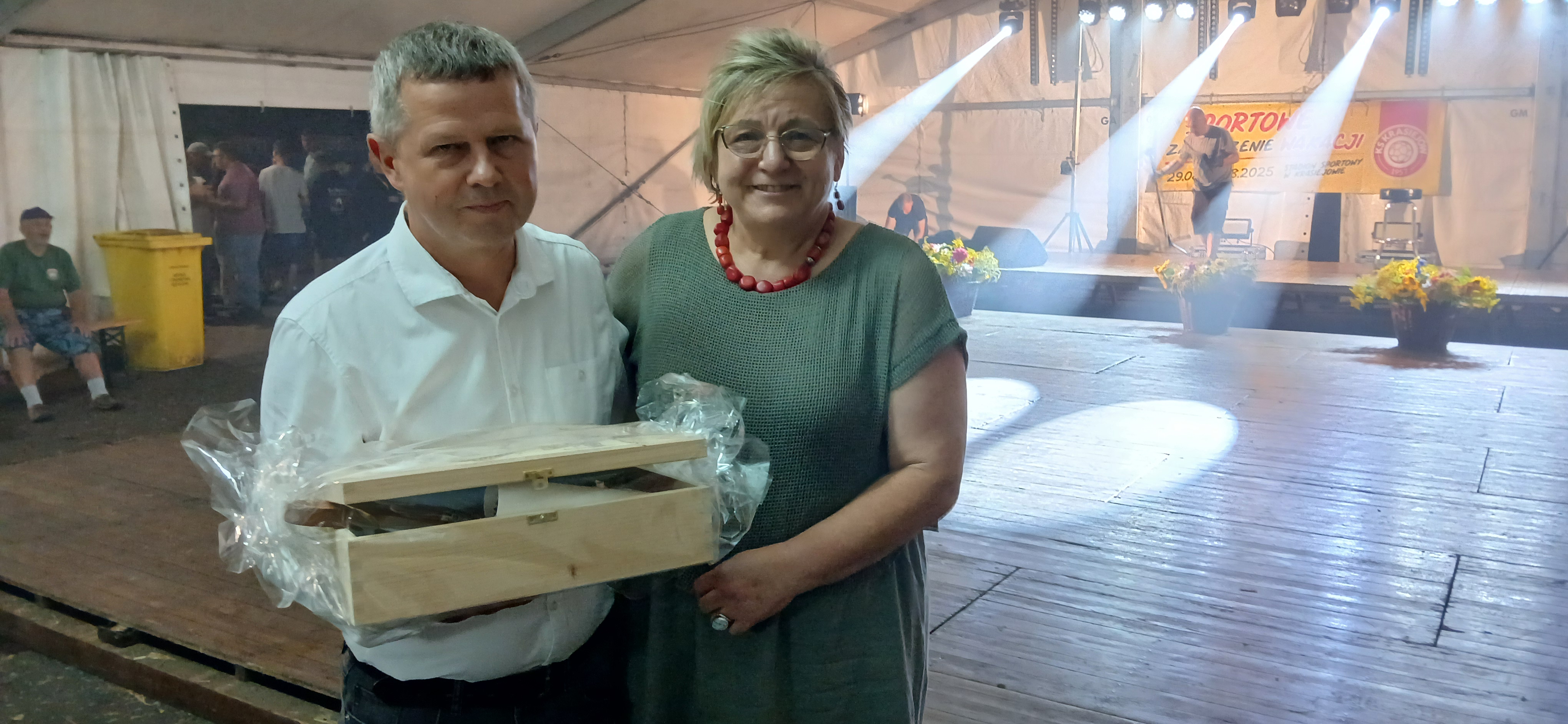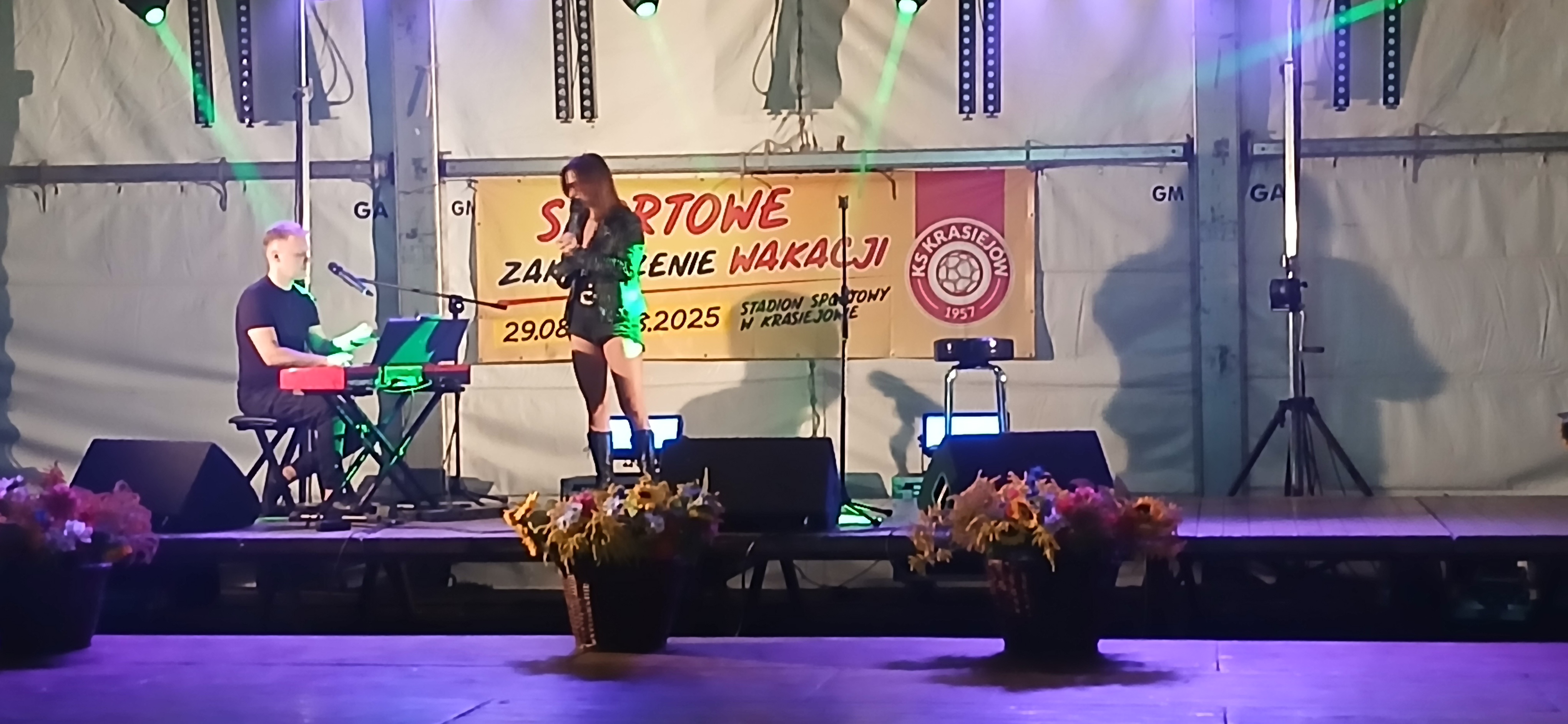 Ostatni dzień  "Sportowego Zakończenia Wakacji", który odbył się dn. 31 sierpnia obejmował cztery wydarzenia: Zawody jednostek OSP Gminy Ozimek i zaprzyjaźnionego Heinsberga, święto 25-lecia Stowarzyszenia Miłośników Krasiejowa, występy artystyczne i zabawę taneczną. O zawodach strażackich piszemy w odzielnym poście, bo tam działo się naprawdę dużo. Popołudnie zaczęło się pod namiotem o godz. 15.30 występem Młodzieżowej Orkiestry Dętej z Gminy Chrząstowice. Młodzi muzycy zaprezentowali się wspaniale wzbudzając aplauz wśród słuchaczy. Po godzinnym koncercie na scenie pojawilła się Mirosława Drozd - Duda z żywiołowym koncertem związanym tematycznie z końcem lata. Zdziwiła się nieco, gdy na parkiecie pojawił się olbrzymi niedżwiedź polarny, bo artystka nie wiedziała, że nasz dinozaur jest w renowacji. A zwierzę z dalekiej północy do Krasiejowa zagnała zwykla ciekawość. Po pięknym występie konferansjer tego dnia - Krzysztof Koźlik poprosił Sylwię Widawską - sekretarza organizacji i kustosza Muzeum Paleontologicznego o podsumowanie 25-letniej działalności SMK. Odrębne sprawozdanie ukaże się niebawem na stronie wsi. Po wygłoszeniu przemówienia wręczono koszulki z logiem SMK członkom, którzy w tej organizacji działają już 25 lat, a należą do nich: Krzysztof Koźlik, Werner Klimek, Sylwia, Widawska, Arnold Bolcek, Jan Sklorz, Ryszard Skrzypczyk, Andrzej Staś i Zygmunt Wystarch. Ponadto wyróżniono  Lidię Schroll,  Magdalenę Moj, Jana Bonka, Michała Malisza i Ryszarda Gallę - honorowego członka SMK. Specjalne podziękowania z okolicznościowymi dyplomami skierowano na ręce Burmistrza Ozimka Mirosława Wieszołka i Anny Golec - Prezes LGD Kraina Dinozaurów za wspieranie działalności statutowej SMK  oraz dla Wernera Klimka- organizatora wycieczek krajoznawczych. Po wręczeniu pamiątek głos zabrał przybyły na festyn zastępca Burmistrza Marcin Widera. Złożył na ręce prezesa SMK i kustosz Muzeum wyrazy uznania za dotychczasowe działania i osiągnięcia życząc dalszej owocnej pracy. Podziękowania napłynęły też ze strony prezes LGD - Anny Golec.