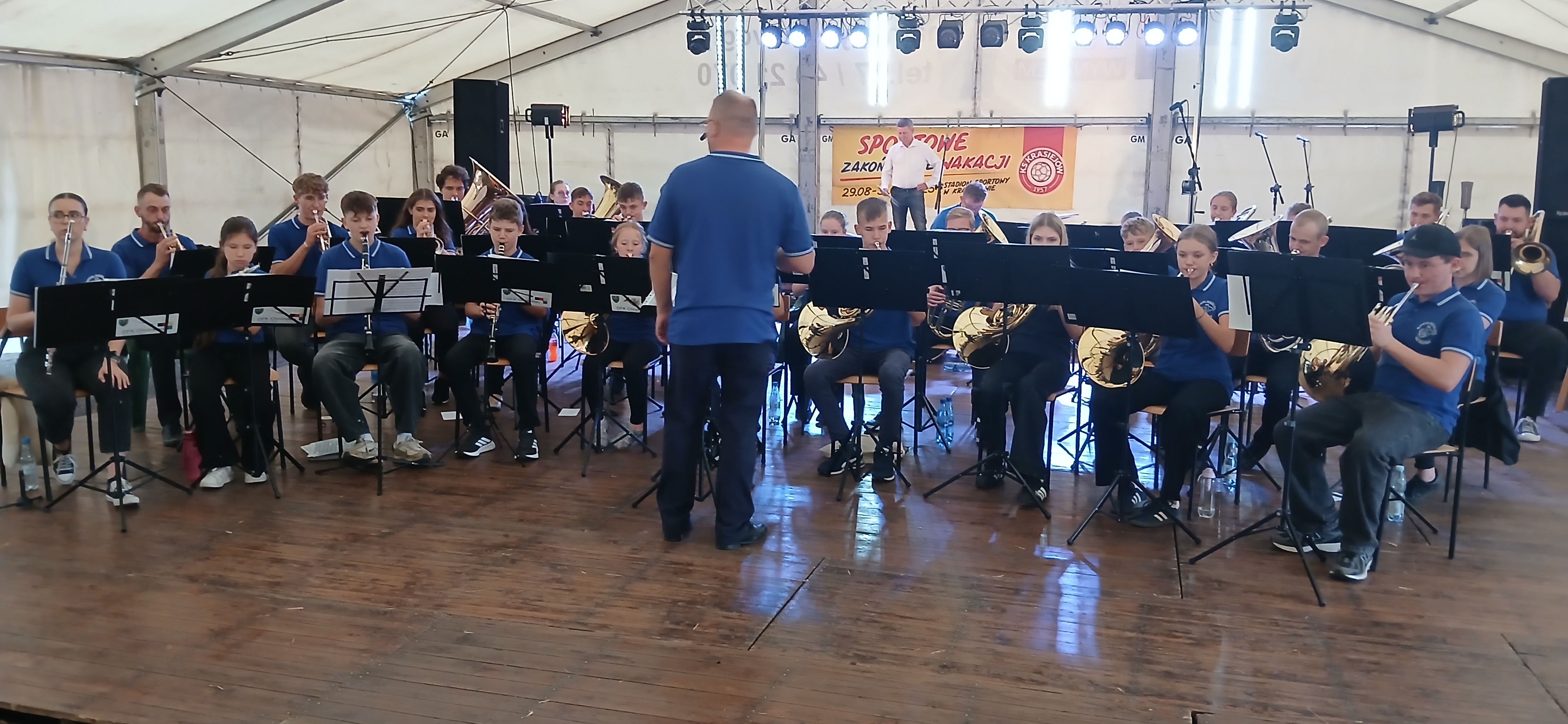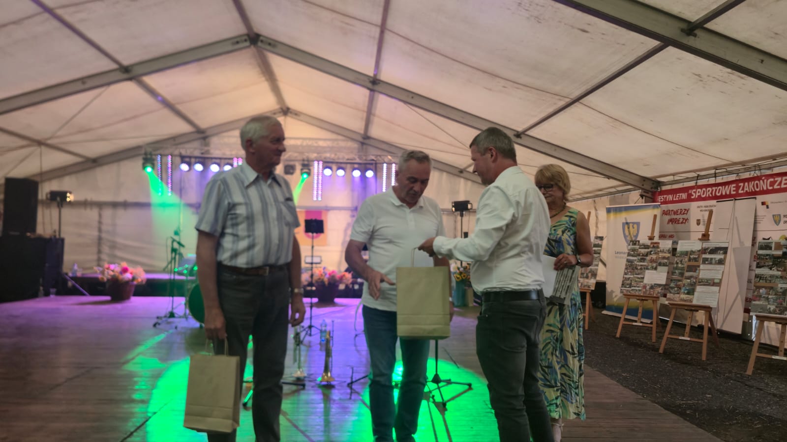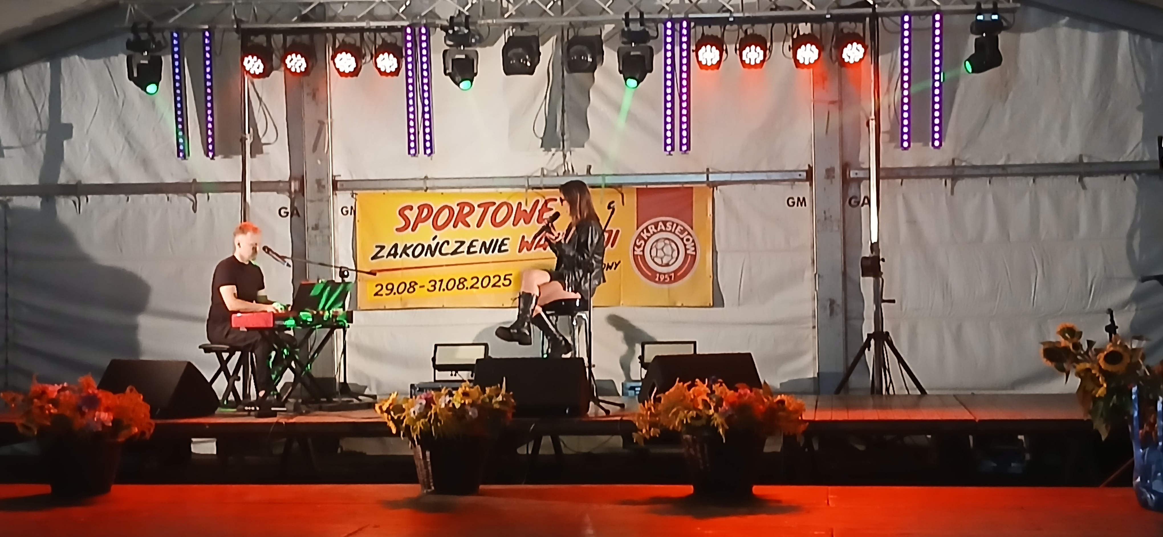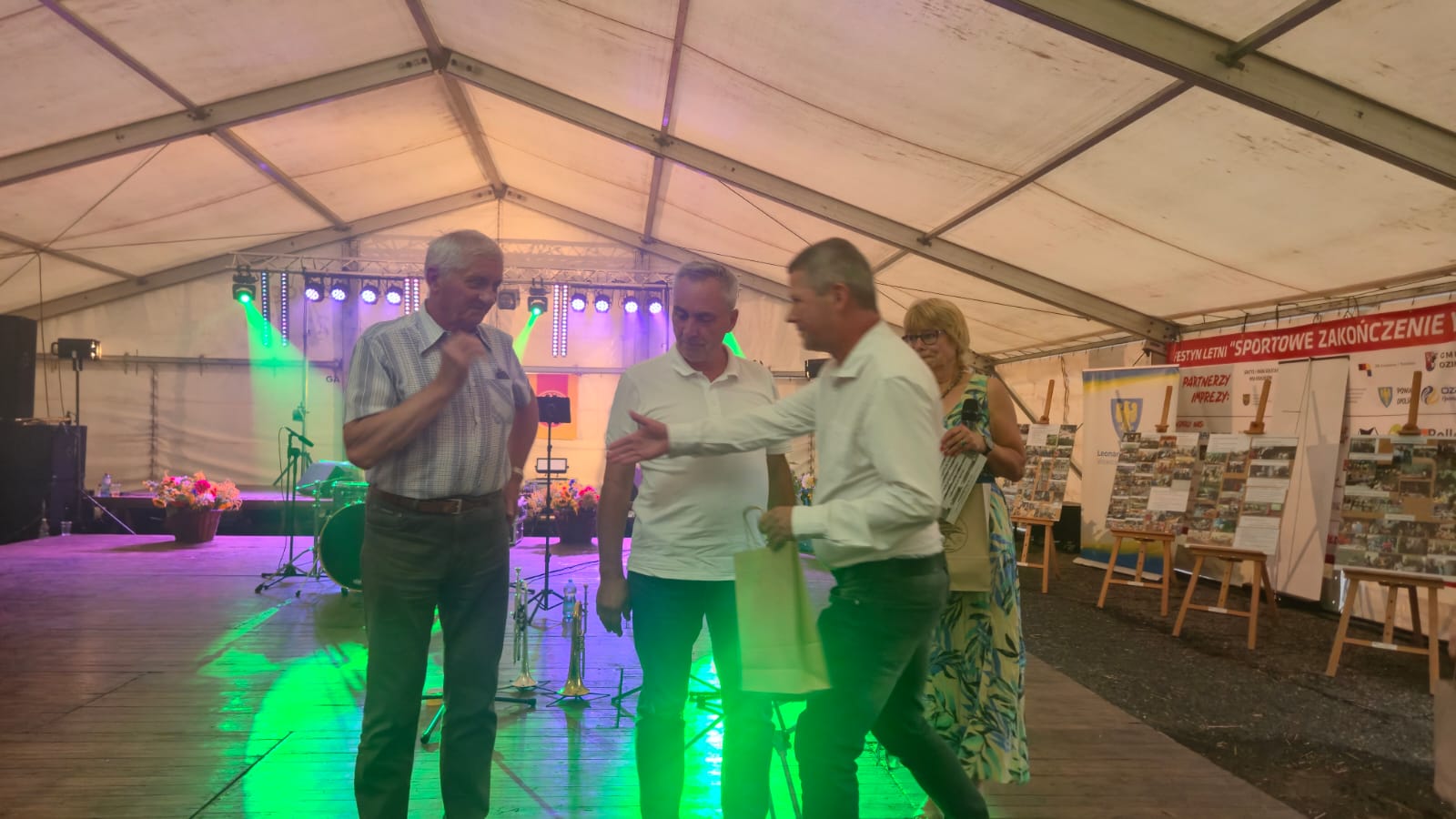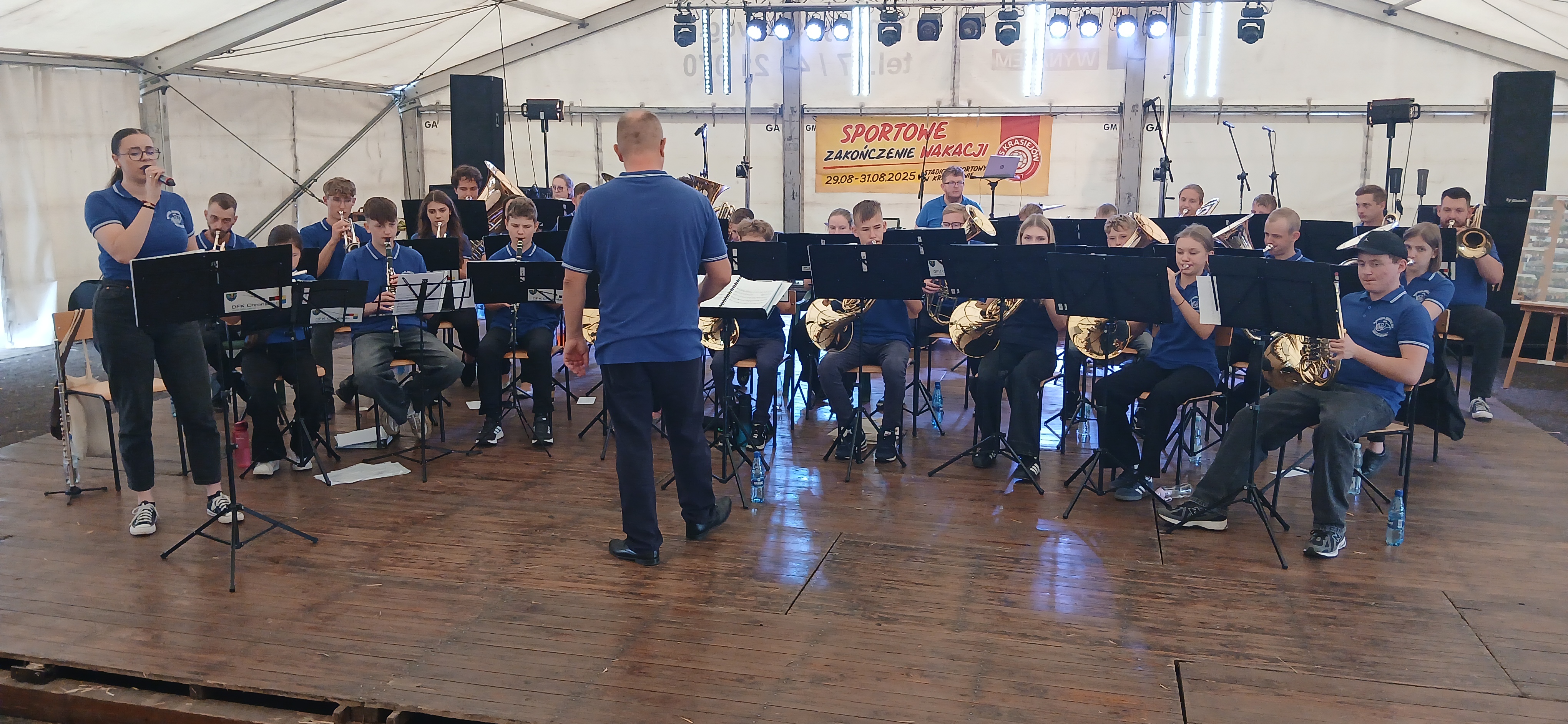 Ostatni dzień  "Sportowego Zakończenia Wakacji", który odbył się dn. 31 sierpnia obejmował cztery wydarzenia: Zawody jednostek OSP Gminy Ozimek i zaprzyjaźnionego Heinsberga, święto 25-lecia Stowarzyszenia Miłośników Krasiejowa, występy artystyczne i zabawę taneczną. O zawodach strażackich piszemy w odzielnym poście, bo tam działo się naprawdę dużo. Popołudnie zaczęło się pod namiotem o godz. 15.30 występem Młodzieżowej Orkiestry Dętej z Gminy Chrząstowice. Młodzi muzycy zaprezentowali się wspaniale wzbudzając aplauz wśród słuchaczy. Po godzinnym koncercie na scenie pojawilła się Mirosława Drozd - Duda z żywiołowym koncertem związanym tematycznie z końcem lata. Zdziwiła się nieco, gdy na parkiecie pojawił się olbrzymi niedżwiedź polarny, bo artystka nie wiedziała, że nasz dinozaur jest w renowacji. A zwierzę z dalekiej północy do Krasiejowa zagnała zwykla ciekawość. Po pięknym występie konferansjer tego dnia - Krzysztof Koźlik poprosił Sylwię Widawską - sekretarza organizacji i kustosza Muzeum Paleontologicznego o podsumowanie 25-letniej działalności SMK. Odrębne sprawozdanie ukaże się niebawem na stronie wsi. Po wygłoszeniu przemówienia wręczono koszulki z logiem SMK członkom, którzy w tej organizacji działają już 25 lat, a należą do nich: Krzysztof Koźlik, Werner Klimek, Sylwia, Widawska, Arnold Bolcek, Jan Sklorz, Ryszard Skrzypczyk, Andrzej Staś i Zygmunt Wystarch. Ponadto wyróżniono  Lidię Schroll,  Magdalenę Moj, Jana Bonka, Michała Malisza i Ryszarda Gallę - honorowego członka SMK. Specjalne podziękowania z okolicznościowymi dyplomami skierowano na ręce Burmistrza Ozimka Mirosława Wieszołka i Anny Golec - Prezes LGD Kraina Dinozaurów za wspieranie działalności statutowej SMK  oraz dla Wernera Klimka- organizatora wycieczek krajoznawczych. Po wręczeniu pamiątek głos zabrał przybyły na festyn zastępca Burmistrza Marcin Widera. Złożył na ręce prezesa SMK i kustosz Muzeum wyrazy uznania za dotychczasowe działania i osiągnięcia życząc dalszej owocnej pracy. Podziękowania napłynęły też ze strony prezes LGD - Anny Golec.