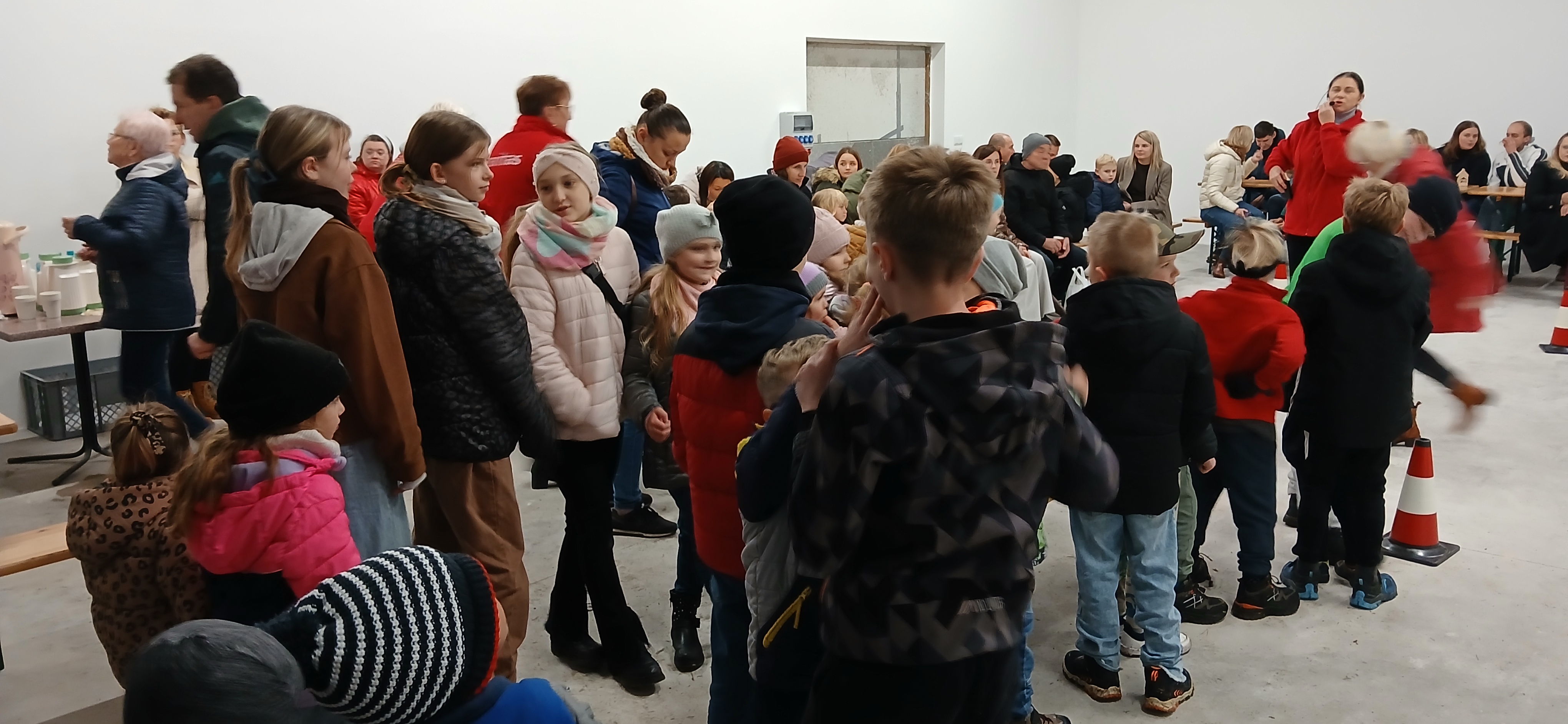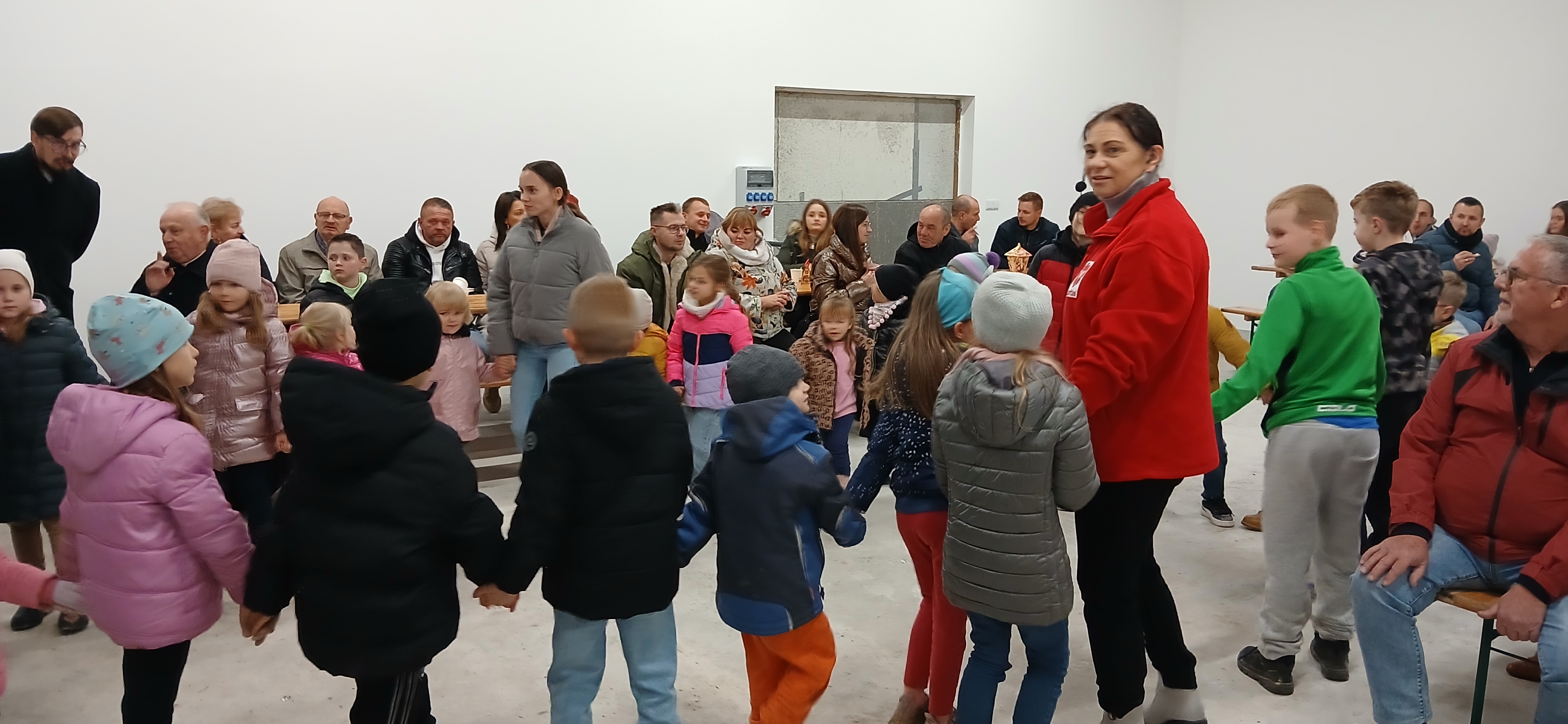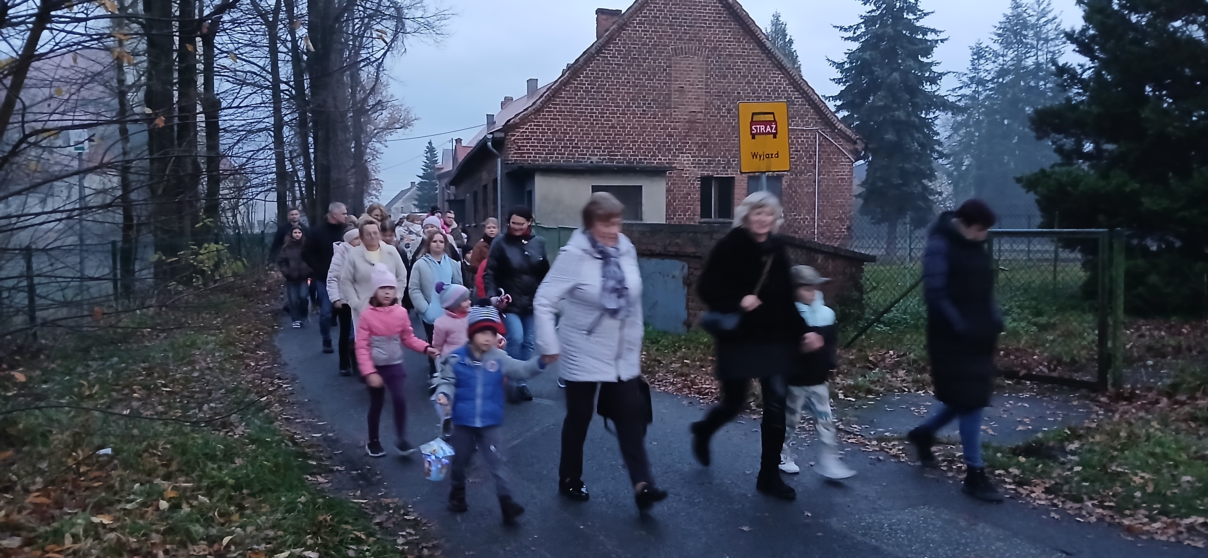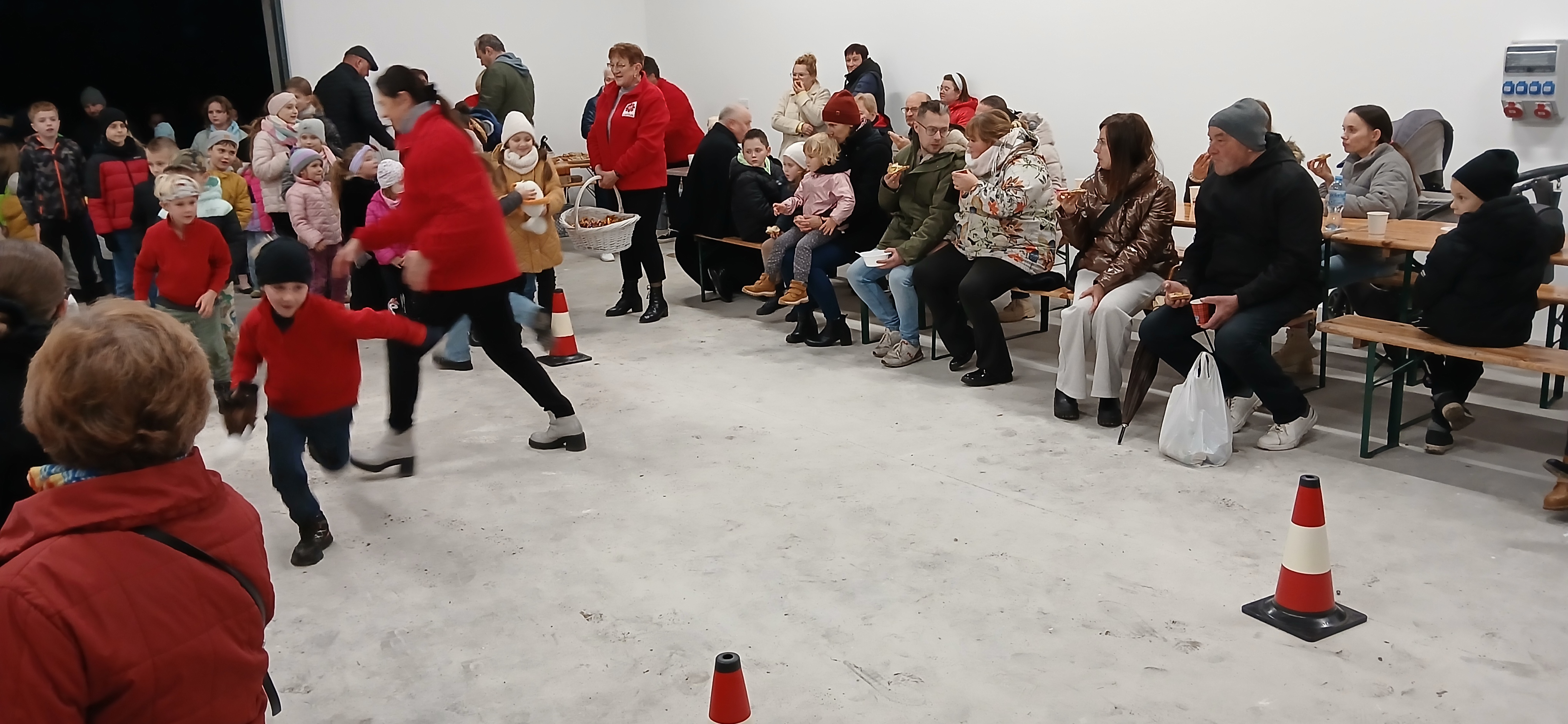 Pani Ewa Kotysz zaopiekowała się wspaniale dziećmi prowadząc przeróżne ciekawe animacje związane z życiem Św. Marcina. W tym celu wykorzystała przygotowane wcześniej eksponaty gąski, koniki, szyszki, no i oczywiście duży wiklinowy kosz z cukierkami, które cieszyły się ogromnym powodzeniem wśrod dzieci. Oprócz zabaw sprawnościowych odbył się konkurs wiedzy o życiu i szlachetnych czynach św. Marcina. Były też tańce- słynna skoczna belgijka i taniec z latarenkami. Do zabawy z dziećmi zaangażowała się również Pani Teresa Wrześniowska. Podczas, gdy Pani Irena Kostka częstowała gości kromkami chleba ze smalcem i rozdawała rogale, pozostałe Panie Edyta Wer, Karina Kaczmarczyk i Gizela Palus częstowały zebranych żurkiem, kawą i herbatą.