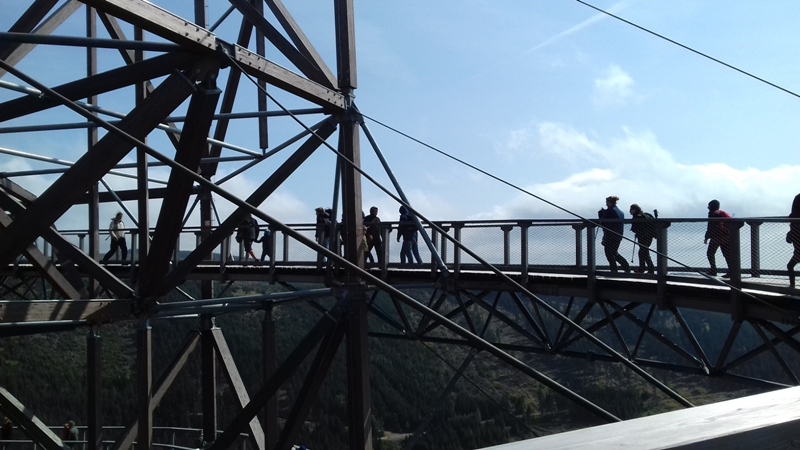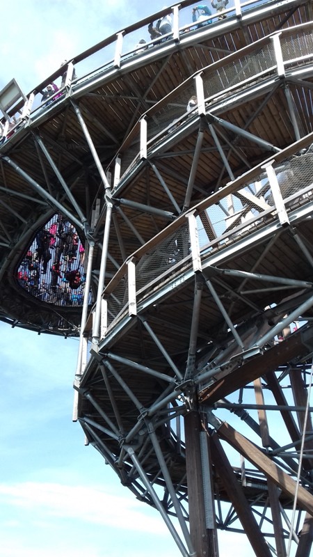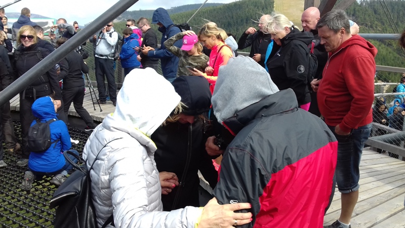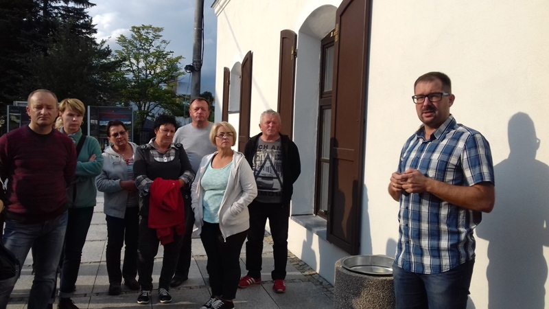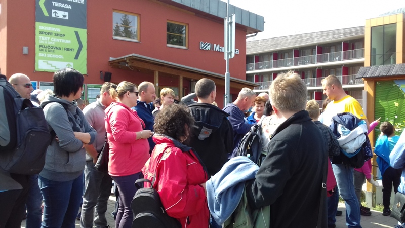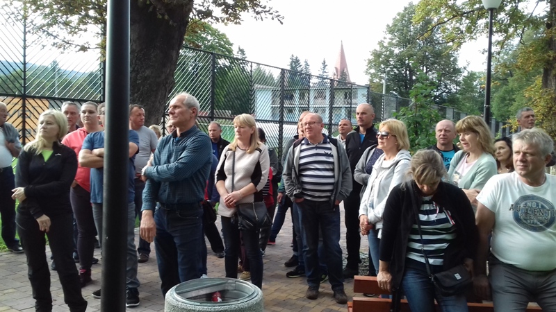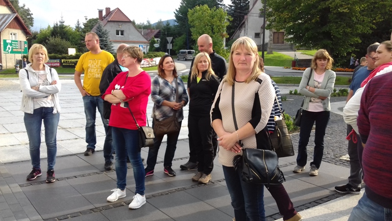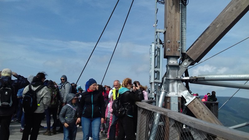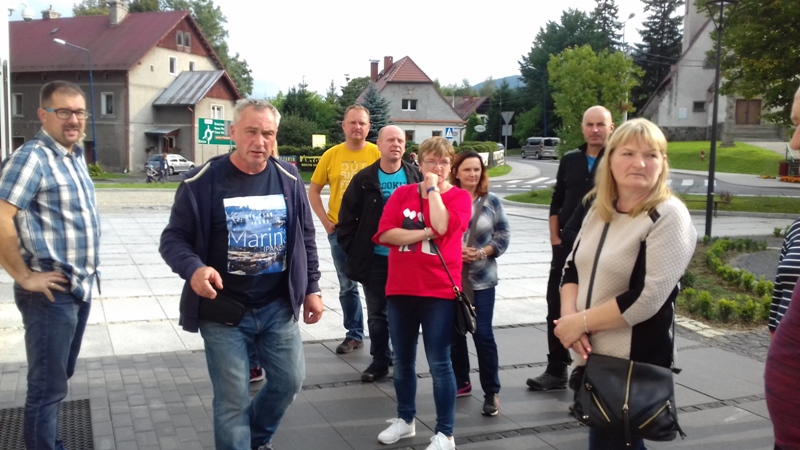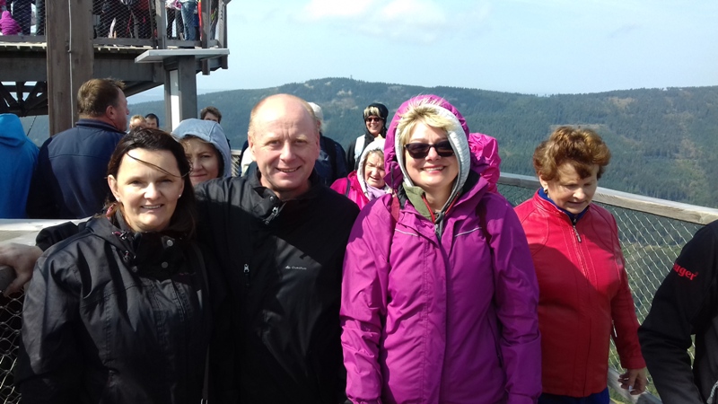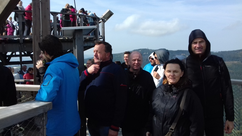 Po zwiedzeniu obiektu udaliśmy się do Dolni Morava, gdzie czekała nas kolejna atrakcja turystyczna "Sky Walk", czyli "spacer w chmurach". Wyciągiem wjechaliśmy na wysokość 1116 m n.p.m., aby wspiąć się następnie 55 m na niezwykłą metalowo - drewnianą konstrukcję wieży widokowej. Krętymi ścieżkami dostaliśmy się na górę odczuwając silne podmuchy wiatru i chłód. Ale warto było stanąć na górze, postawić stopy na elastycznej siatce i spojrzeć pod nogi. Widok na cały Masyw Śnieżnika z malowniczą doliną rzeki Morawy był niesamowity. Po godzinie zjechaliśmy wyciągiem w dół i korzystając z wolnego czasu posmakowaliśmy dobrego czeskiego piwa. Następnie udaliśmy się autobusem do Międzylesia na obiad. Sobotnie popołudnie spędziliśmy w Stroniu Śląskim. Sekretarz Urzędu Miasta poświecił nam swój wolny czas oprowadzając po odrestaurowanym gmachu urzędu i zapoznając z jego historią. Dotarliśmy też do Kaplicy św. Onufrego, którą miasto odnowiło i zagospodarowało jako obiekt, w którym można bezpłatnie zawrzeć ślub, co przyciąga rzesze młodożeńców do miasta. Wieczorem zaplanowaliśmy spotkanie integracyjne z przedstawicielami Samorządu Stronia Śląskiego. Swoją obecnością zaszczycił nas Burmistrz miasta - Zbigniew Łopusiewicz  i sekretarz Tomasz Olszewski wraz z małżonką. Przy wspólnym stole radny Ozimka Andrzej Staś, pracownica UMiG- Katarzyna Smolnik, wiceprezes SMK- Werner Klimek wymieniali wraz z samorządowcami poglądy na temat funkcjonowania gminy.