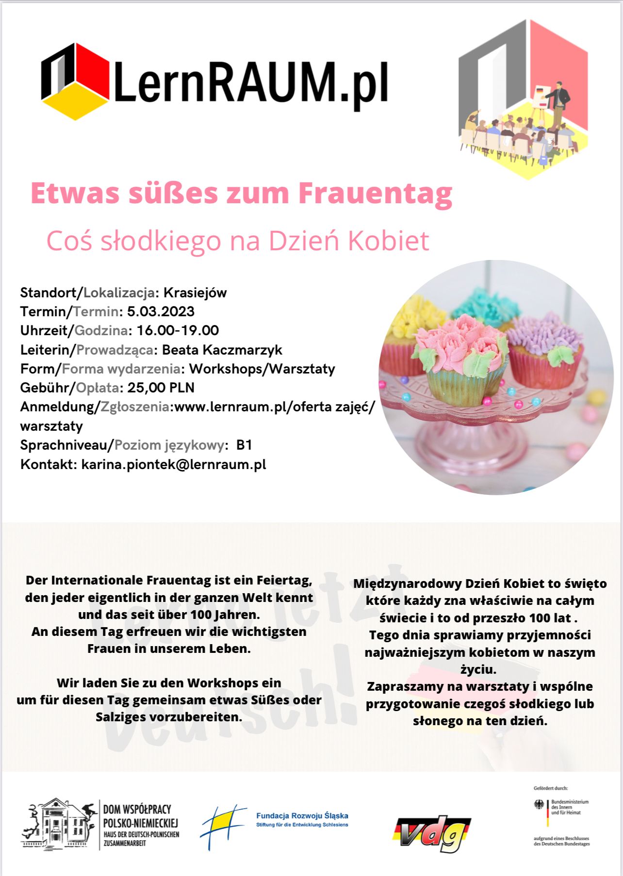 Zapraszamy na warsztaty kulinarne z okazji Dnia Kobiet w dniu 05.03 (niedziela) o godz. 16.00 do Starej Szkoły. Koszt 25 zł. Więcej informacji na plakacie. Kontakt tel. 77 4651 410 lub adres email karina.piontek@lernraum.pl