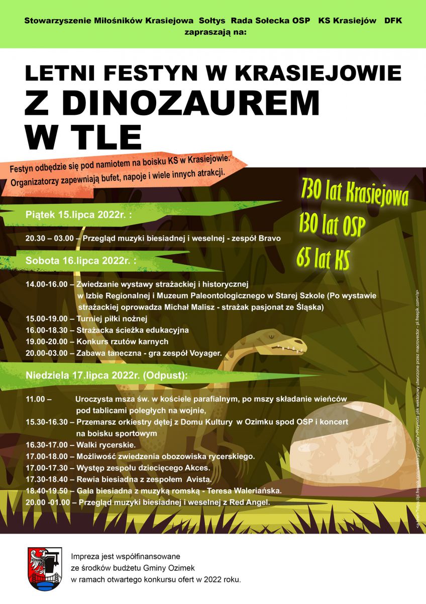 W dniach 15-17.07 Krasiejów świętował trzy Jubileusze: 730-lecie wsi Krasiejów, 130-lecie OSP Krasiejów i 65-lecie KS". W budynku Starej Szkoły, na boisku sportowum i w kościele w niedzielę odbywały sie uroczystości pod nazwą "Festyn Letni z Dinozaurem w Tle". W załączeniu fotorelacja i sprawozdanie z dwóch pierwszych dni (czytaj więcej...)