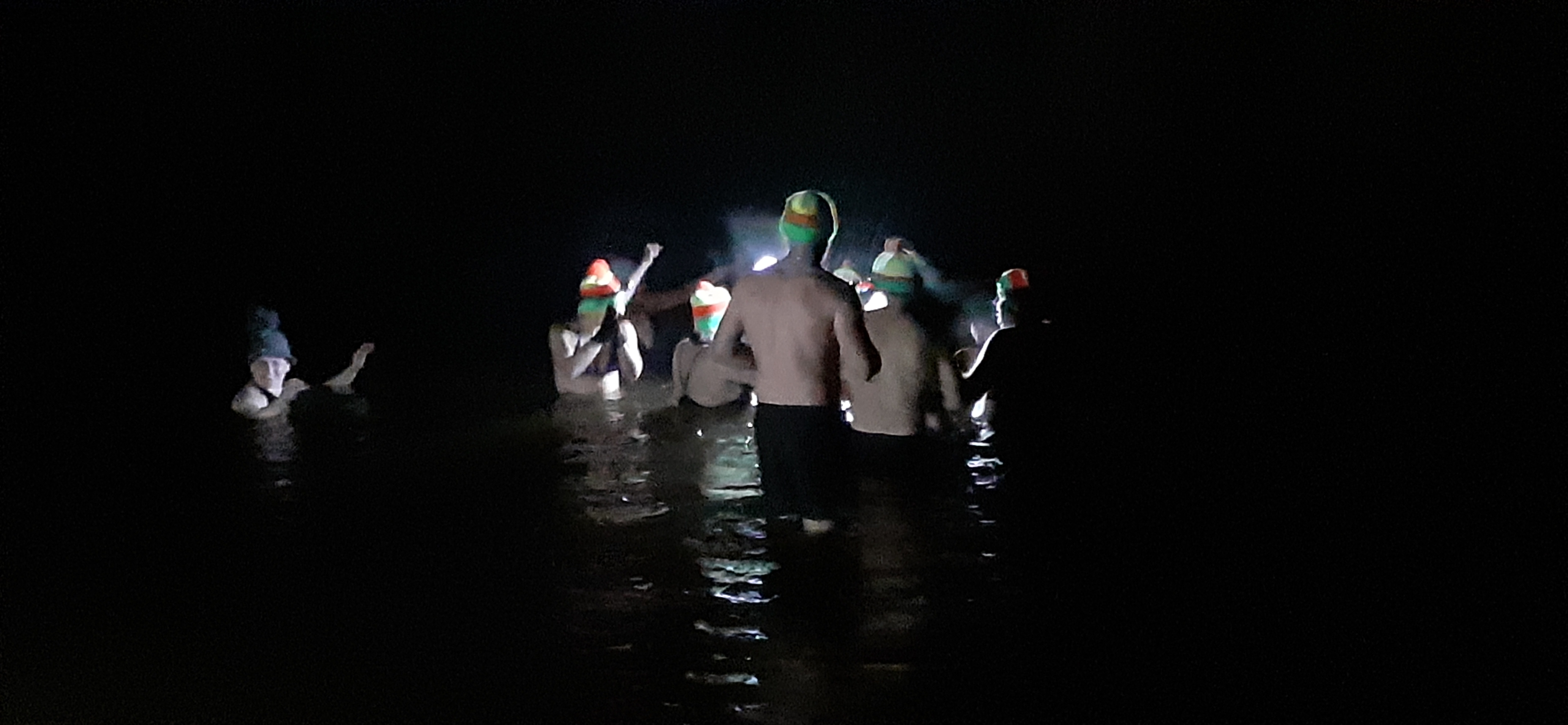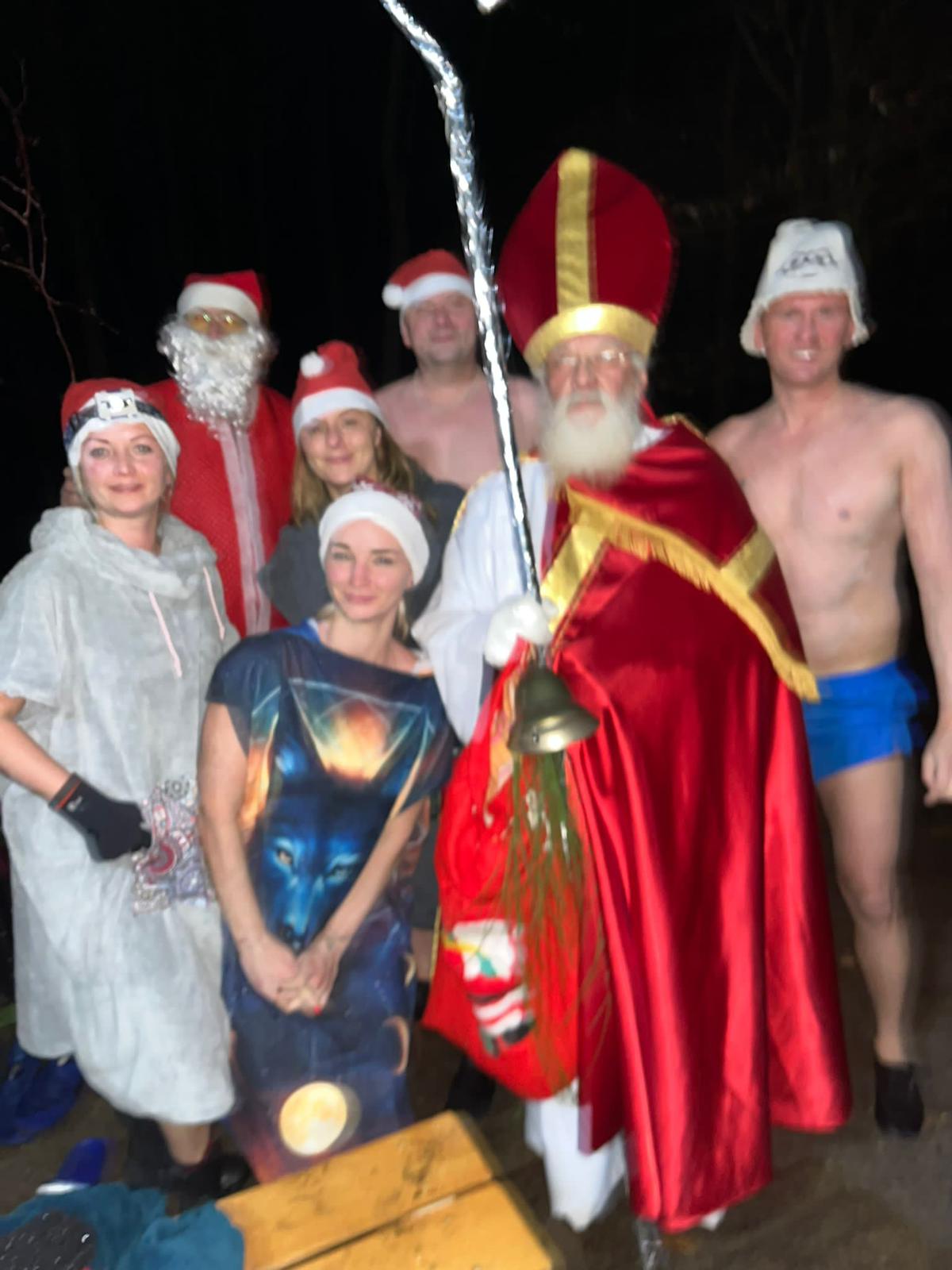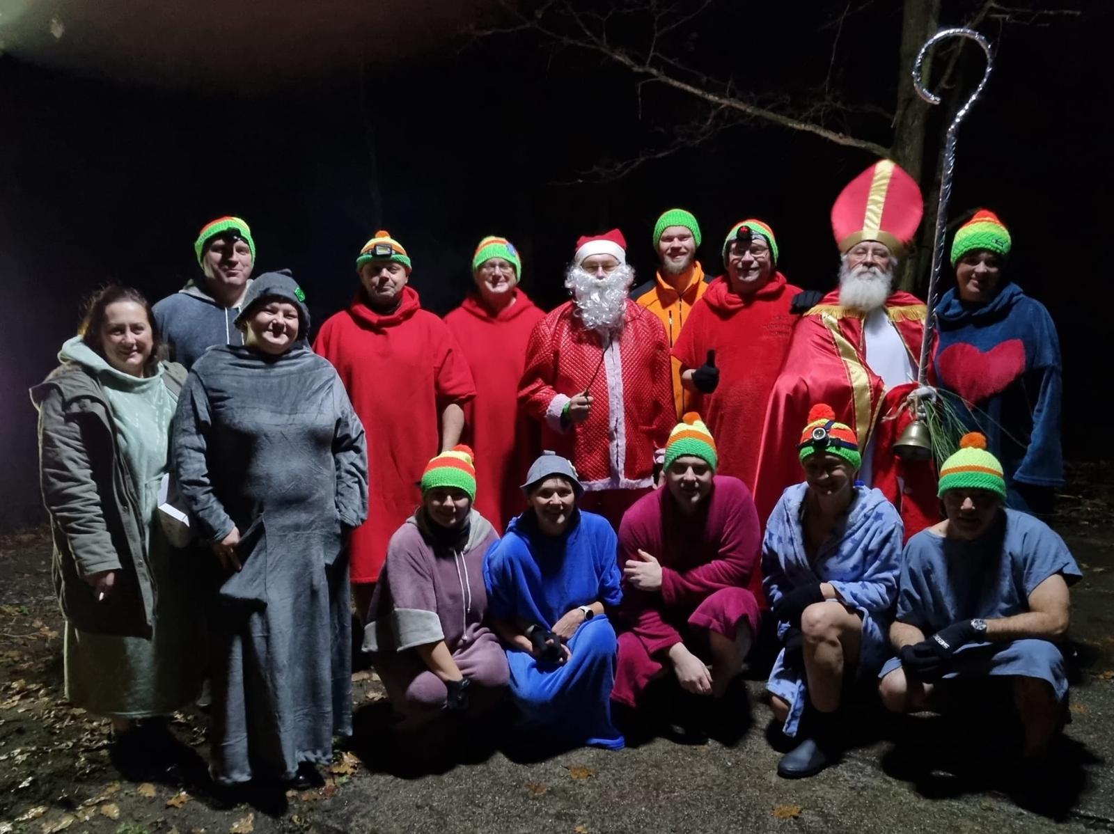 Oj działo się, działo  się w  środowy  wieczór na Czarnym Dole. Do  "Śląskich Zimorodków" przyjechała grupa morsów  "Sopel"  z Dobrodzienia.  Wszyscy zostali przywitani przez Mikołaja trzymającego w rękach worek z prezentami. Były nimi dziecięce rysunki. Placyk przed sauną rozświetlały płomienie przygotowanego na tę okazję ogniska. Wszędzie wkoło panowały przysłowiowe egipskie ciemności. Po przebraniu się w stroje kąpielowe i założeniu czołówek na głowy, członkowie grup udali się  rozświetloną  przez  pochodnie ścieżką do rzeki, aby zanurzyć się w jej wodach. O taki miły nastrój zadbała pani Karina, szefowa krasiejowskiej grupy. Po kilkuminutowej  orzeźwiającej kąpieli, goście weszli do sauny, aby kontynuować  swój pobyt w dolinie Małej Panwi. O dziwo, sauna pomieściła aż 24 osoby. Reszta morsów siedziała przy ognisku prowadząc rozmowy z św. Mikołajem i "Ricardo" czekając na miejsce w saunie. Zarówno goście jaki  i "lokalsi" spędzili wspólnie bardzo  miły wieczór, a nasz Czarny Dół tętnił życiem ludzi, którzy nie boją się zimnej wody i dbają o swoje zdrowie regularnie morsując w  akwenach. I tak to dobrodzieński  "Sopel'  nawiązał  wodny kontakt  z " Śląskimi Zimorodkami". Należy wspomnieć, że sauna nad brzegiem rzeki pojawiła się za sprawą Stowarzyszenia Odnowa Wsi Krzyżowa Dolina. Gratulujemy pomysłu! Dziękuję Pani Barbarze Werner za udostępnienie kilku zdjęć.