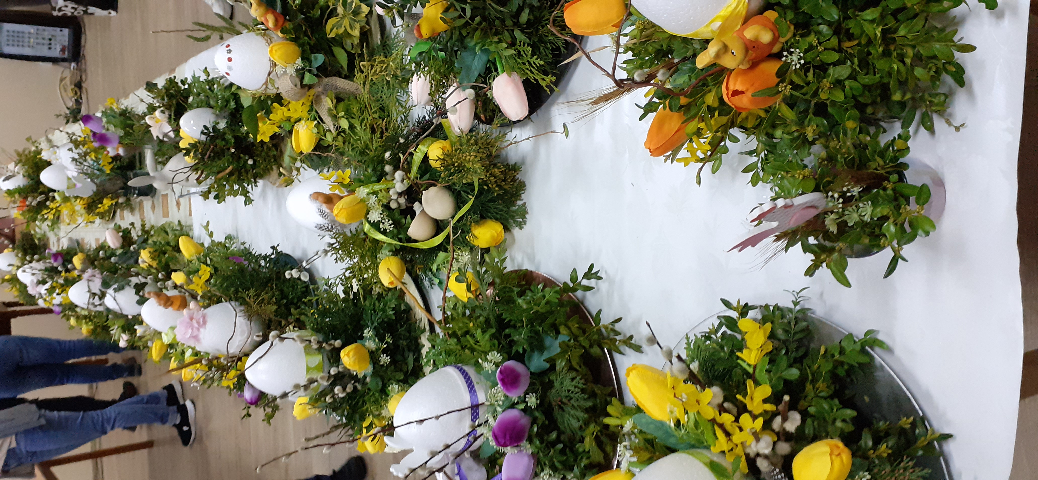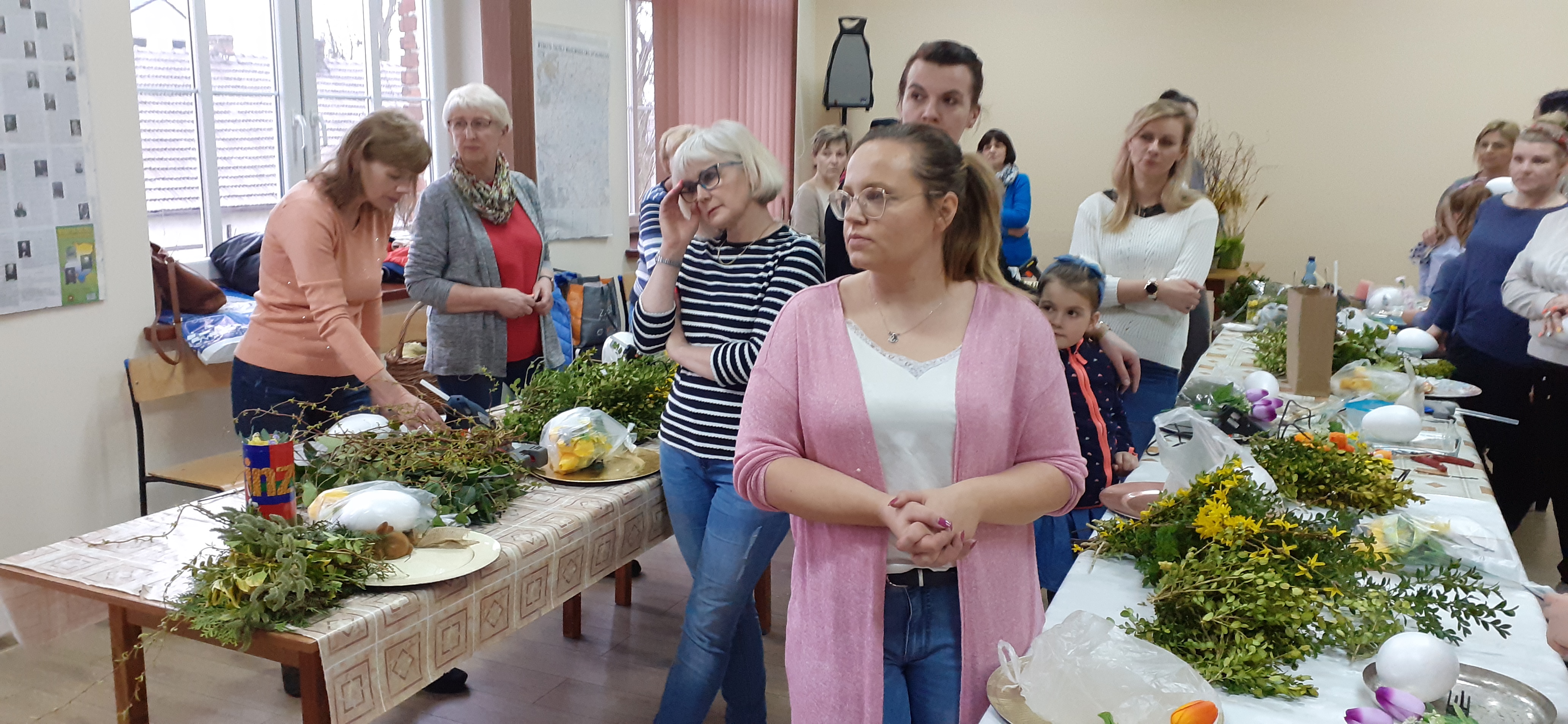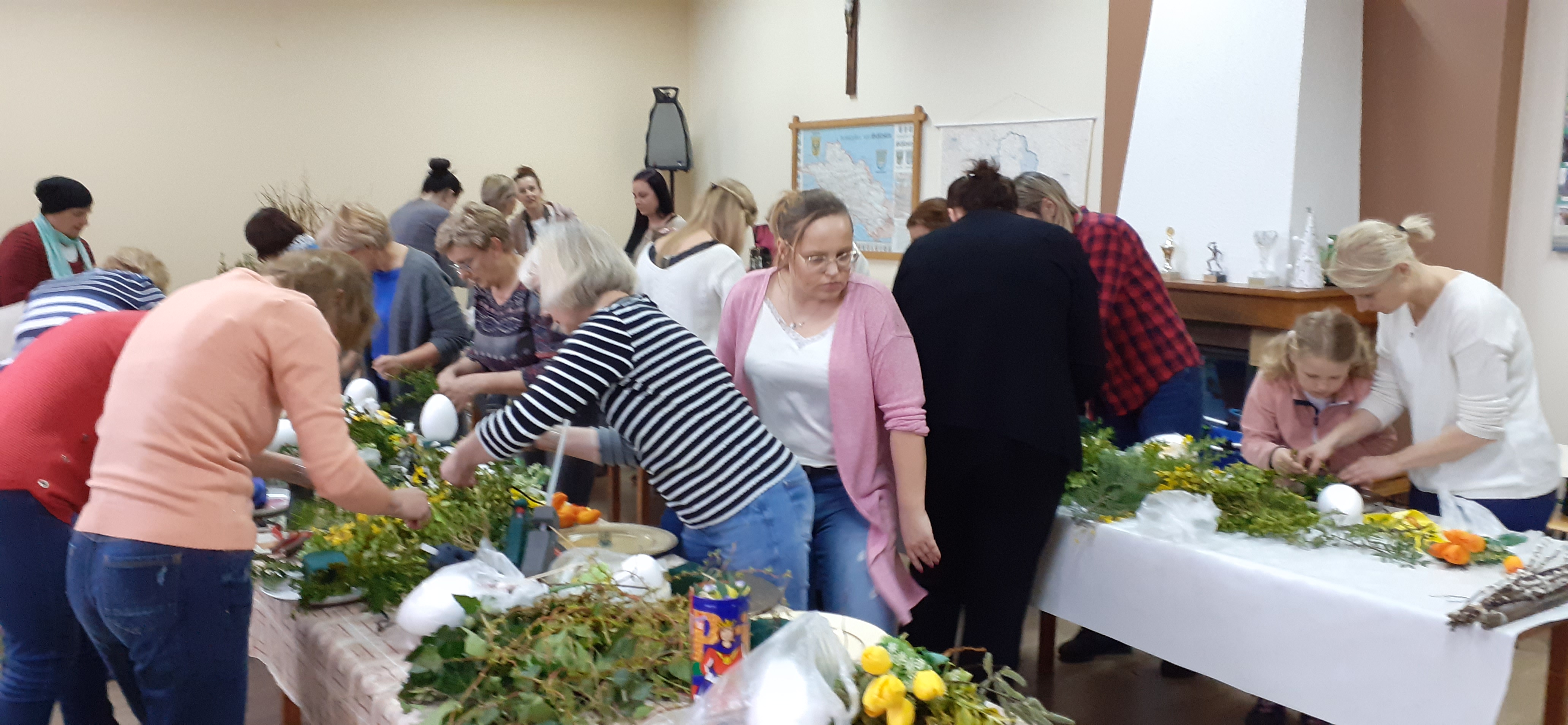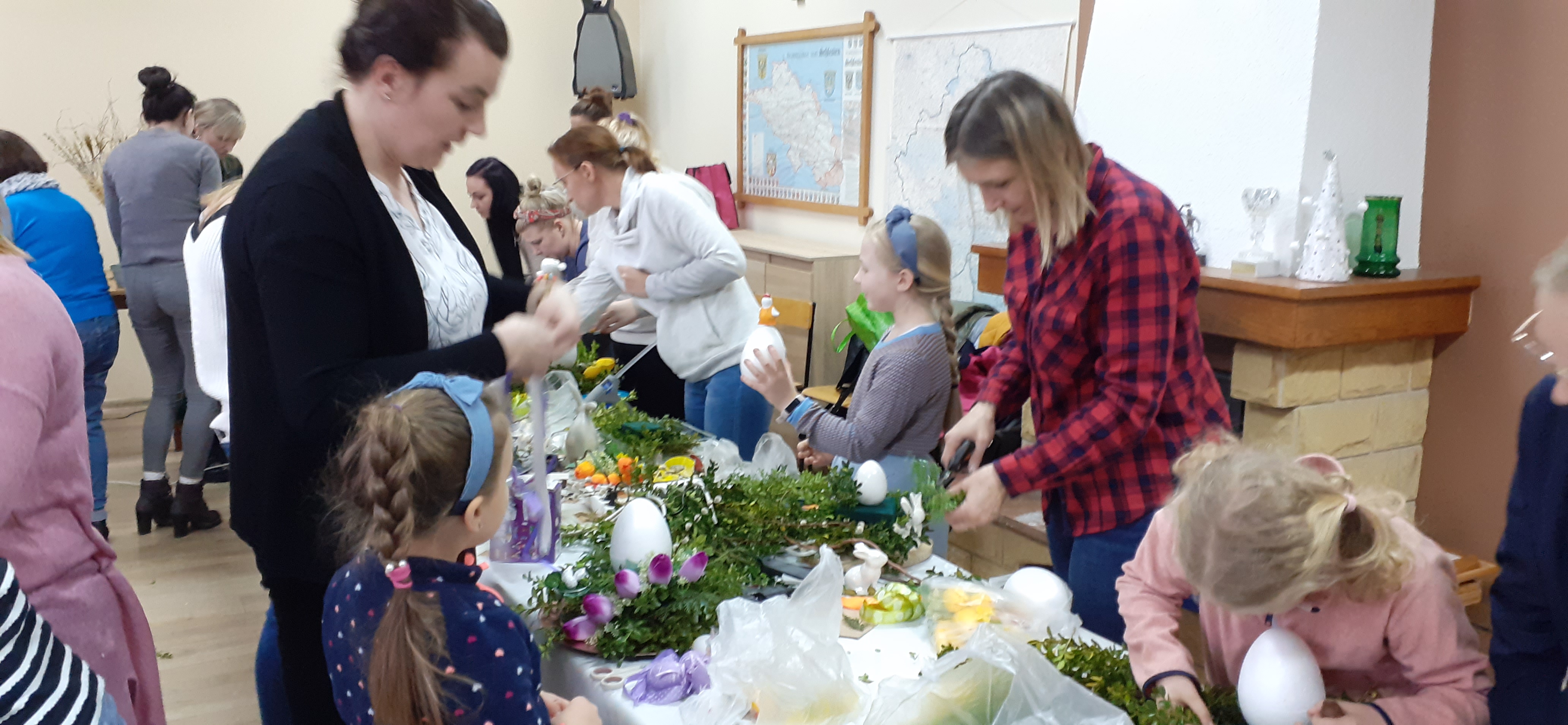 W piątkowy wieczór dn.08.04 w świetlicy Starej Szkoły zebrały się panie i dzieci, aby oddać się twórczym pracom florystycznym pod kierunkiem Katarzyny Sklorz- właścicielki kwiaciarni KatiFlowers. W centralnym miejscu stroików znalazło się duże jajo, wokół którego wiły się zielone gałązki bukszpanu, wierzby, tui lub liście bluszczu. Całość dekorowały zajączki, kwiaty tulipanów, gałązki bazi, wstążeczki i inne ozdoby wg uznania twórczyń. W warsztatach jako obserwator uczestniczyła pracownica UMiG Ozimek. Po pracy na uczestników oczekiwał poczęstunek kawowy przygotowany przez panie Ilonę Feliks i niżej podpisaną. Zajęcia były sfinansowane ze środków funduszu sołeckiego. W warsztatach wzięło udział prawie 30 osób, w tym ośmioro dzieci. Szczególne podziękowania składamy Pani florystce, dzieciom za ich zaangażowanie i mieszkankom wsi za pielęgnowanie tradycji wielkanocnej.