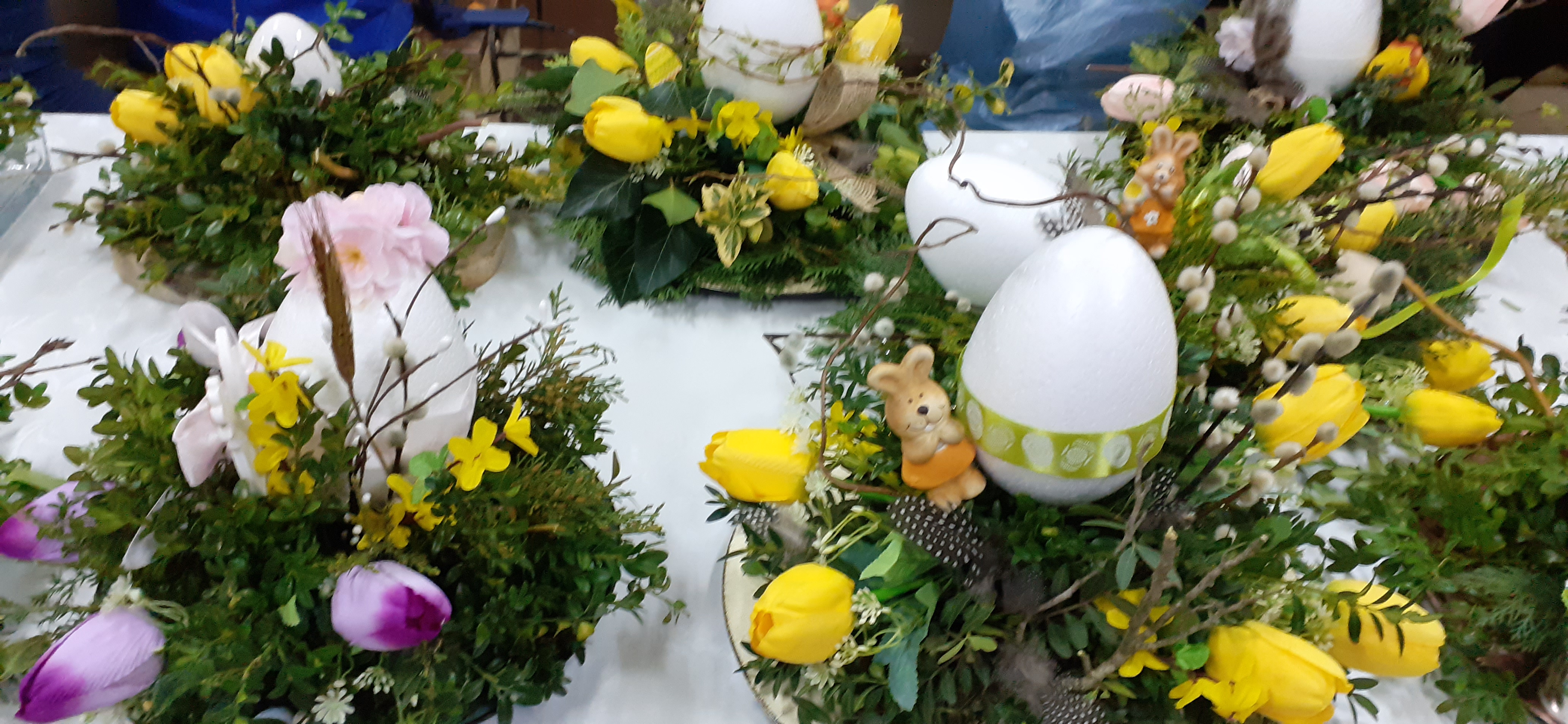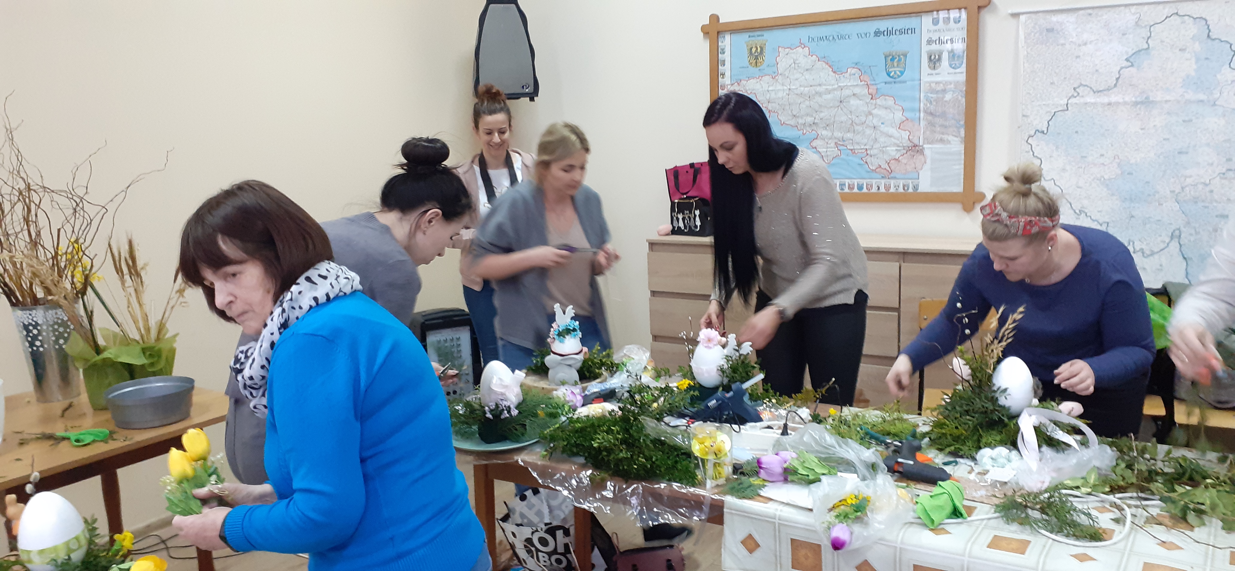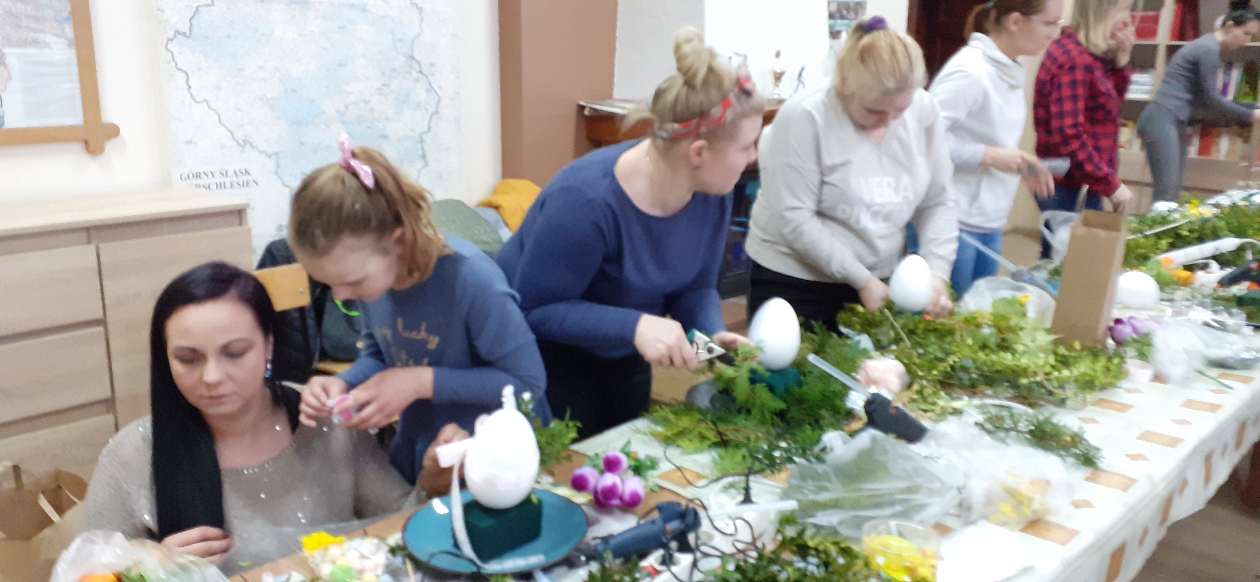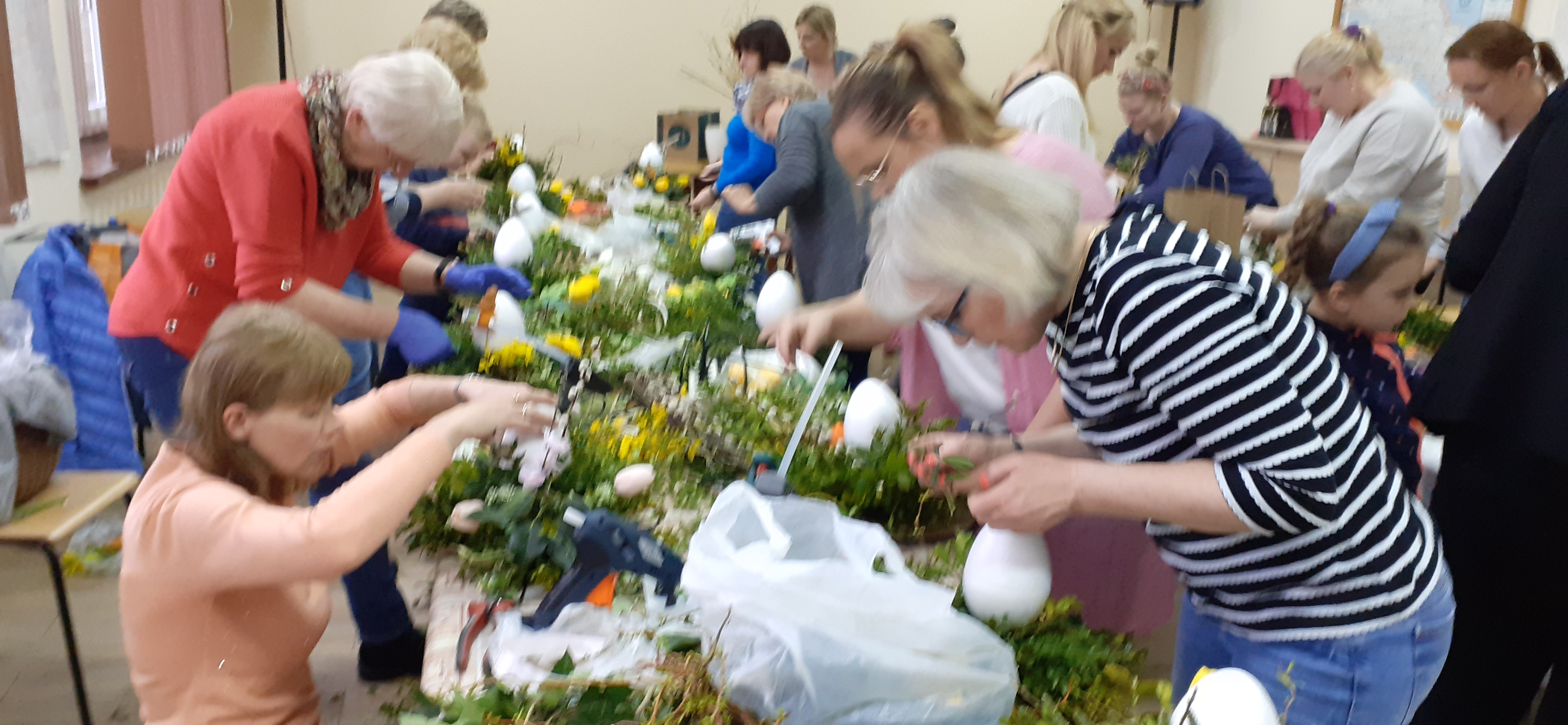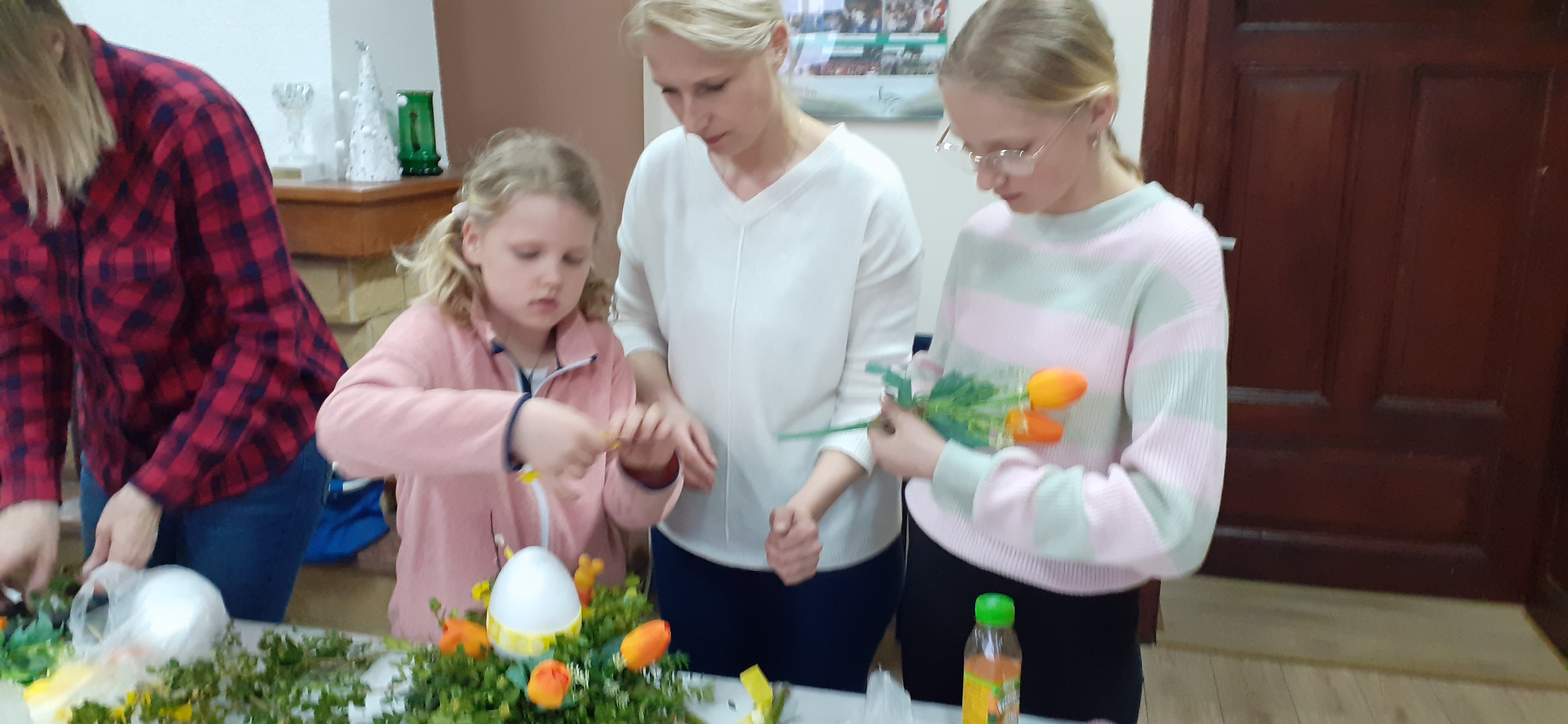 W piątkowy wieczór dn.08.04 w świetlicy Starej Szkoły zebrały się panie i dzieci, aby oddać się twórczym pracom florystycznym pod kierunkiem Katarzyny Sklorz- właścicielki kwiaciarni KatiFlowers. W centralnym miejscu stroików znalazło się duże jajo, wokół którego wiły się zielone gałązki bukszpanu, wierzby, tui lub liście bluszczu. Całość dekorowały zajączki, kwiaty tulipanów, gałązki bazi, wstążeczki i inne ozdoby wg uznania twórczyń. W warsztatach jako obserwator uczestniczyła pracownica UMiG Ozimek. Po pracy na uczestników oczekiwał poczęstunek kawowy przygotowany przez panie Ilonę Feliks i niżej podpisaną. Zajęcia były sfinansowane ze środków funduszu sołeckiego. W warsztatach wzięło udział prawie 30 osób, w tym ośmioro dzieci. Szczególne podziękowania składamy Pani florystce, dzieciom za ich zaangażowanie i mieszkankom wsi za pielęgnowanie tradycji wielkanocnej.