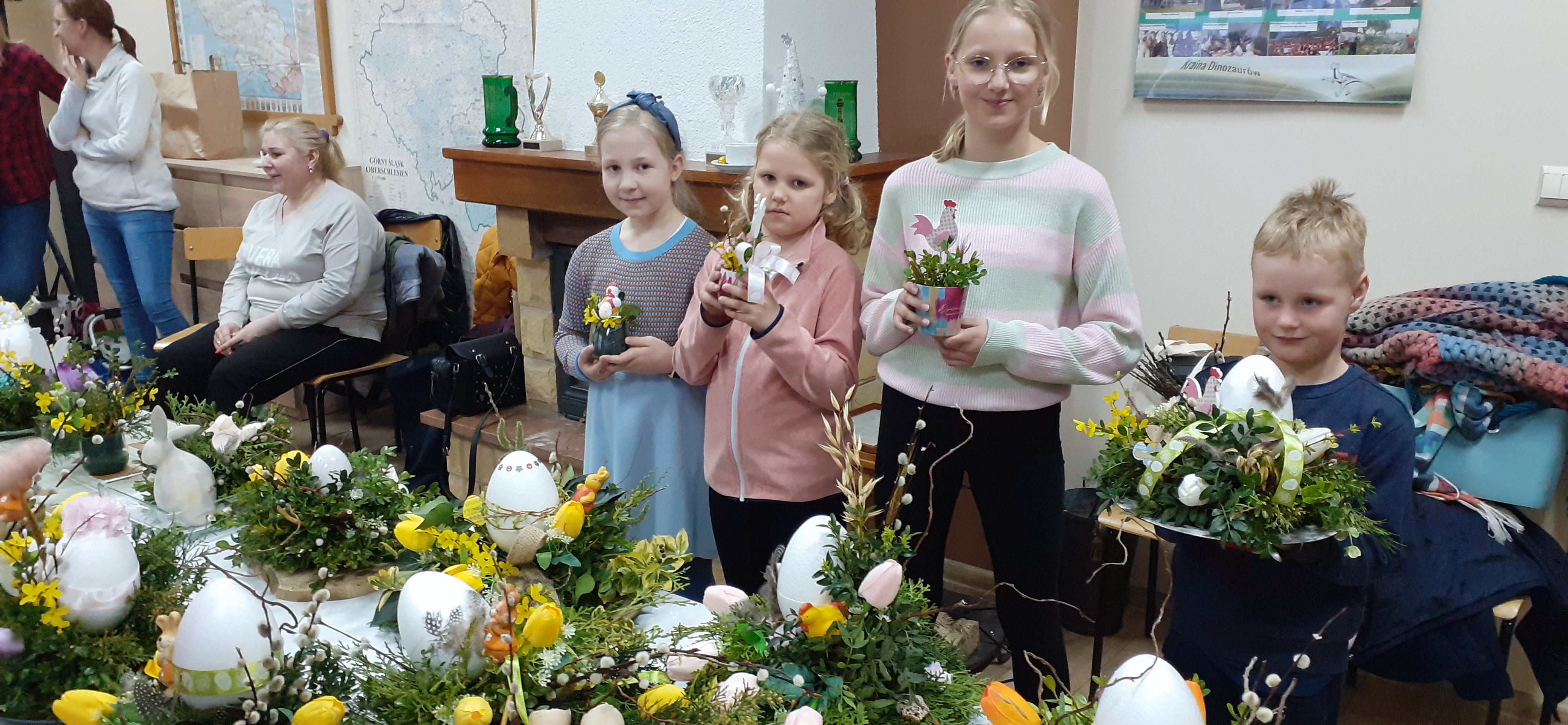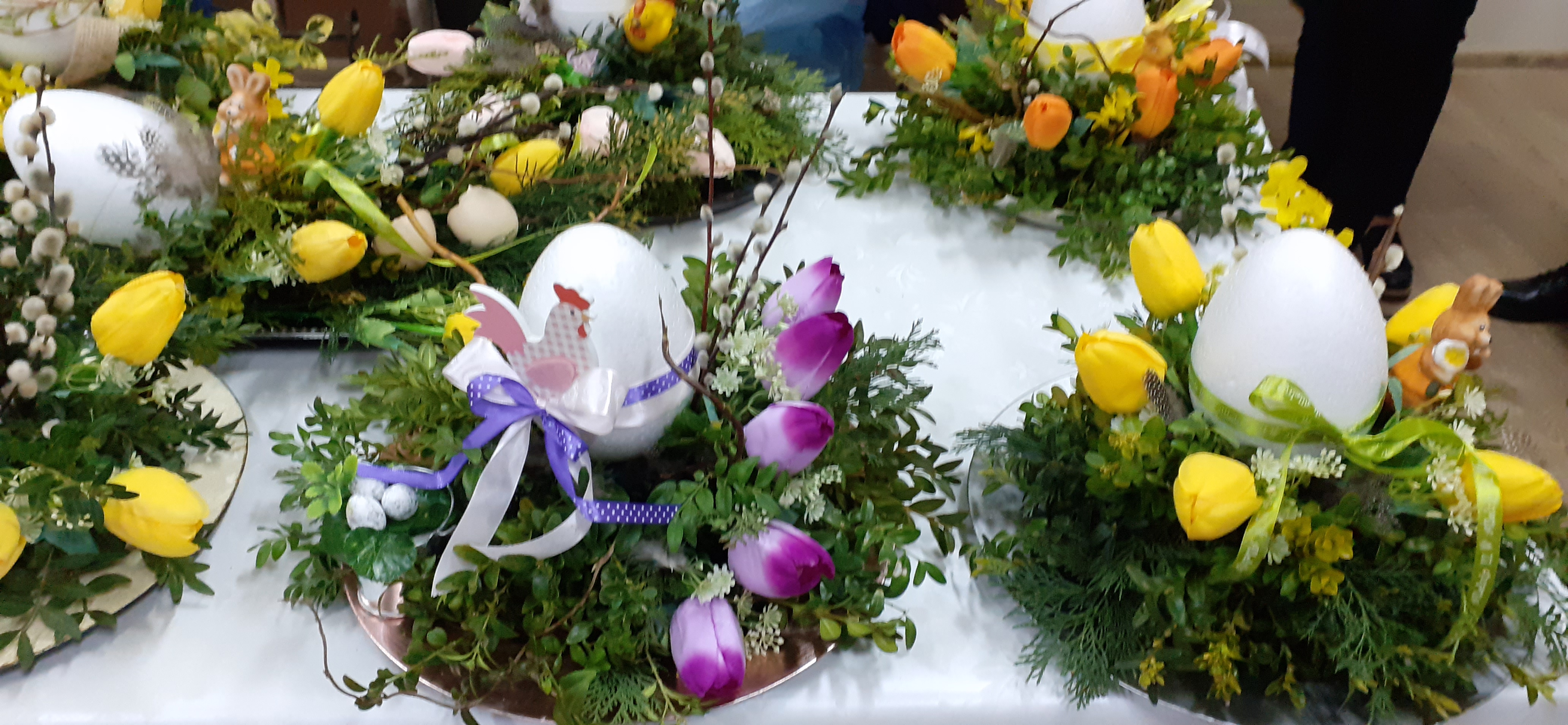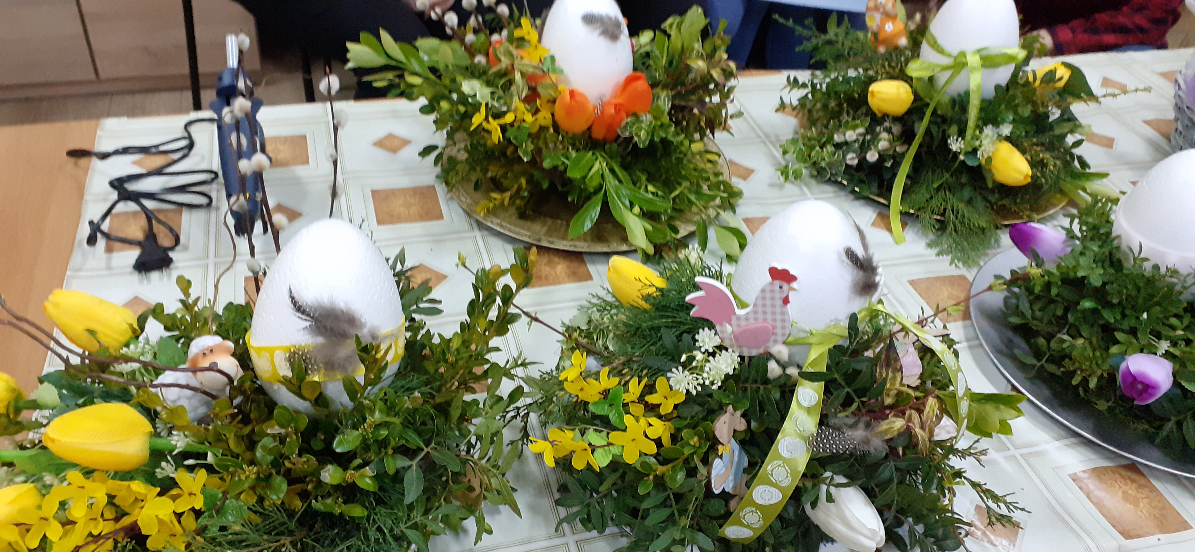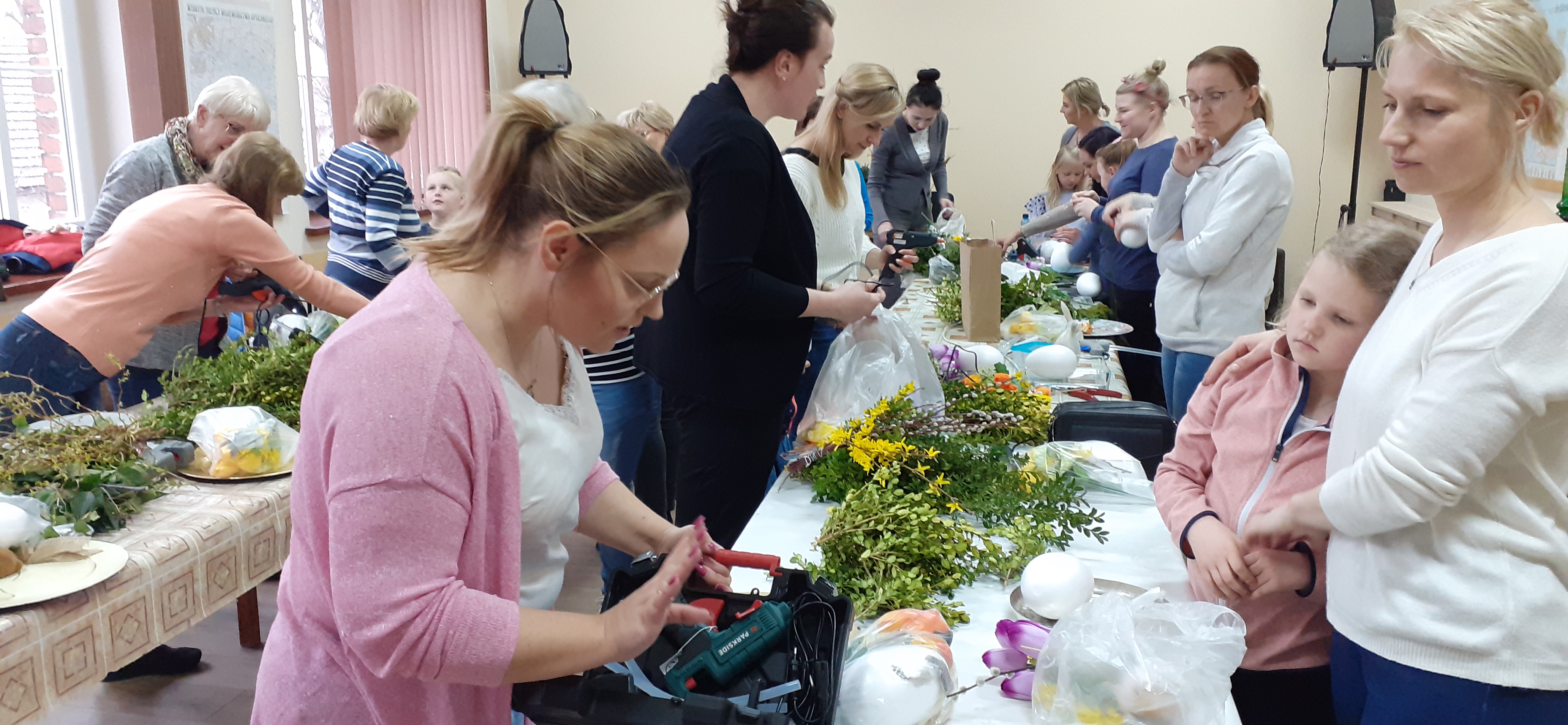 W piątkowy wieczór dn.08.04 w świetlicy Starej Szkoły zebrały się panie i dzieci, aby oddać się twórczym pracom florystycznym pod kierunkiem Katarzyny Sklorz- właścicielki kwiaciarni KatiFlowers. W centralnym miejscu stroików znalazło się duże jajo, wokół którego wiły się zielone gałązki bukszpanu, wierzby, tui lub liście bluszczu. Całość dekorowały zajączki, kwiaty tulipanów, gałązki bazi, wstążeczki i inne ozdoby wg uznania twórczyń. W warsztatach jako obserwator uczestniczyła pracownica UMiG Ozimek. Po pracy na uczestników oczekiwał poczęstunek kawowy przygotowany przez panie Ilonę Feliks i niżej podpisaną. Zajęcia były sfinansowane ze środków funduszu sołeckiego. W warsztatach wzięło udział prawie 30 osób, w tym ośmioro dzieci. Szczególne podziękowania składamy Pani florystce, dzieciom za ich zaangażowanie i mieszkankom wsi za pielęgnowanie tradycji wielkanocnej.