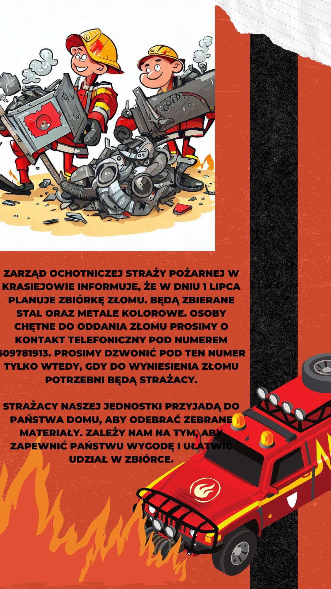 Zarząd OSP w Krasiejowie informuje, ze w dniu 1 lipca planuje zbiórkę złomu.Będą zbierane stal i metale kolorowe. Osoby chętne do oddania złomu proszone są o kontakt telefoniczny z numerem 509 781 913. Prosimy dzwonić pod ten numer tylko wtedy, gdy do wyniesienia złomu potrzebni będą strażacy (więcej...)