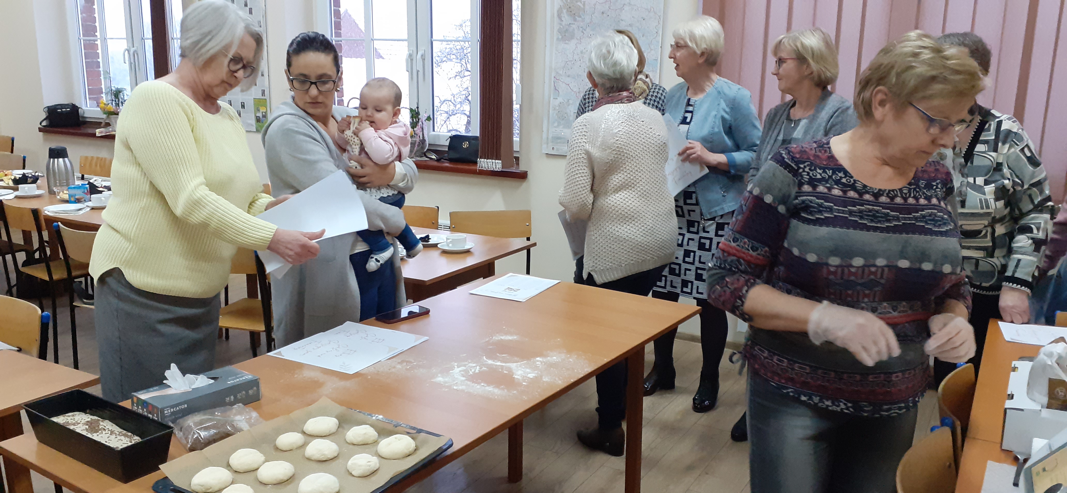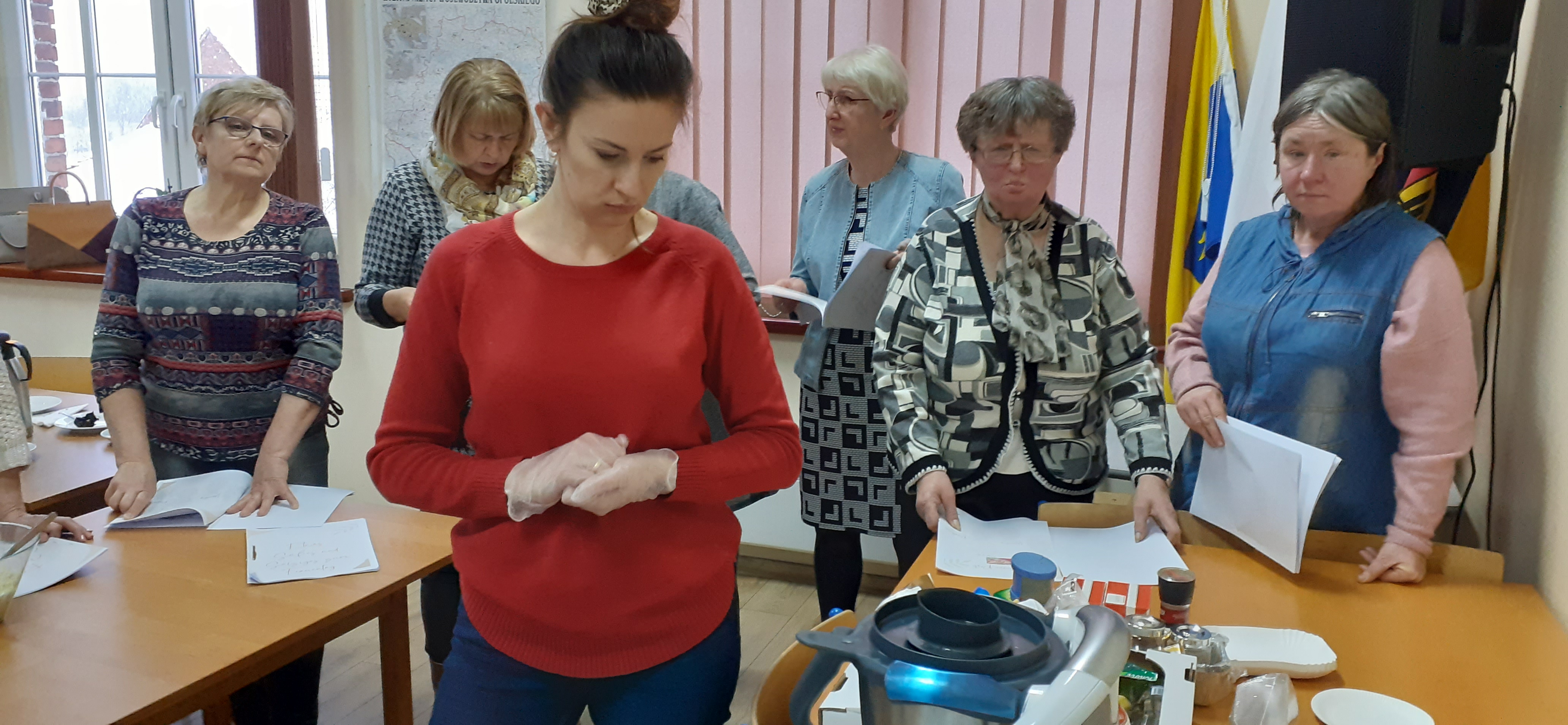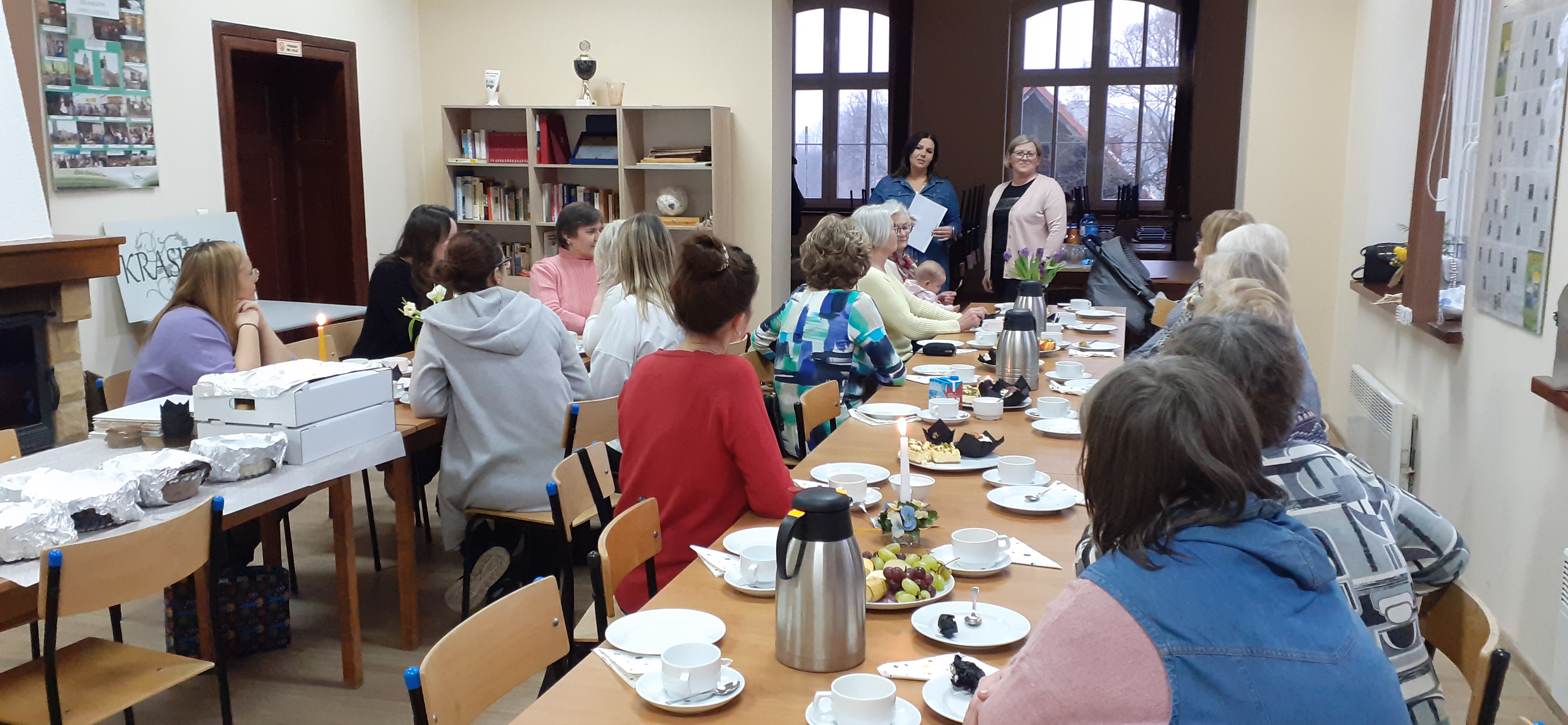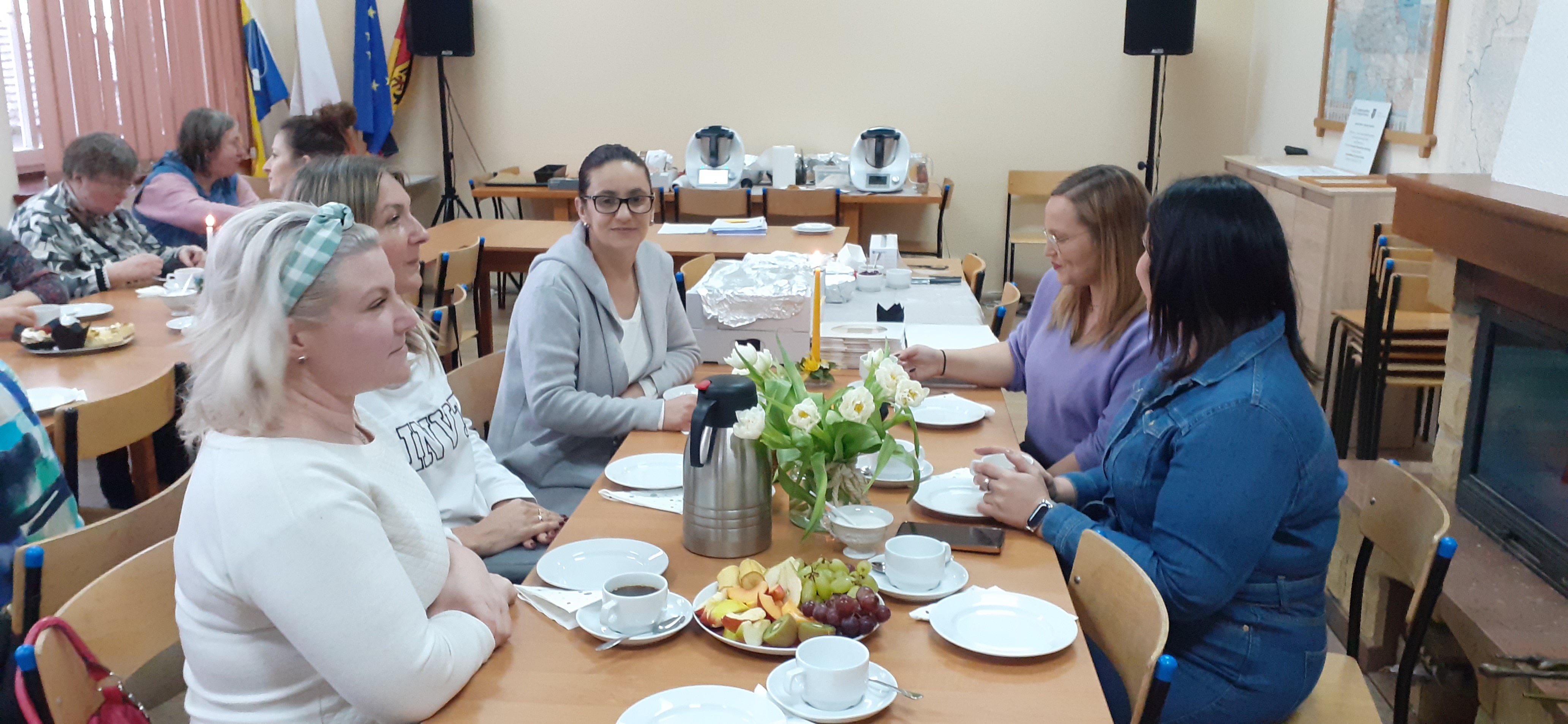 W niedzielne popołudnie 5 marca w świetlicy Starej Szkoły w Krasiejowie odbyły sie warsztaty kulinarne zorganizowane przez LernRaum z okazji Dnia Kobiet. Na wstępie uczestniczki spotkania przywitała Sylwia Widawska- gospodarz wydarzenia oraz Pani Karina Piontek- przedstawicielka LernRaum'u. Panie, które przybyły na zajęcia nie spodziewały się tylu atrakcyjnych niespodzianek. Spotkanie zaczęło się od wspólnych rozmów integracyjnych przy kawie i cieście, przygotowanych przez panie Karinę i Beatę. A potem już tylko się działo- sprawnie, efektownie i smacznie. Planując przygotowanie potraw Pani Beata Kaczmarzyk musiała uwzględnić fakt, że świetlica wiejska nie dysponuje piekarnikiem. Ale udało się! Podzieleni losowo na grupy mieliśmy do wykonania różne zadania. Jedna z pań zajęła się przygotowaniem ciasta na bułki, inna- na zdrowy chleb z ziarnami, kolejna pani przygotowała shaker truskawkowy. Potem przyszła kolej na pastę z kalafiora i brokuła, suszonych pomidorów i słonecznika oraz gulasz mięsny. Do przygotowania tych potraw wykorzystaliśmy wielofunkcyjne urządzenie kuchenne jakim jest termomix. Przepisy zamieszczone były w specjalnie wydajnej na tę okazję karcie dań. Prowadząca objaśniała i wydawała polecenia w języku polskim i niemieckim, którym sprawnie się posługiwała. Na zakończenie wszystkie panie przygotowały sobie mały torcik w kształcie serca oraz tarty owocowe, które mogły zabrać ze sobą, aby poczęstować nimi domowników. Zajęcia kulinarne trwały cztery godziny, a smaczny gulasz z upieczonym poza świetlicą chlebem był daniem finalnym. Jesteśmy pełni podziwu dla Pani Beaty Kaczmarzyk za przygotowanie produktów do tak bogatej karty dań dla prawie dwudziestu osób i znajomość tajników kulinarnych. W międzyczasie Sylwia Widawska krótko przedstawiła uczestniczkom historię Dnia Kobiet, który sięga roku 1909 i ma swoje korzenie w Ameryce Północnej, a w Europie najwcześniej był celebrowany od 1910r. w Niemczech, Danii, Austrii i Szwajcarii. Najmłodszą uczestniczką zajęć była roczna Zosia, która przez cały czas z zainteresowaniem przyglądała się czynnościom kulinarnym mamy i babci. Edukacyjne zajęcia miały na celu kultywowanie tradycji, pielęgnowanie i naukę języka niemieckiego oraz ożywienie domów spotkań członków DFK. Były okazją do wspólnie, mile i nietypowo spędzonego Dnia Kobiet. Podziękowania kierujemy do Pani Kariny Piontek (już w listopadzie spędziłyśmy z Nią czas na zajęciach z plecenia makramy), Jej córki- za okazaną pomoc i Pani Beaty Kaczmarzyk, autorki wspaniałego pokazu kulinarnego. (S. Wid.)
