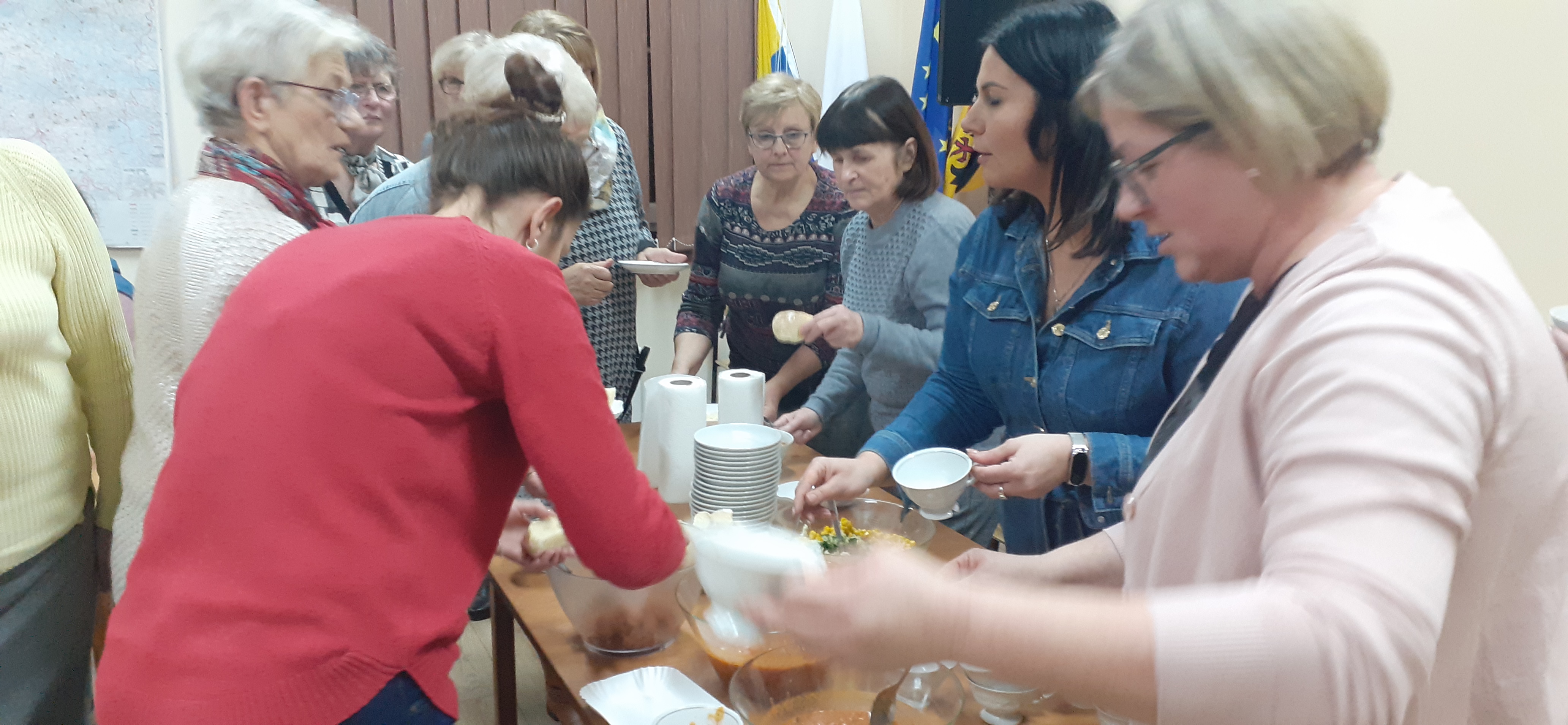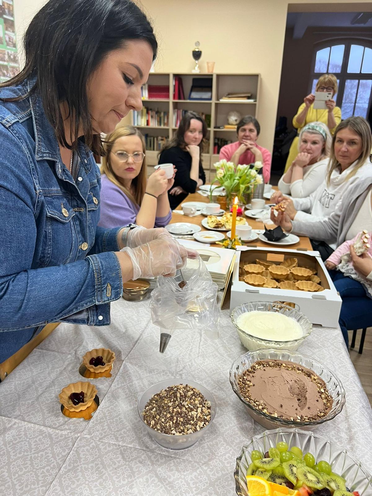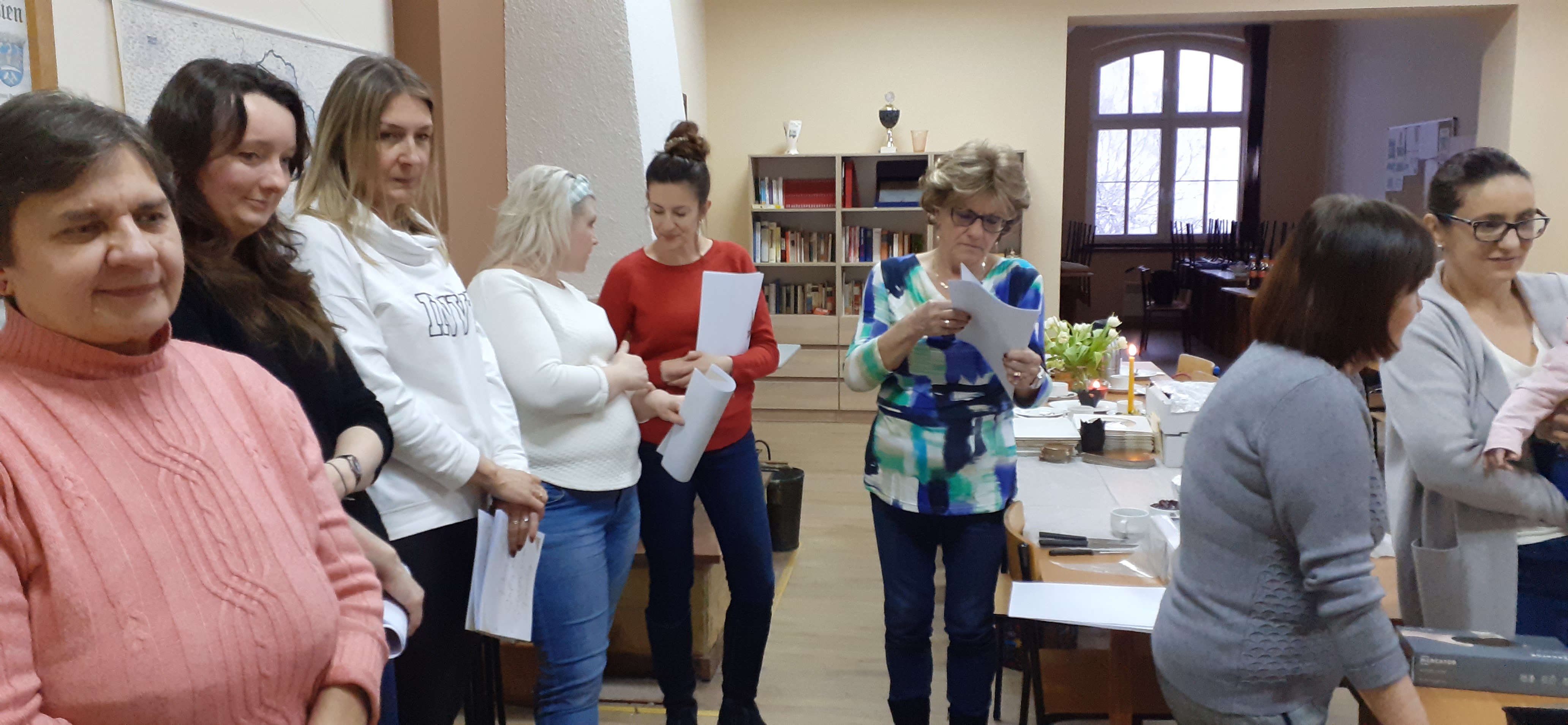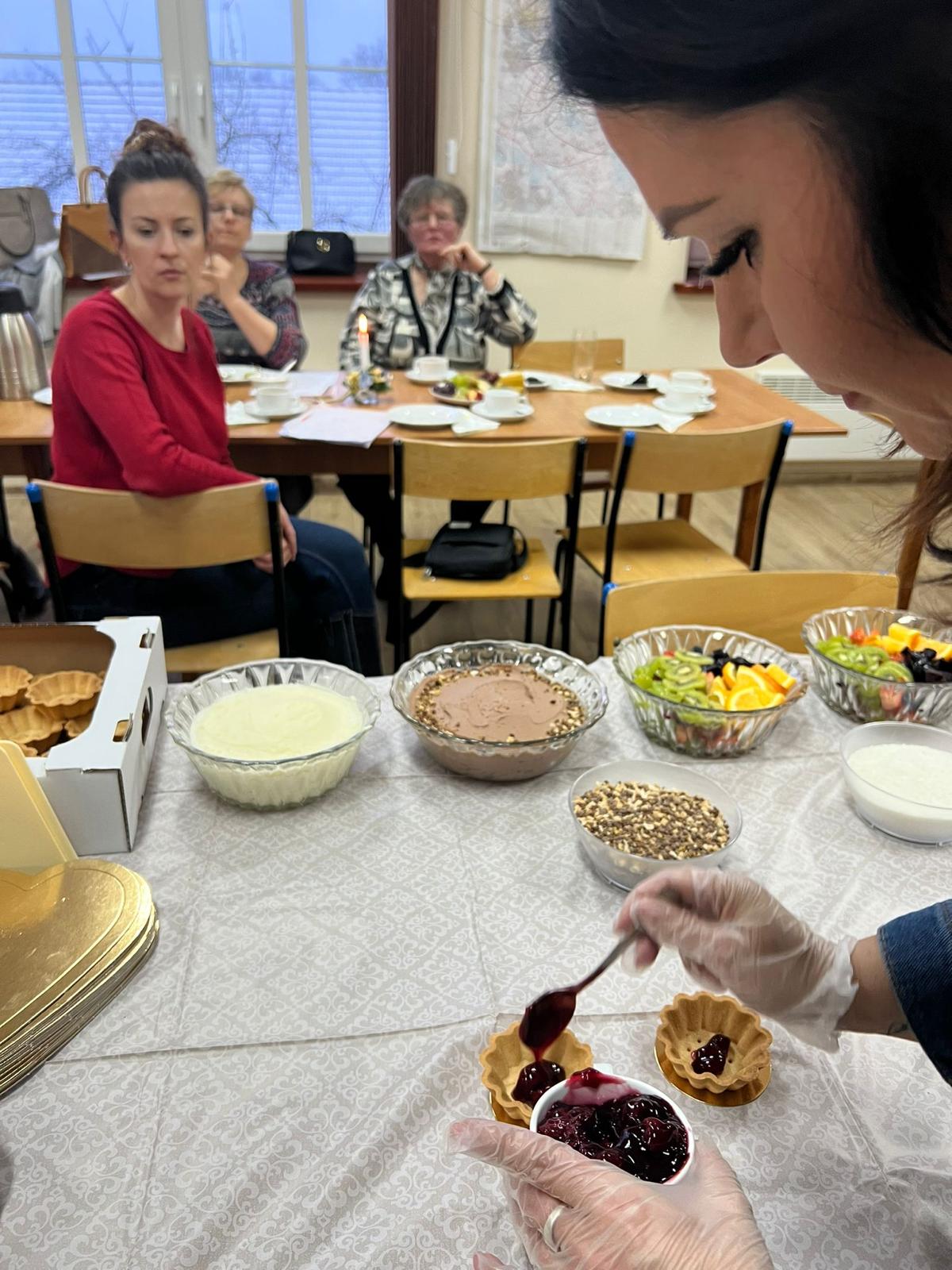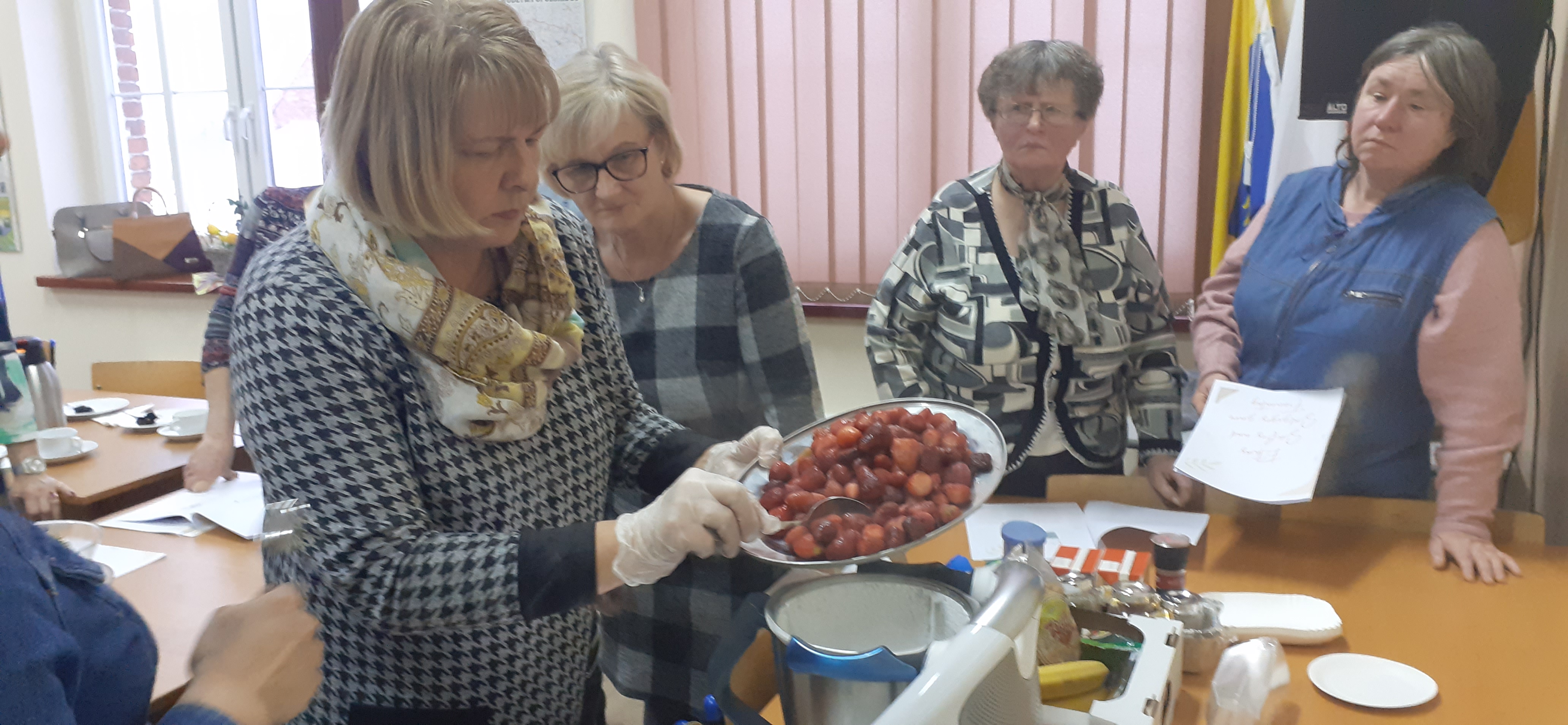 W niedzielne popołudnie 5 marca w świetlicy Starej Szkoły w Krasiejowie odbyły sie warsztaty kulinarne zorganizowane przez LernRaum z okazji Dnia Kobiet. Na wstępie uczestniczki spotkania przywitała Sylwia Widawska- gospodarz wydarzenia oraz Pani Karina Piontek- przedstawicielka LernRaum'u. Panie, które przybyły na zajęcia nie spodziewały się tylu atrakcyjnych niespodzianek. Spotkanie zaczęło się od wspólnych rozmów integracyjnych przy kawie i cieście, przygotowanych przez panie Karinę i Beatę. A potem już tylko się działo- sprawnie, efektownie i smacznie. Planując przygotowanie potraw Pani Beata Kaczmarzyk musiała uwzględnić fakt, że świetlica wiejska nie dysponuje piekarnikiem. Ale udało się! Podzieleni losowo na grupy mieliśmy do wykonania różne zadania. Jedna z pań zajęła się przygotowaniem ciasta na bułki, inna- na zdrowy chleb z ziarnami, kolejna pani przygotowała shaker truskawkowy. Potem przyszła kolej na pastę z kalafiora i brokuła, suszonych pomidorów i słonecznika oraz gulasz mięsny. Do przygotowania tych potraw wykorzystaliśmy wielofunkcyjne urządzenie kuchenne jakim jest termomix. Przepisy zamieszczone były w specjalnie wydajnej na tę okazję karcie dań. Prowadząca objaśniała i wydawała polecenia w języku polskim i niemieckim, którym sprawnie się posługiwała. Na zakończenie wszystkie panie przygotowały sobie mały torcik w kształcie serca oraz tarty owocowe, które mogły zabrać ze sobą, aby poczęstować nimi domowników. Zajęcia kulinarne trwały cztery godziny, a smaczny gulasz z upieczonym poza świetlicą chlebem był daniem finalnym. Jesteśmy pełni podziwu dla Pani Beaty Kaczmarzyk za przygotowanie produktów do tak bogatej karty dań dla prawie dwudziestu osób i znajomość tajników kulinarnych. W międzyczasie Sylwia Widawska krótko przedstawiła uczestniczkom historię Dnia Kobiet, który sięga roku 1909 i ma swoje korzenie w Ameryce Północnej, a w Europie najwcześniej był celebrowany od 1910r. w Niemczech, Danii, Austrii i Szwajcarii. Najmłodszą uczestniczką zajęć była roczna Zosia, która przez cały czas z zainteresowaniem przyglądała się czynnościom kulinarnym mamy i babci. Edukacyjne zajęcia miały na celu kultywowanie tradycji, pielęgnowanie i naukę języka niemieckiego oraz ożywienie domów spotkań członków DFK. Były okazją do wspólnie, mile i nietypowo spędzonego Dnia Kobiet. Podziękowania kierujemy do Pani Kariny Piontek (już w listopadzie spędziłyśmy z Nią czas na zajęciach z plecenia makramy), Jej córki- za okazaną pomoc i Pani Beaty Kaczmarzyk, autorki wspaniałego pokazu kulinarnego. (S. Wid.)
