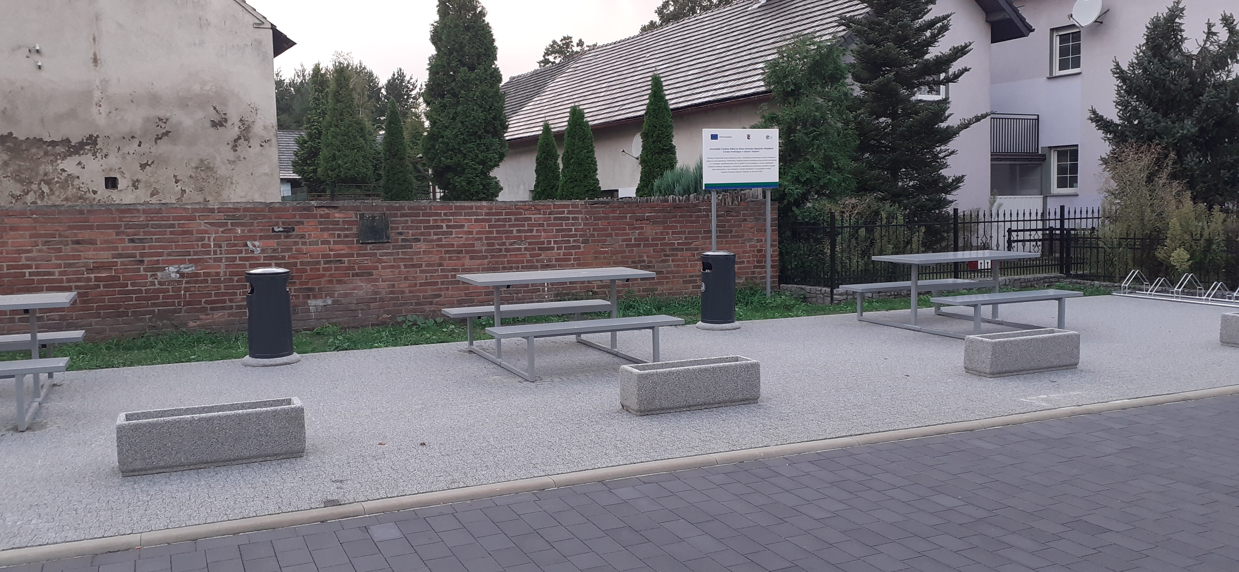 Jeden z etapów rewitalizacji centrum wsi obejmował ustawienie metalowych ławeczek i stołów oraz betonowcyh gazonów na kwiaty. Całość wygląda estetycznie i będzie z pewnością służyła mieszkańcom oraz turystom, którzy na razie zatrzymują się na placu przed starą szkołą. Szkoda tylko, że użytkownicy ławek przed szkołą zostawiają rozrzucone śmieci, w tym butelki po piwie i mocniejszych trunkach. A przecież z tego miejsca korzystają też dzieci, które przychodzą zobaczyć modele "dinusiów".