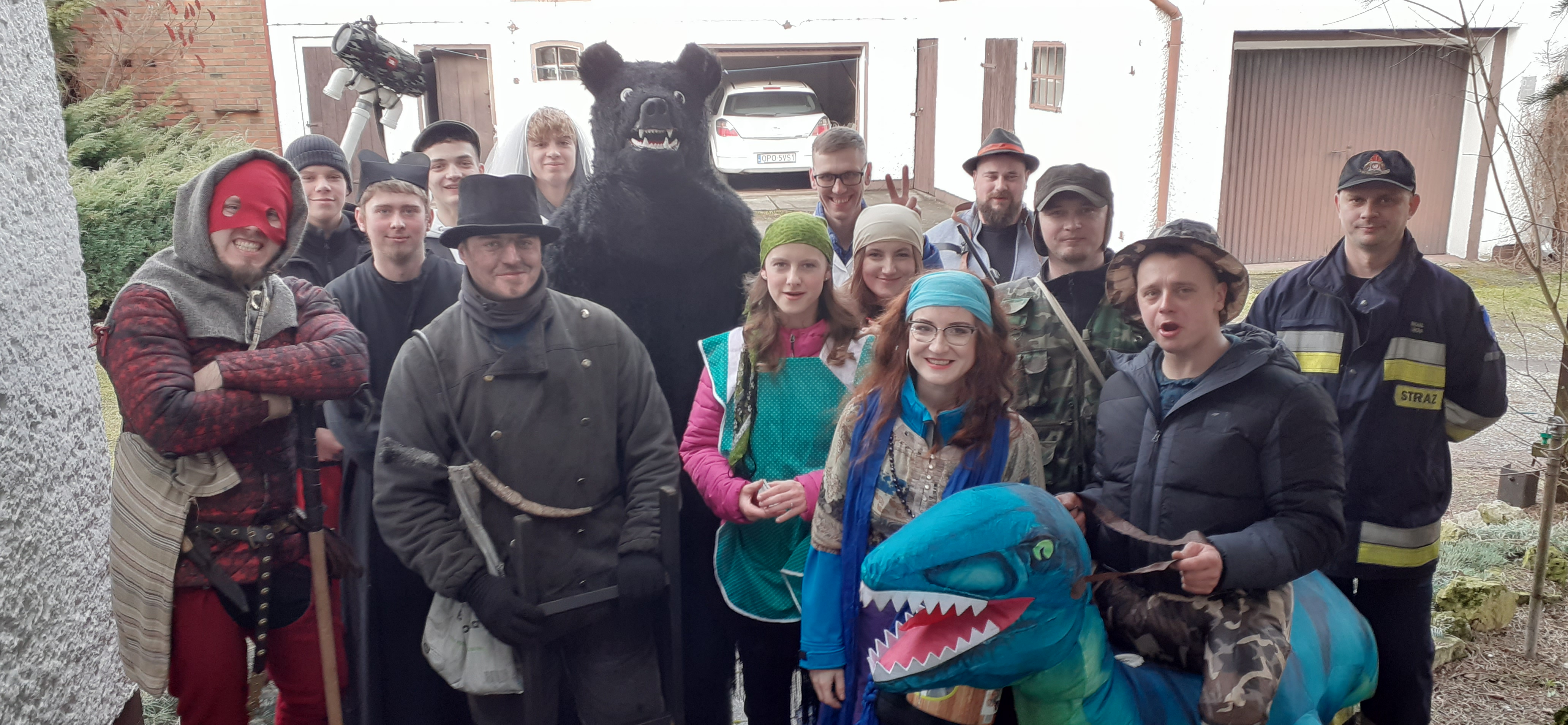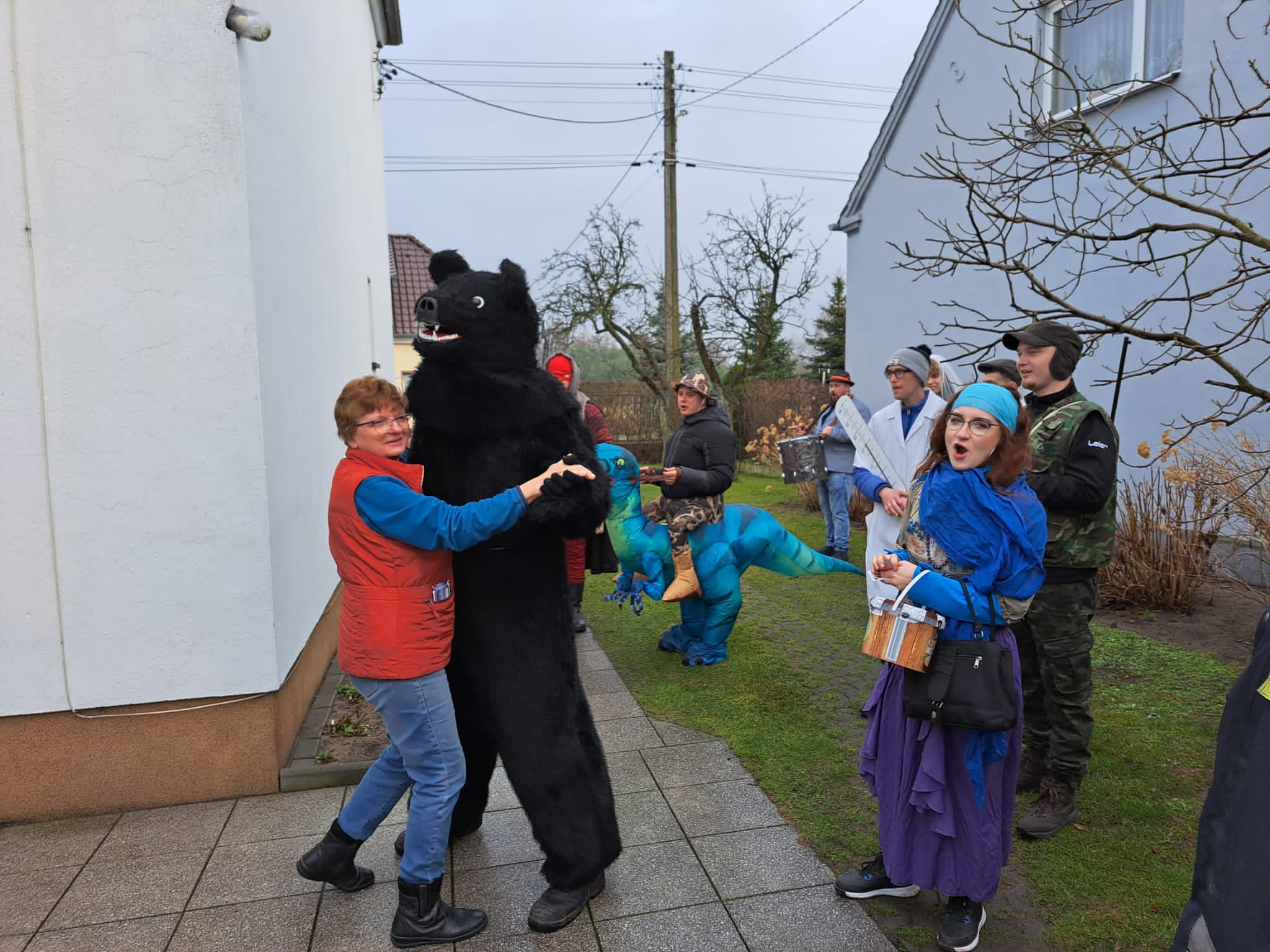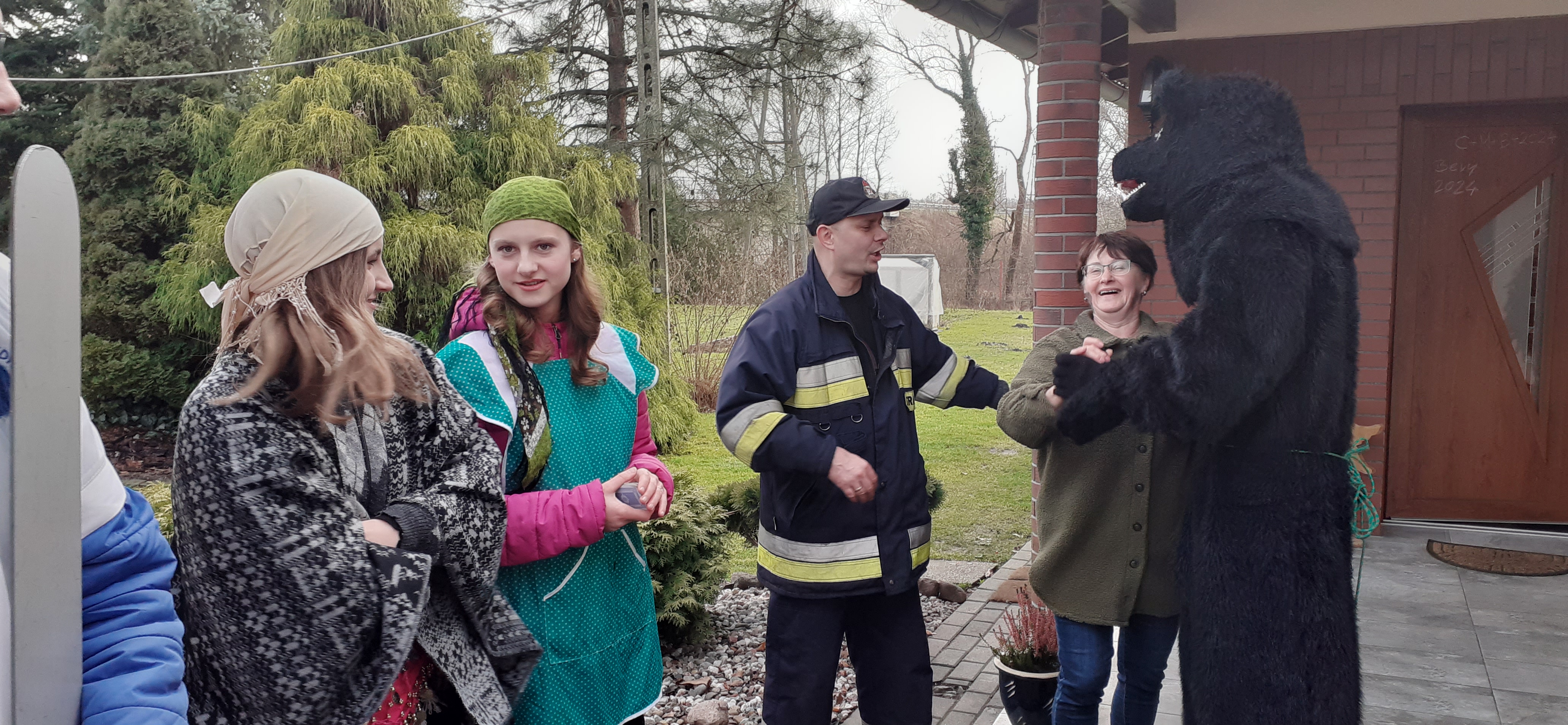 Jak co roku wczesnym rankiem przed budynkiem straży panował ruch. To strażacy zbierali się w korowód, aby wyruszyć w odwiedziny domostw położonych po prawej stronie torów kolejowych. Na początku zawitali do salki parafialnej, gdzie oczekiwały ich z poczęstunkiem członkinie PZ Caritas. Natępnie wsiedli na piękną podwodę, która wiozła ich na ulicę Brzeziny. Po drodze zatrzymywali samochody, udzielali upomnień (nawet policji) i wręczali mandaty. Obowiązkowo podczas odwiedzin gospodynie tańczyły z Berem, co zapewnić ma szczęście w przyszłości. Korowód był bardzo liczny i barwny. A w Krasiejowie, w odróżnieniu od innych wsi, do niedźwiedzia dołącza wspaniały dinozaur. I w końcu nie wiadomo, czy u nas chodzą Bery czy Dinozaur z Niedźwiedziem. Grupie towarzyszyła głośna muzyka i hałasy. Dziękujemy uczestnikom tradycyjnego wodzenia niedźwiedzia za odwiedziny, a mieszkańcom za datki, które mają szczytny cel - zakup nowego wozu strażackiego. Po południu w Starej Szkole dzieci mogły uczestniczyć w przygotowanych przez panią Ewę Kotysz animacjach, a wieczorem odbyła się zabawa taneczna dla dorosłych. Brawo strażacy z OSP Krasiejów z prezesem Tomaszem Chudalą na czele za przygotowanie tego wyjątkowego wydarzenia!!!