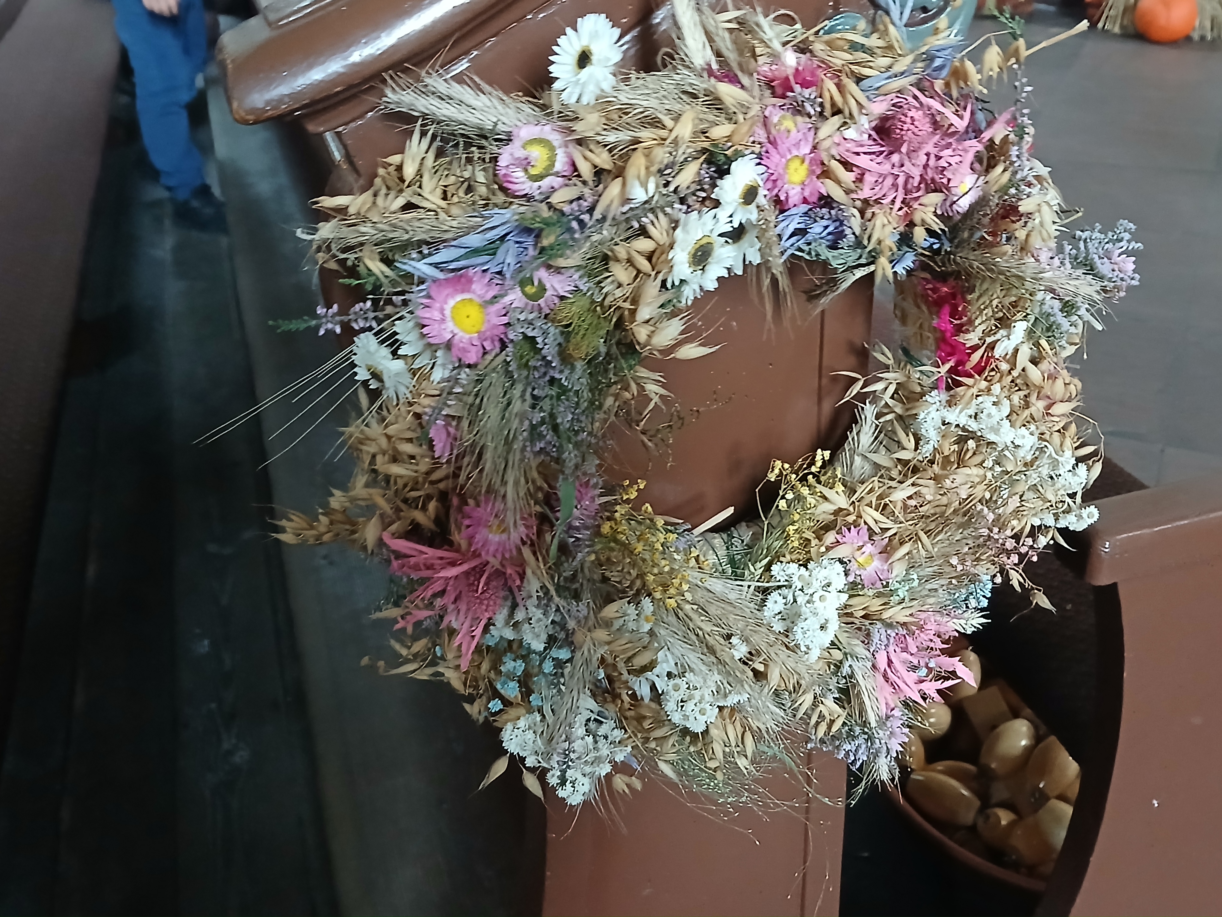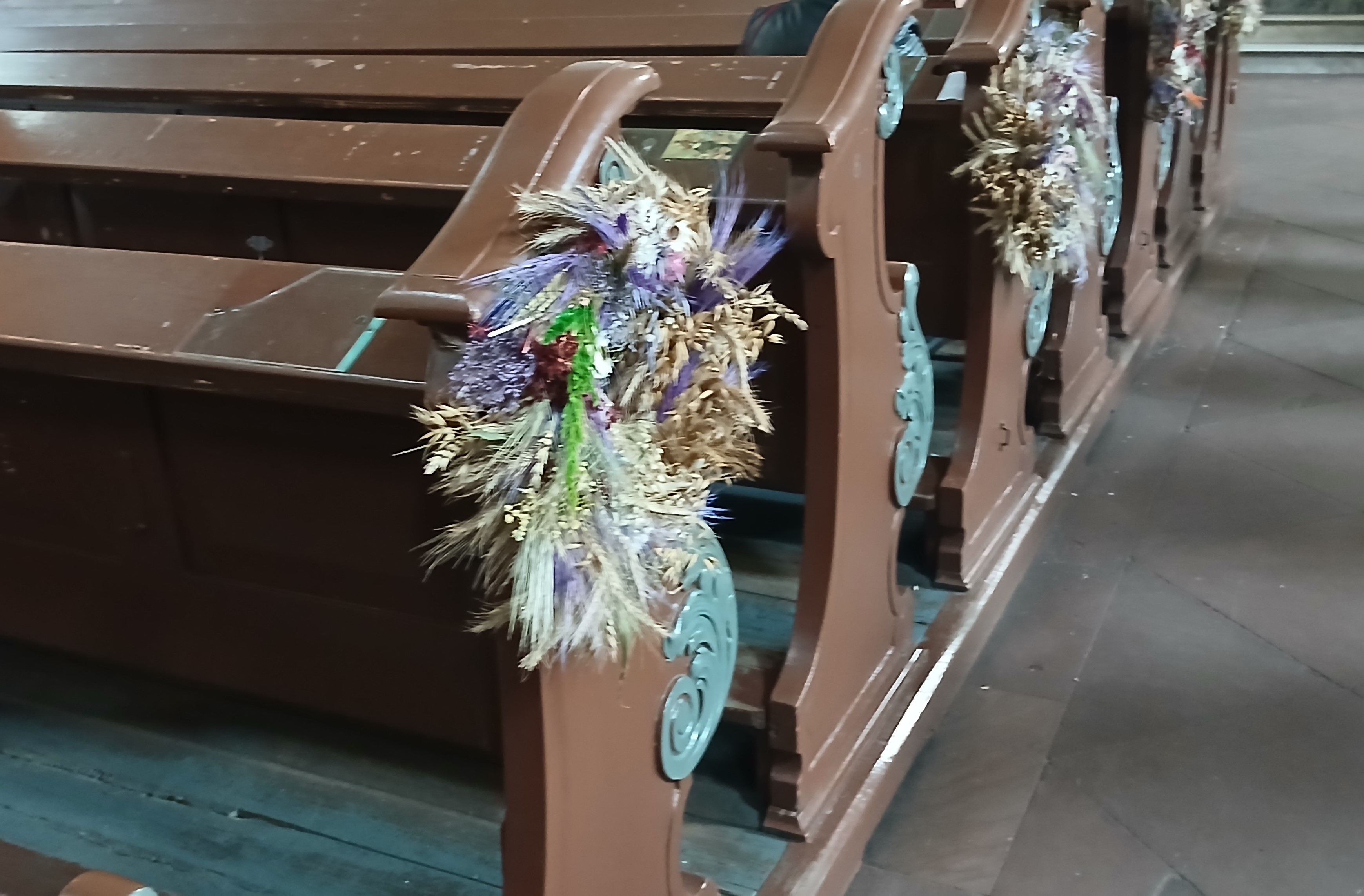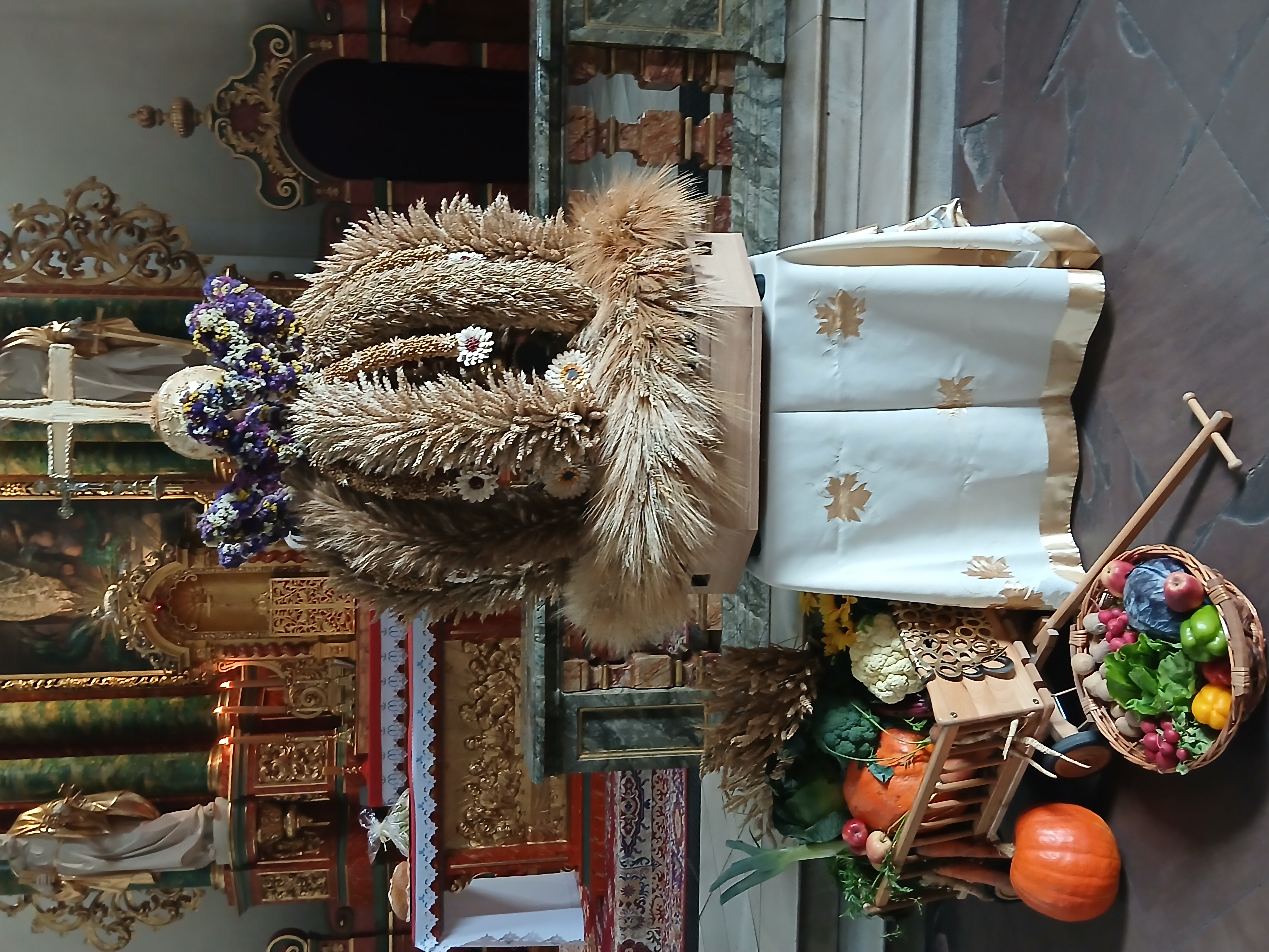 Przed ołtarzem przy koronie zostały ustawione kosze z darami ziemi, za które parafianie dziękowali Bogu, a przy ławkach w nawie glównej zawieszone zostały piękne wianuszki wykonane przez mieszkanki podczas warsztatów poprowadzonych przez Katrzynę Sklorz. Chleb to podstawa naszego wyżywienia, dlatego należy go szanować i nie marnować.
