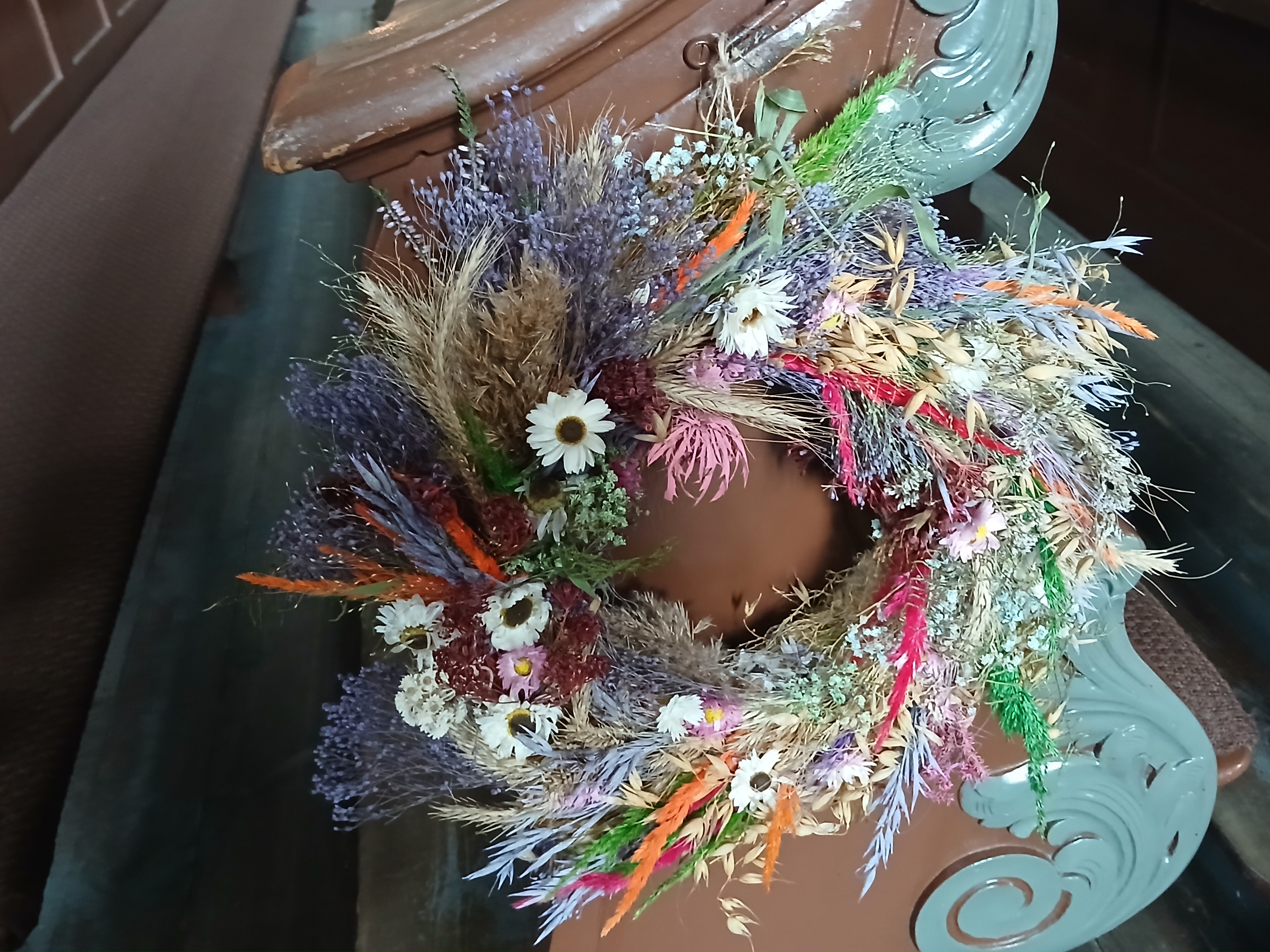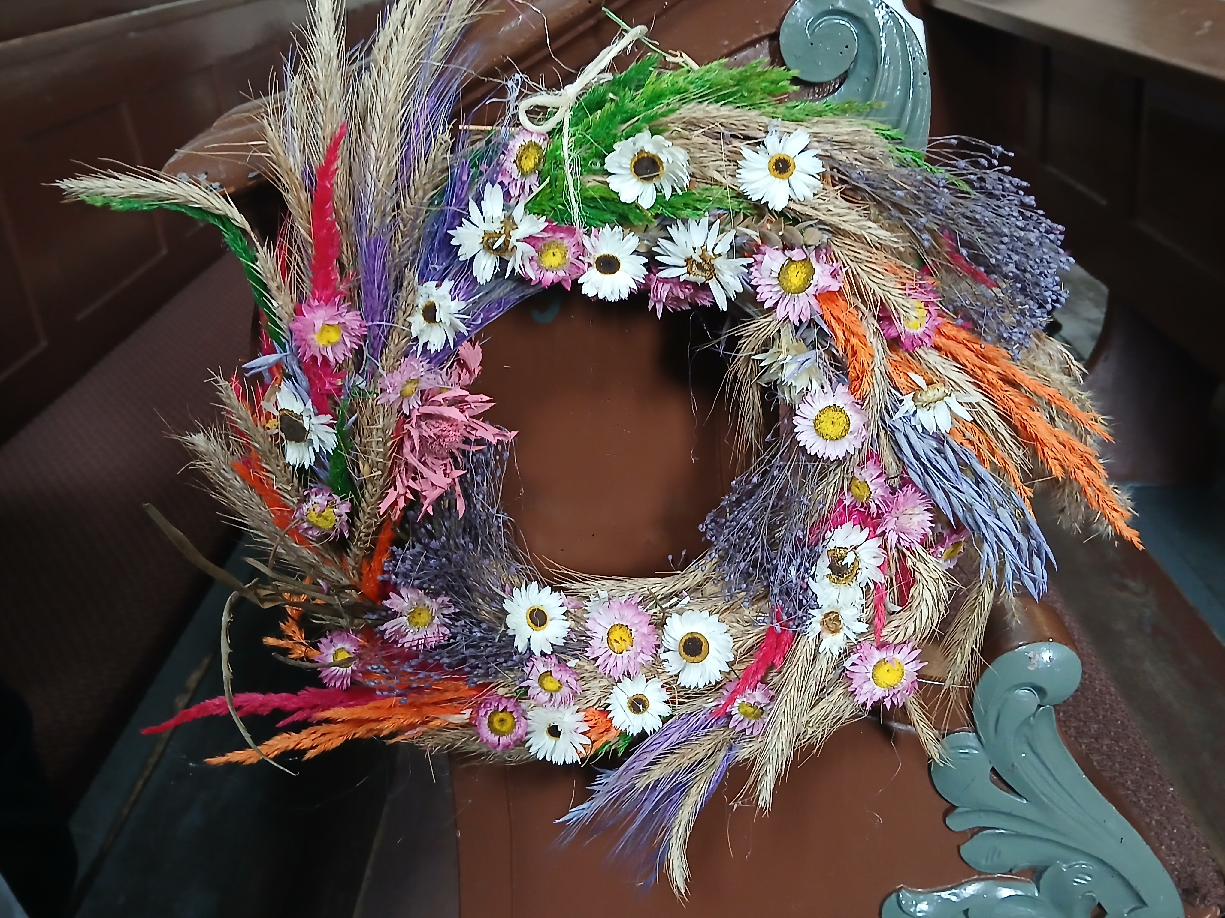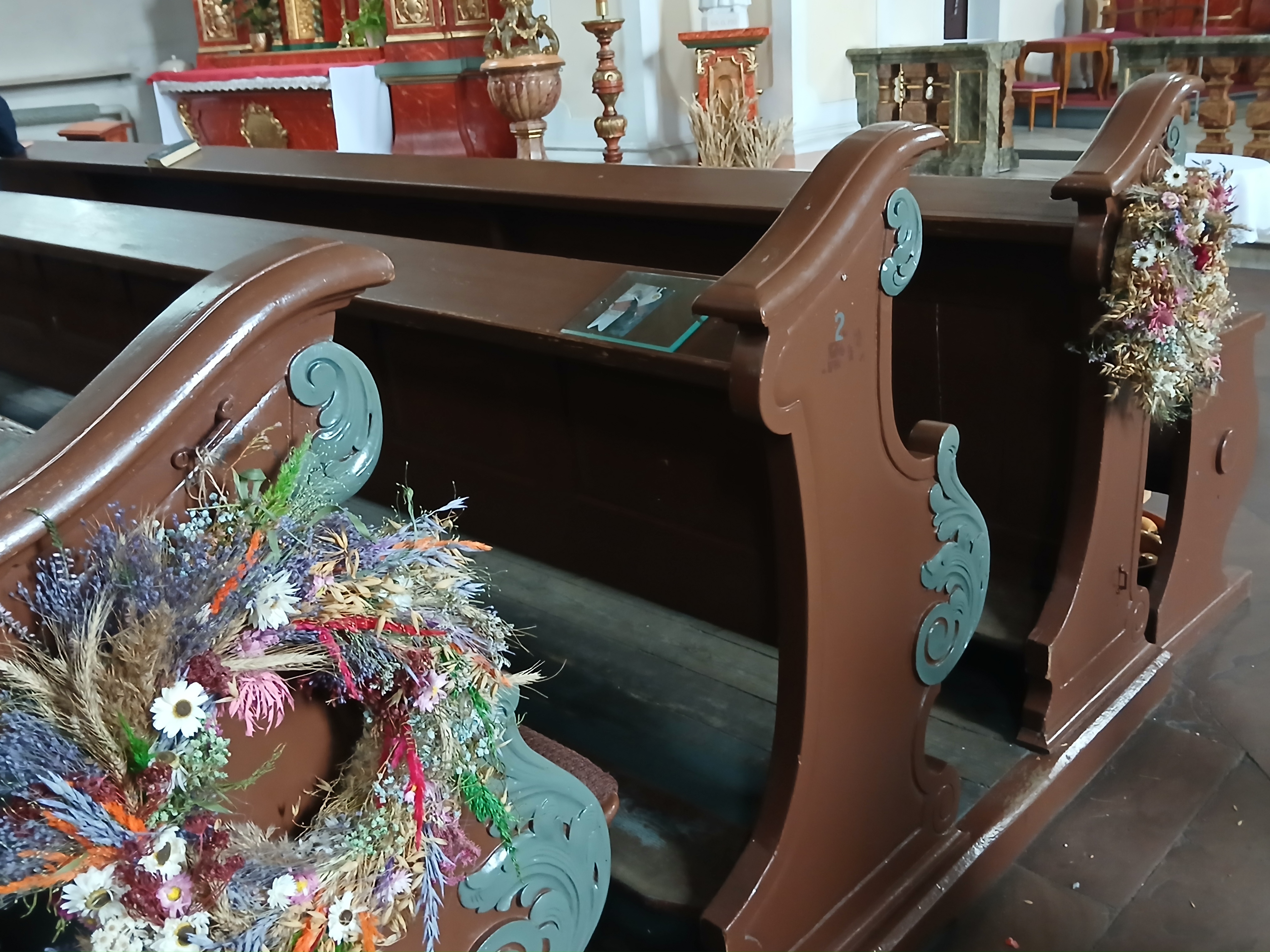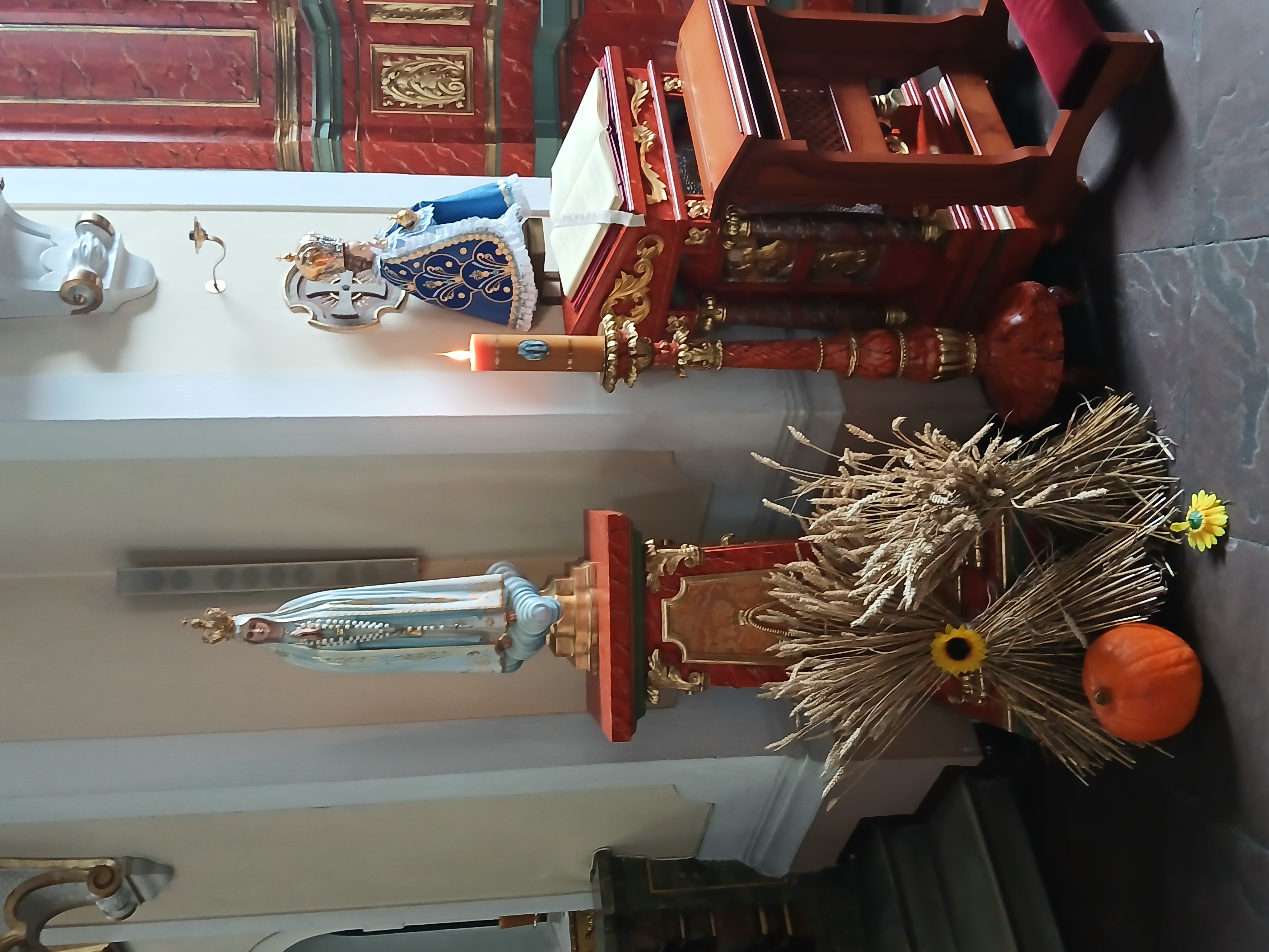 Przed ołtarzem przy koronie zostały ustawione kosze z darami ziemi, za które parafianie dziękowali Bogu, a przy ławkach w nawie glównej zawieszone zostały piękne wianuszki wykonane przez mieszkanki podczas warsztatów poprowadzonych przez Katrzynę Sklorz. Chleb to podstawa naszego wyżywienia, dlatego należy go szanować i nie marnować.