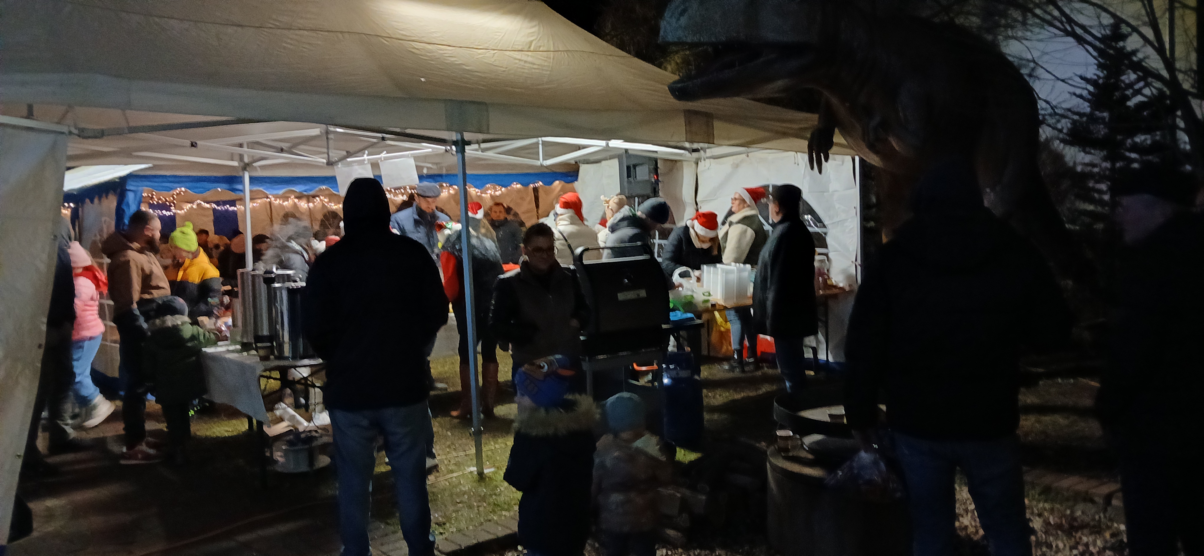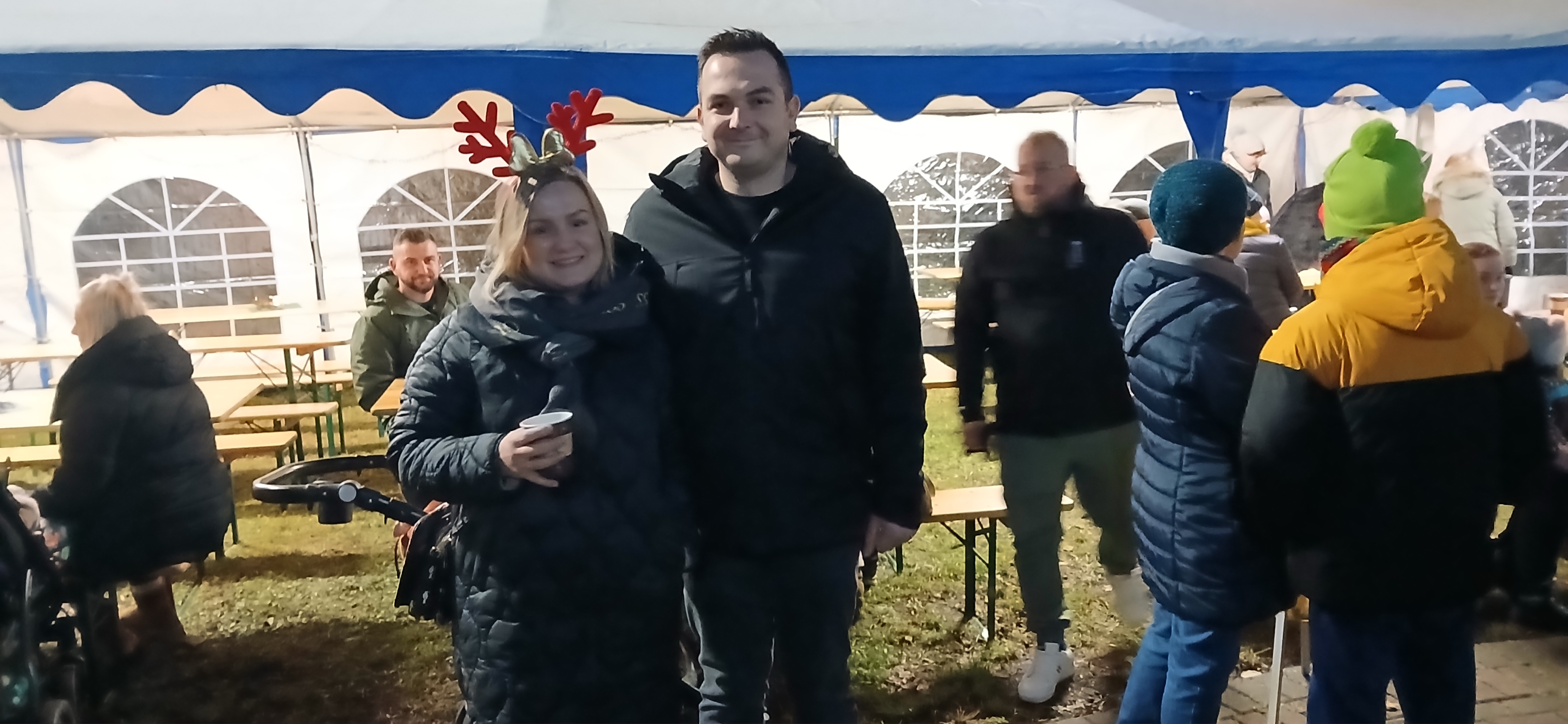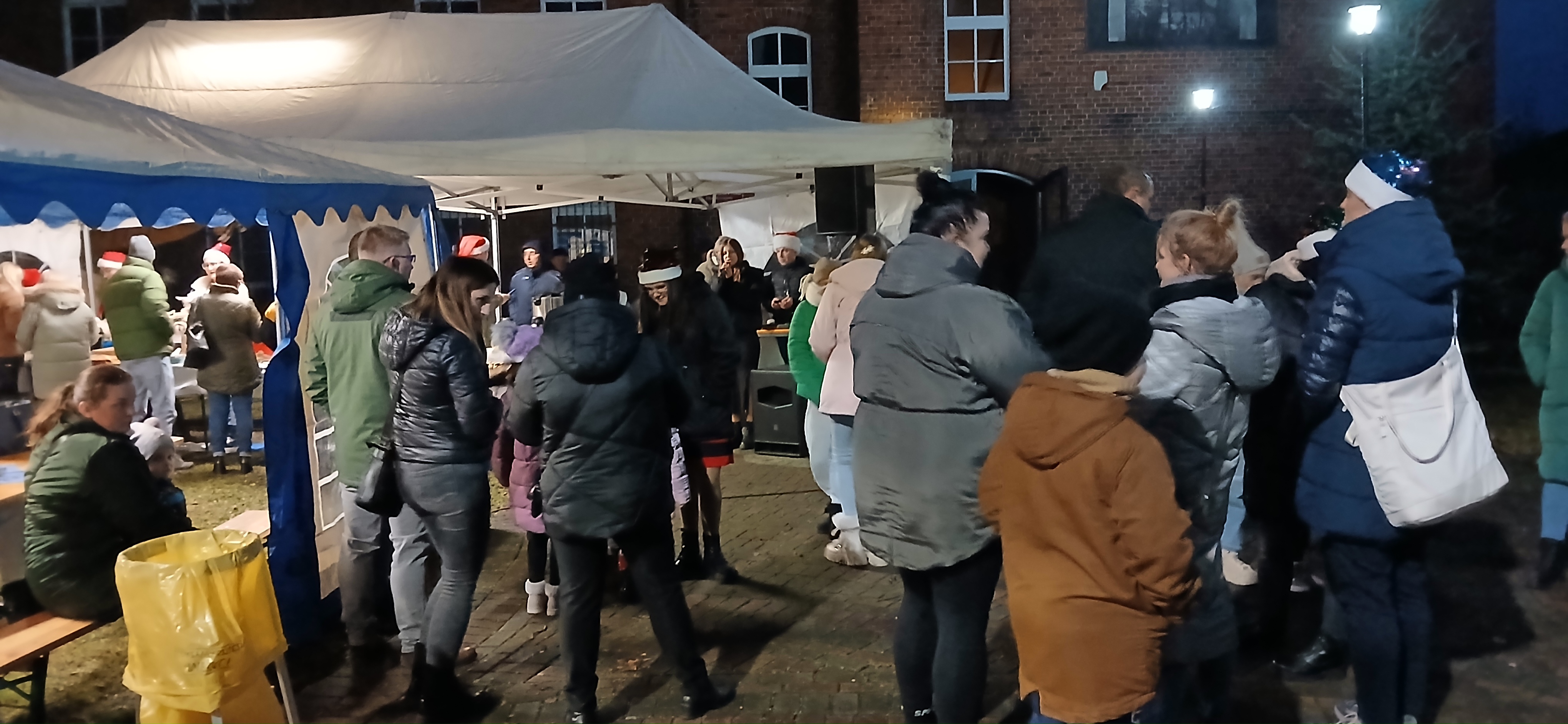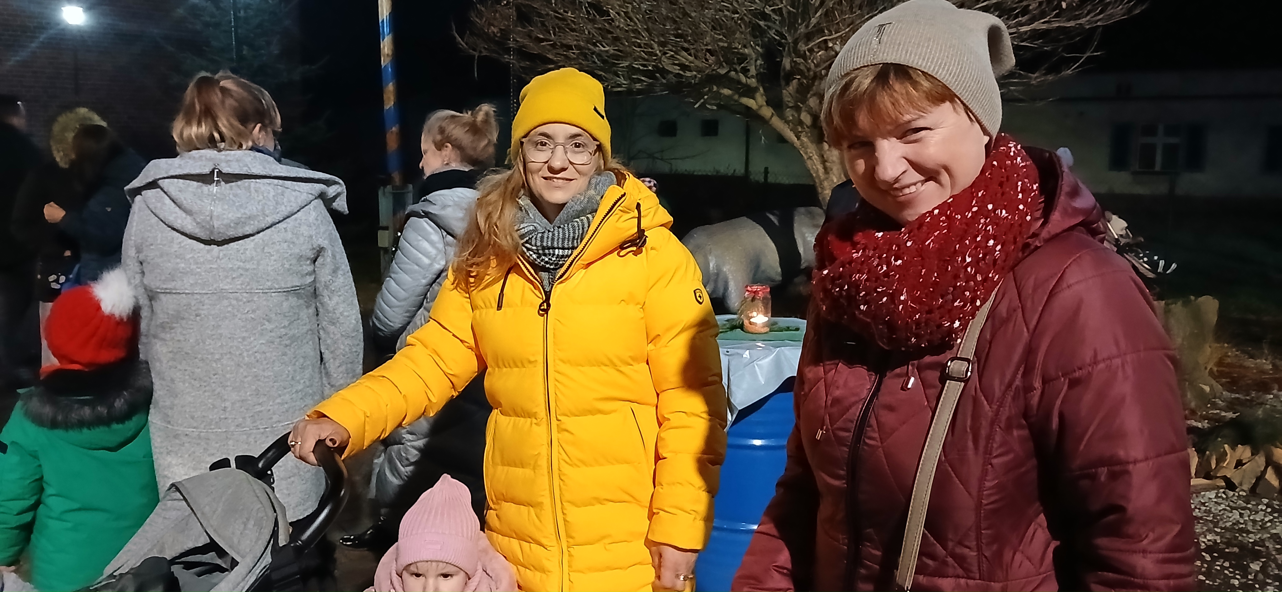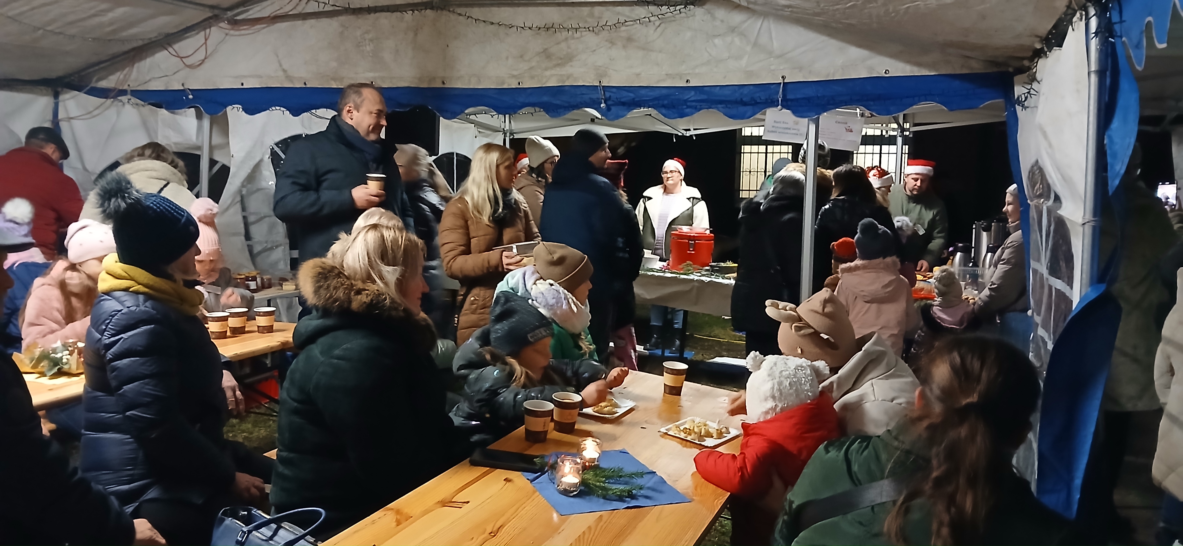 Uroczystym momentem na który wszyscy czekali było rozświetlenie choinki i lampek w namiocie. Nowością było pojawienie się w tym roku podświetlonego jelonka, przy którym rodzice chętnie robili swoim pociechom pamiątkowe zdjęcie. Po kilku godzinach wspólnej  i radosnej biesiady goście rozeszli się do domu, a członkowie Rady Sołeckiej  zabrali się za sprzątanie.  Dziękujemy wszystkim, którzy wnieśli swój wkład w organizację Jarmarku Światecznego, niezawodnemu Janowi Bonkowi, który od lat  ustawia choinkę na placu, zawiesza i podłącza oświetlenie, Tomaszowi Chudali za wysprzątanie liści przed szkołą, Grzegorzowi Pasoniowi za zajęcie się przygotowaniem paczek dla dzieci, Sołtysowi, Radzie Sołeckiej oraz zaangażowanym członkom SMK, którzy pomagali w ustawianiu namiotu, zakupach, przygotowaniu poczęstunku.