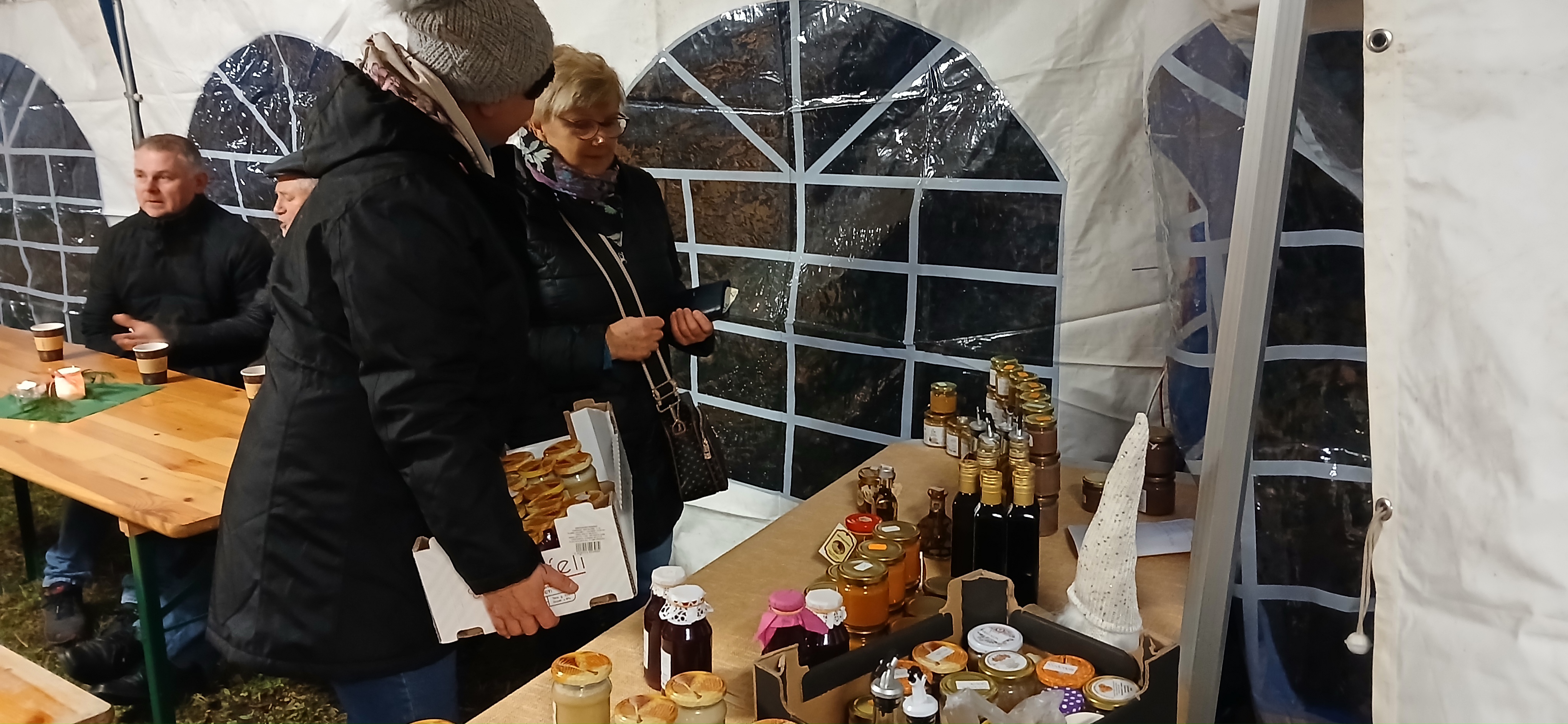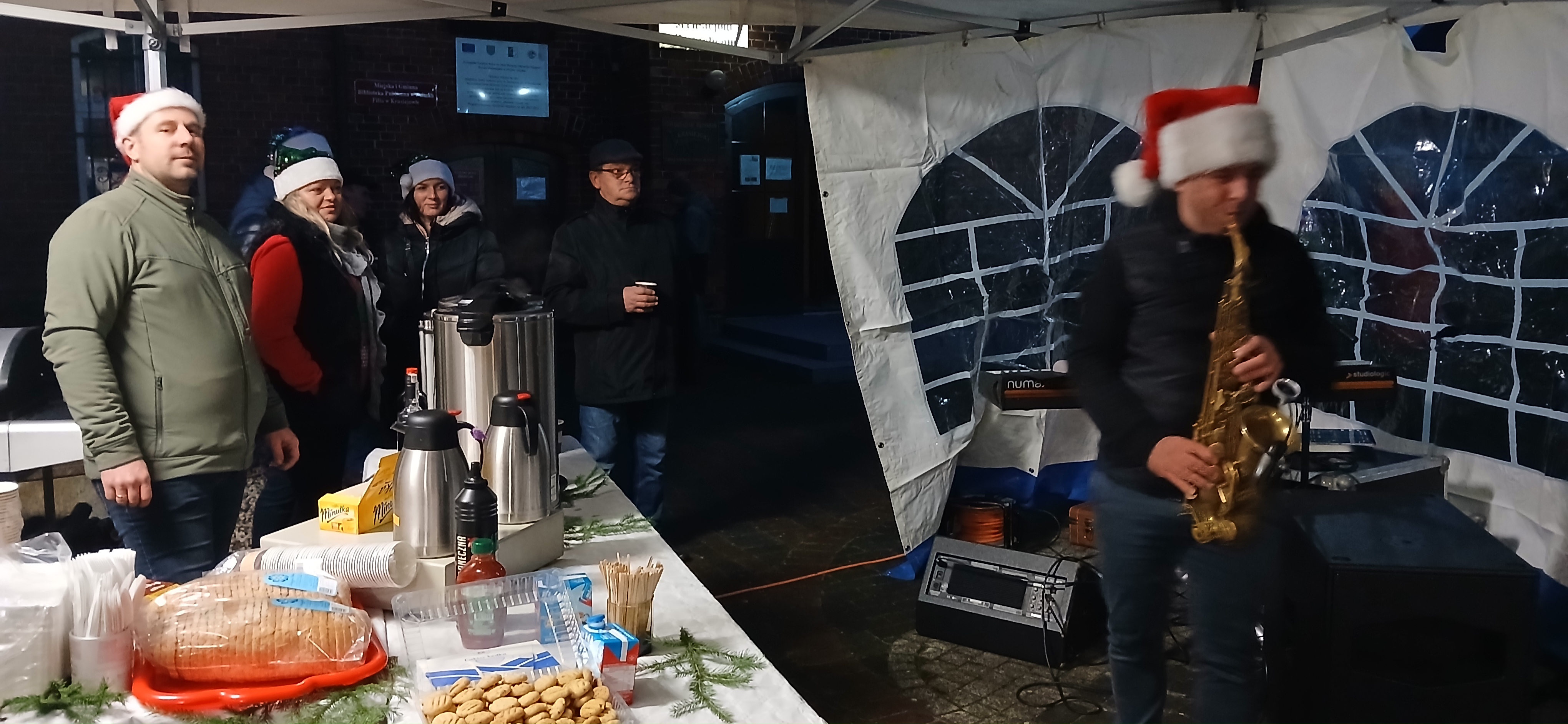 Na stoiskach towarzyszących Jarmarkowi  pojawiły się regionalne przysmaki: pierogi, bigos, barszcz, kiełbaski z grilla, ciepłe napoje, domowe ciasta i desery, które cieszyły się ogromnym powodzeniem. Swoje wyroby wystawiła Pasieka Leśne Skrzaty. Wśród nich znalazły się miody tradycyjne i z ziołami, soki, musztardy i musy owocowe, zdrowe oleje. Oprawą muzyczną imprezy zajął się  Łukasz Pasieka, który zachwycał solówkami na saksofonie. W kolędowej atmosferze przybyli goście prowadzili rozmowy, smakowali potraw i oczekiwali na przybycie Mikołaja. Ten, witany oklaskami, przyniósł ze sobą kosze prezentów dla dzieci sprawiając im ogromną radość.