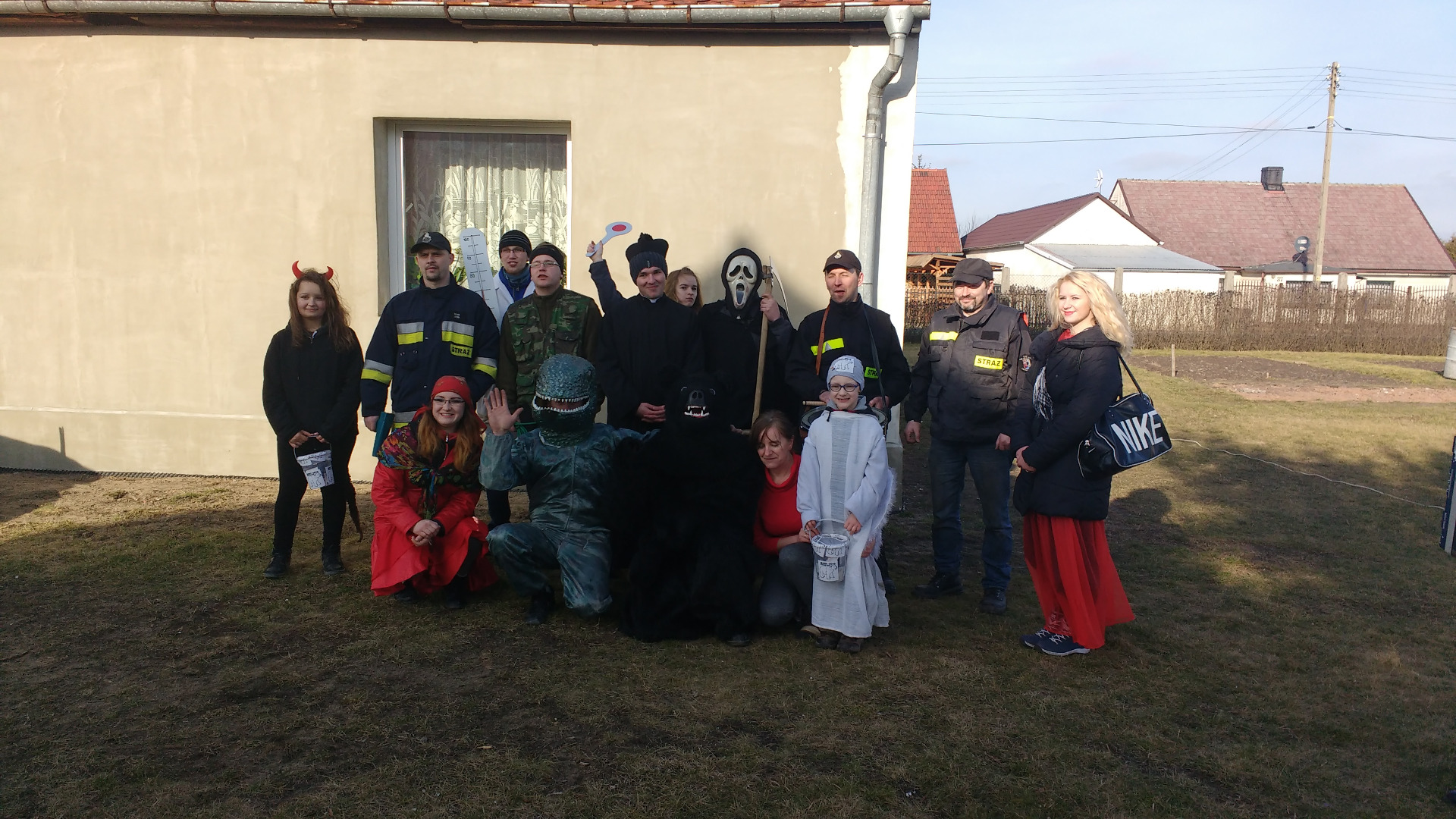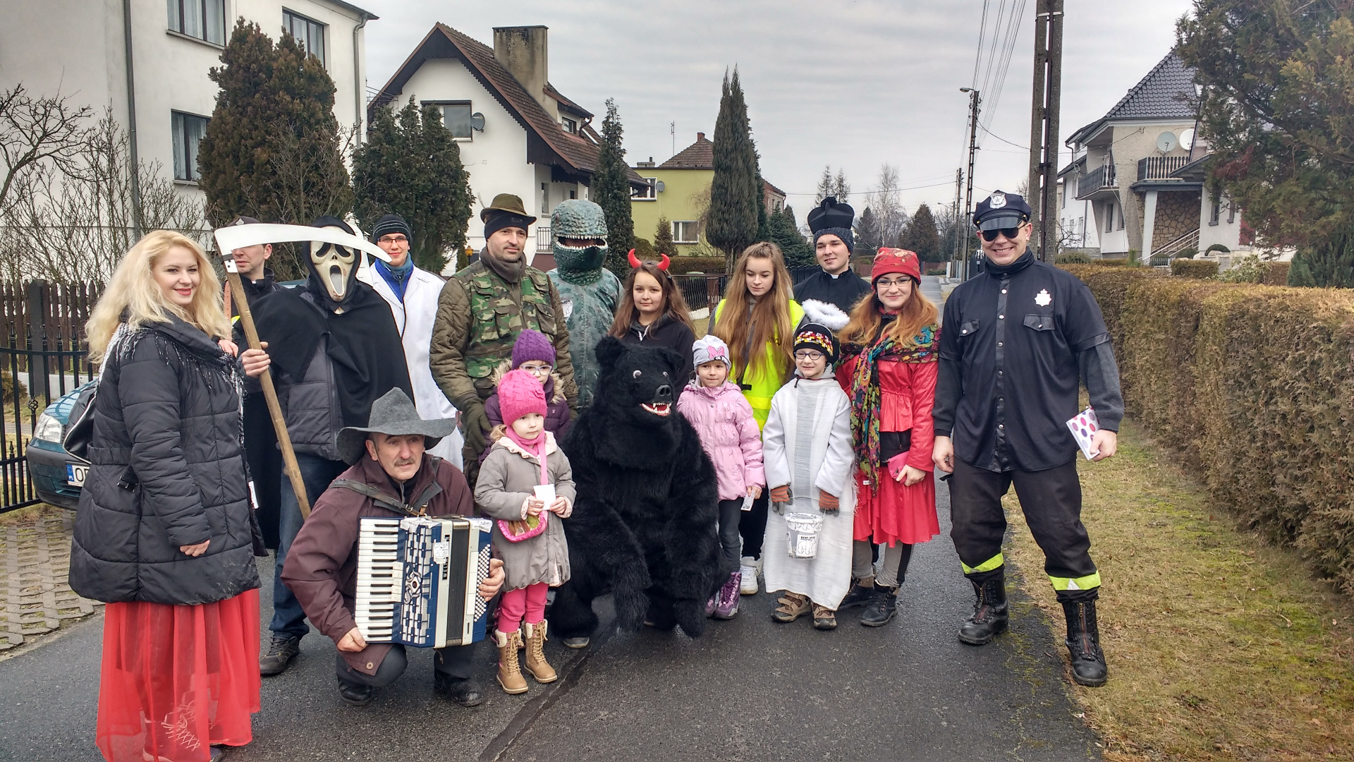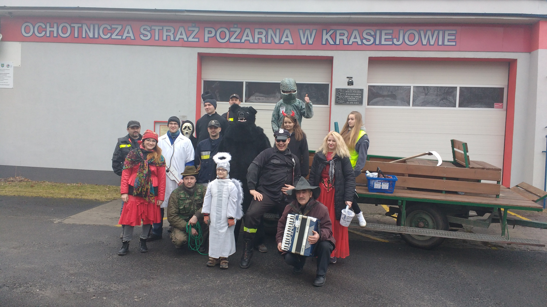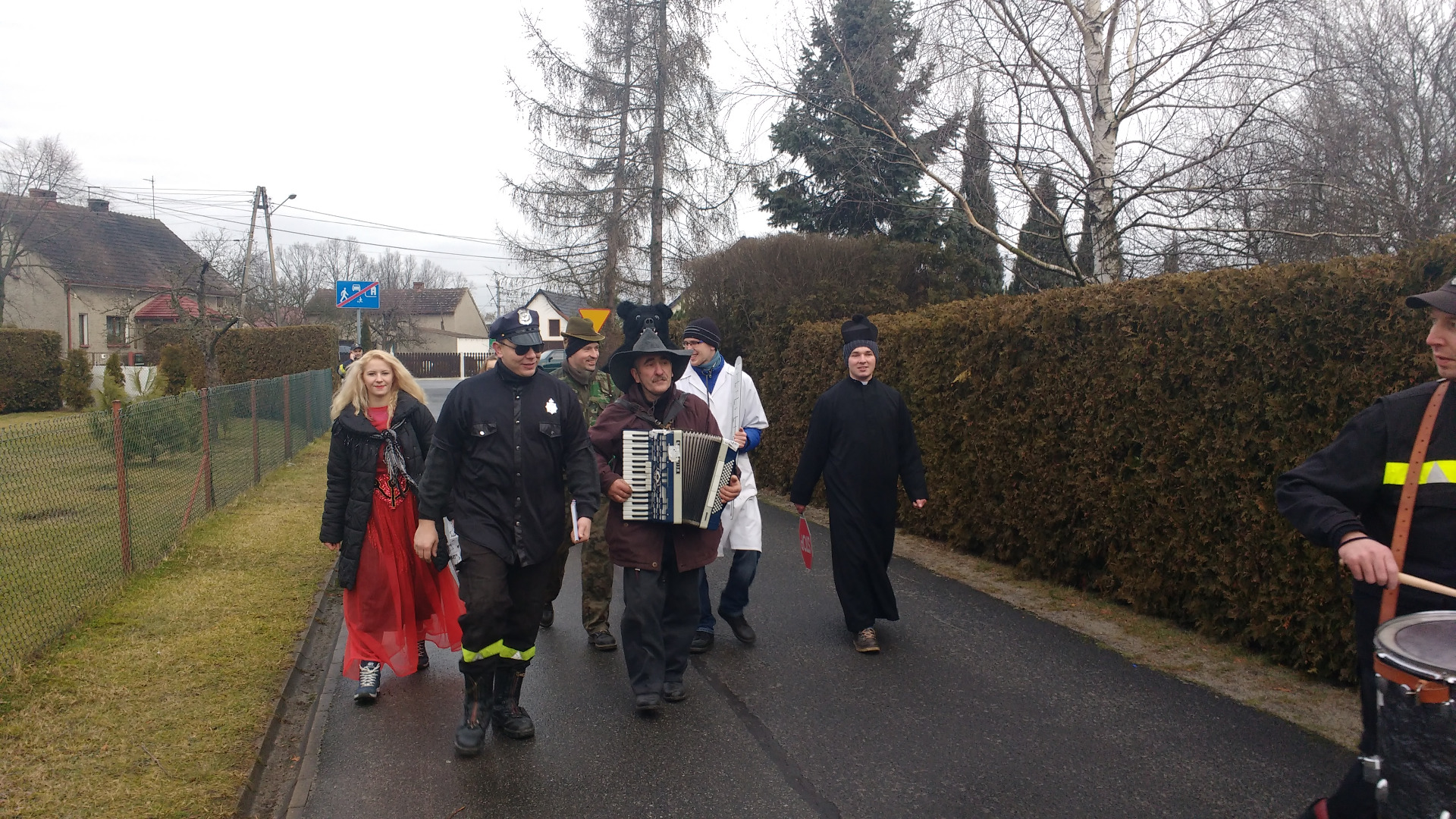 Oprócz głównego bohatera – bera, zgodnie z krasiejowską tradycją, w orszaku nie mogło zabraknąć dinozaura. Niedźwiedź prowadzony przez leśniczego tańczył z gospodynią, przytulał gospodarzy oraz dzieci, by zapewnić domostwu szczęście i dostatek. Lekarz rzetelnie badał mieszkańców i wypisywał recepty na darmowe, magiczne lekarstwa. Kominiarz, brudząc sadzą, sprawdzał drożność kominów. Cyganki chętnie przyjmowały wszelkie datki, a policjanci skrzętnie notowali wszelkie skargi i żale mieszkańców, którym winny, oczywiście, jest ber. A to za mało śniegu, a to brak dobrych dróg, a to choroba – wszystko to wina misia. Patrole drogówki nie zapomniały o kierowcach, którzy otrzymywali mandaty za brudne samochody i nieistniejące naruszenia przepisów w ruchu drogowym. W orszaku nie zabrakło także śmierci, księdza oraz aniołka. Korowód odwiedzał mieszkańców do godz. 18:00 , po czym sprawiedliwie osądził niedźwiedzia. Dziękujemy wszystkim mieszkańcom Krasiejowa za gościnność, miłe przyjęcie korowodu i wszelkie datki, które przekazane zostaną na działalność naszej OSP, a tym samym na zwiększenie bezpieczeństwa mieszkańców.