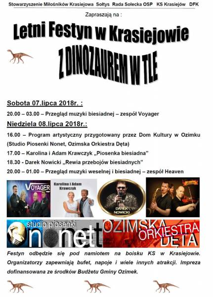 W dniach 7-8 lipca 2018r. odbył się w Krasiejowie tradycyjny "Festyn Letni". Choć większość uczestników sobotniego wieczoru przybyła dopiero po zakończonym meczu piłki nożnej, to wszyscy bawili się bardzo dobrze do późnych godzin nocnych w rytm muzyki biesiadnej zespołu "Voyager" (więcej)...