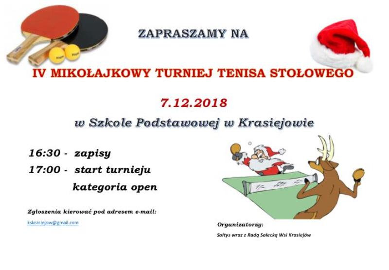 W "IV Mikołajkowym Turnieju Tenisa Stołowego", który odbył się dnia 7.12.2018r. w Szkole Podstawowej w Krasiejowie wzięło udział 27 zawodników. Po zaciętej walce i mocnym zaangażowaniu biorących udział w turnieju, wyłoniono zwycięzców: pierwsze miejsce zajął Tomasz Wiśniewski, drugie- Krzysztof Zyga, a trzecie - Michał Dropała. Organizatorem zawodów z ramienia Rady Sołeckiej wsi Krasiejów był Mateusz Pinkawa...