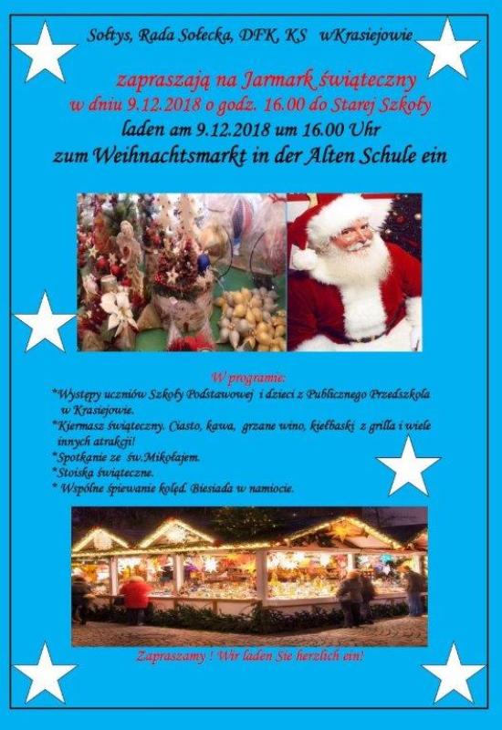 Sołtys, Rada Sołecka, DFK i Klub Sportowy w Krasiejowie zapraszają na "Jarmark świąteczny - Weihnachtsmarkt", który odbędzie się 9.12.2018r. o godz. 16.00 w "Starej Szkole". W programie są występy dzieci, kiermasz świąteczny, spotkanie z Mikołajem, wspólne kolędowanie. Będzie możliwość zakupu ciasta, kawy, grzańca, bigosu, kiełbasek z grilla i pizzy.