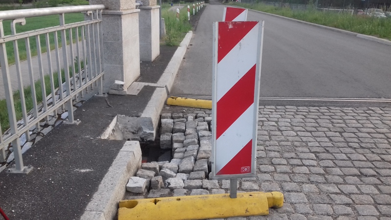 Od ponad miesiąca na małym moście nie udaje się usunąć problemów z odpływem wody opadowej. Nawiasem mówiąc ukazały się one bezpośrednio po oddaniu obiektu do użytku publicznego. Ciekawe, jak długo usunięte kostki i oznakowanie, ostrzegające o przeszkodzie będą stanowić zagrożenie na moście, szczególnie podczas silnych wiatrów, które wywracają słupki.
