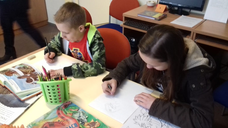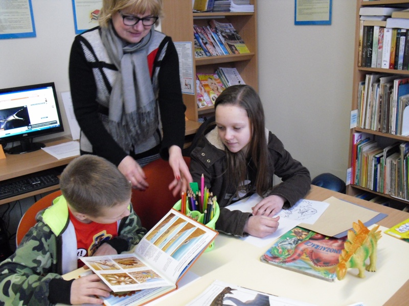 Następnie w bibliotece słuchacze zostali poinformowani o źródłach informacji geograficznej i zapoznani ze stroną www.krasiejow.pl. Na koniec dzieci przystąpiły do prac plastycznych i tworzyły swoje małe dzieła rysując dinozaury, które najbardziej lubią. Podsumowaniem spotkania było wykonanie mapy mentalnej związanej z Krasiejowem. Prowadząca wyróżniła Damiana, który wykazał się największą wiedzą o odkryciach paleontologicznych (już po raz drugi razem z siostrą uczestniczył w warsztatach geologicznych). Zajęcia przygotowała i prowadziła opiekunka Muzeum, zaś pani bibliotekarka zabezpieczyła materiały plastyczne i przygotowała wystawkę książek o interesującej nas tematyce, za co serdecznie dziękujemy. Miłośnicy dinozaurów spędzili ten dzień w miłej i twórczej atmosferze.