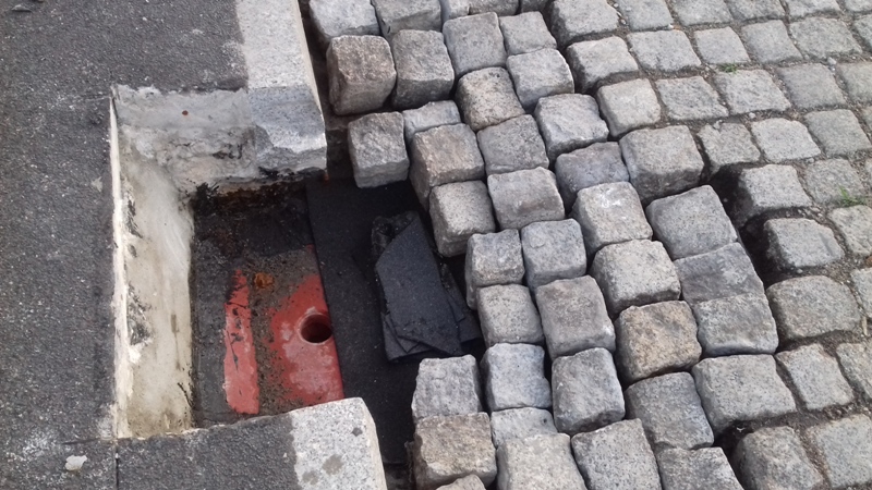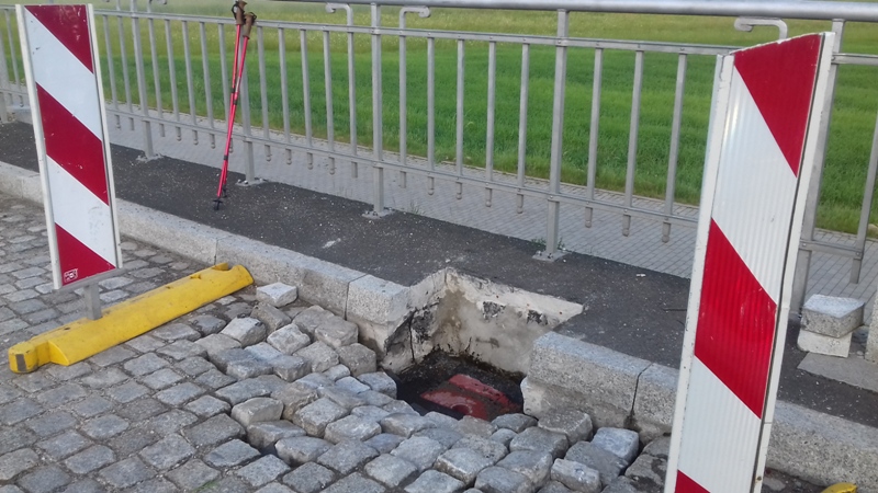 Od miesiąca na wyremontowanym nie tak dawno moście nie udaje się usunąć problemów z odpływem wody opadowej. Nawiasem mówiąc ukazały się one bezpośrednio  po oddaniu obiektu do użytku publicznego. Ciekawe, jak długo usunięte kostki i oznakowanie, ostrzegające o przeszkodzie będą stanowić zagrożenie na moście, szczególnie  podczas silnych wiatrów, które wywracają słupki.