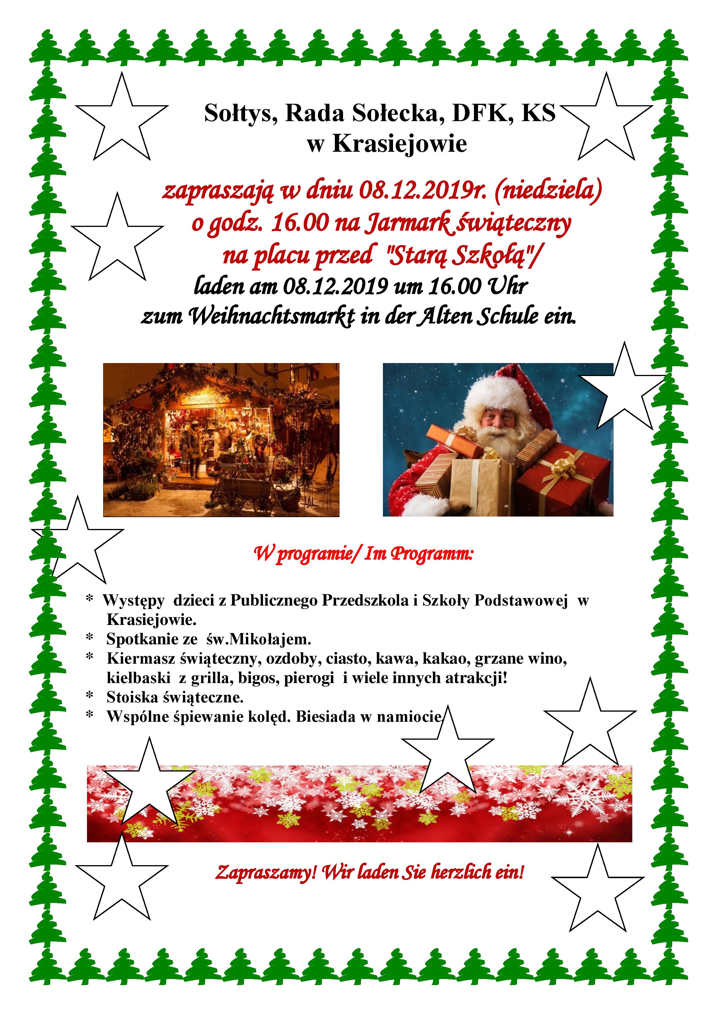 Sołtys, Rada Sołecka, kolo DFK i KS zapraszają mieszkańców na doroczny Jarmark Świąteczny - Weihnachtsmarkt, który odbędzie sie dn. 08.12.w niedzielę o ogdz. 16.00 na placu przed Starą Szkołą w Krasiejowie. W programie spotkanie ze św. Mikołajem, występy przedszkolaków, stoiska z ozdobami świątecznymi, stoisko gastronomiczne z ciastami, gorącymi napojami, bigosem, pierogami. Zapraszamy! Plakat w załączeniu.