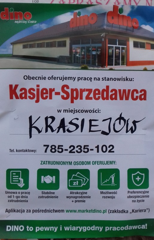 W Krasiejowie na ul. Zamoście niedaleko ronda budowany jest nowy market spożywczy. Sklep należeć będzie do znanej sieci DINO. Patrząc na tempo prac powinien być za kilka miesięcy ukończony i otwarty. Budynek jest już zadaszony, ma wstawione okna i drzwi. Plac przed obiektem jest już wybrukowany kostką.
