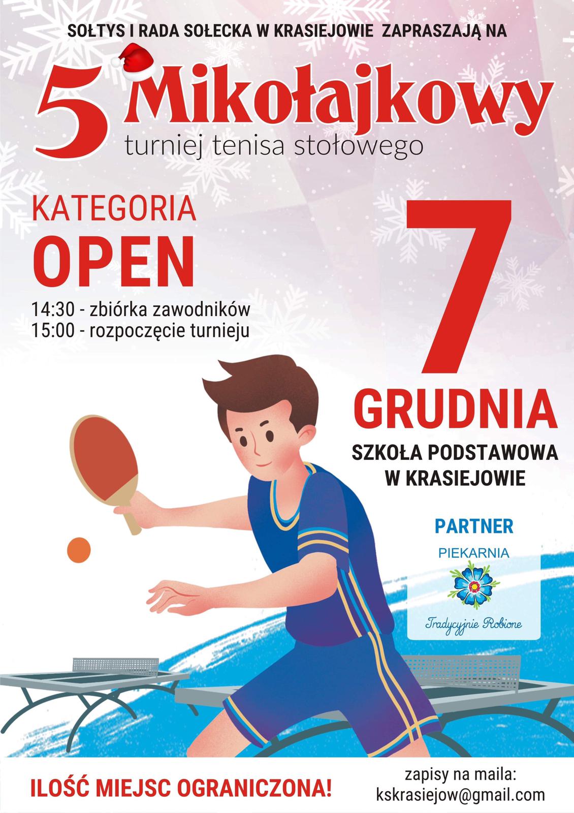 W sobotę dn.07.12.2019r. w  Szkole Podstawowej w Krasiejowie odbył się "V Mikołajkowy Turniej Tenisowy" w kategorii Open zorganizowany przez Sołtysa i Radę Sołecką wsi. Osobą, która koordynowała działania  i prowadziła turniej był Mateusz Pinkawa. W tym roku wzięło w nim udział 20 zawodników. Piersze miejsce w turnieju zajął Michał Dropała, drugie Przemysław Polaczek, trzecie Zbigniew Gruszka. Dziękujemy za pomoc w organizacji turnieju Przemysławowi Polaczkowi i Grzegorzowi Bronder. Puchary zwycięzcom wręczali Sołtys wsi Tadeusz Markulak, Krzysztof Koźlik - Radny Powiatu i Mateusz Pinkawa.