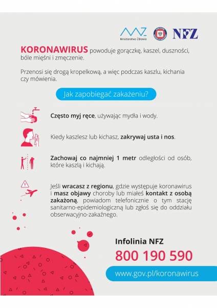 Opolski Oddział Wojewódzki NFZ przekazuje link do strony dotyczący koronawirusa. Na tej stronie będą uaktualniane na bieżąco informacje. W załączeniu plakat i instrukcja.