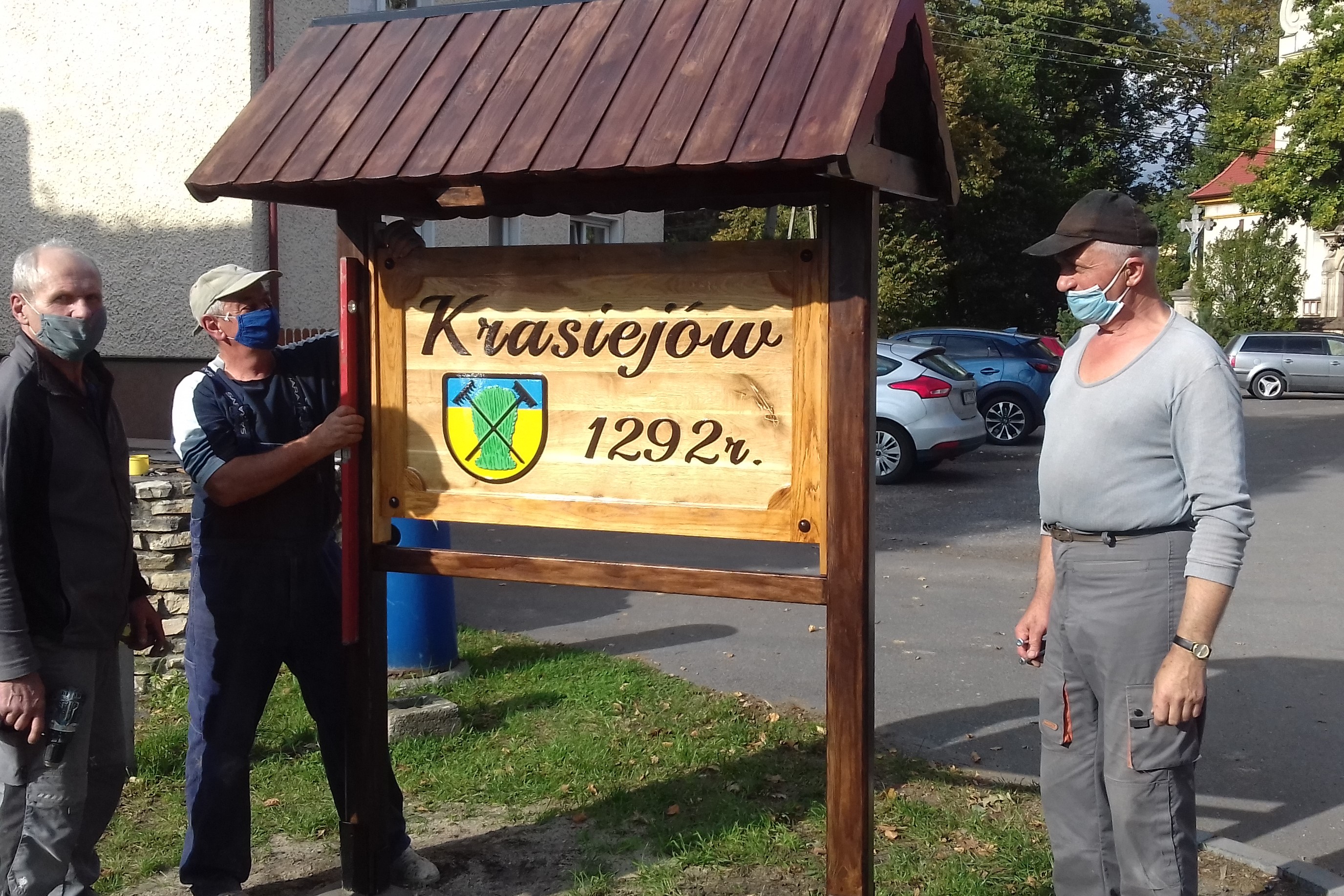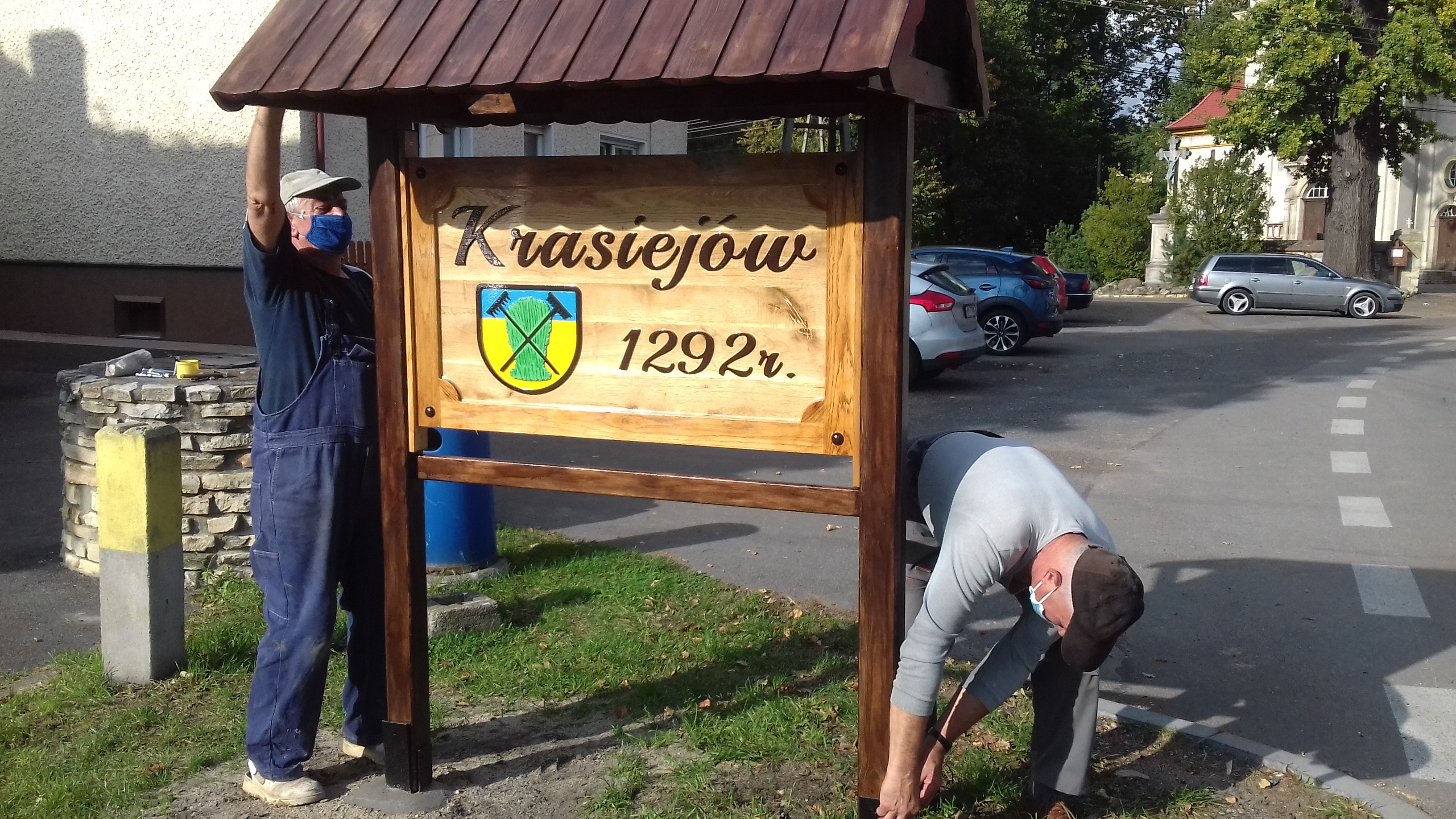 Dnia 10.10. br trzej członkowie Rady Sołeckiej: Jan Sklorz, Jan Bonk i Piotr Szubert ustawili w centrum wsi piękny "witacz". Powstał on niedawno w warsztacie stolarskim pana Jana Sklorza. Dziękujemy!