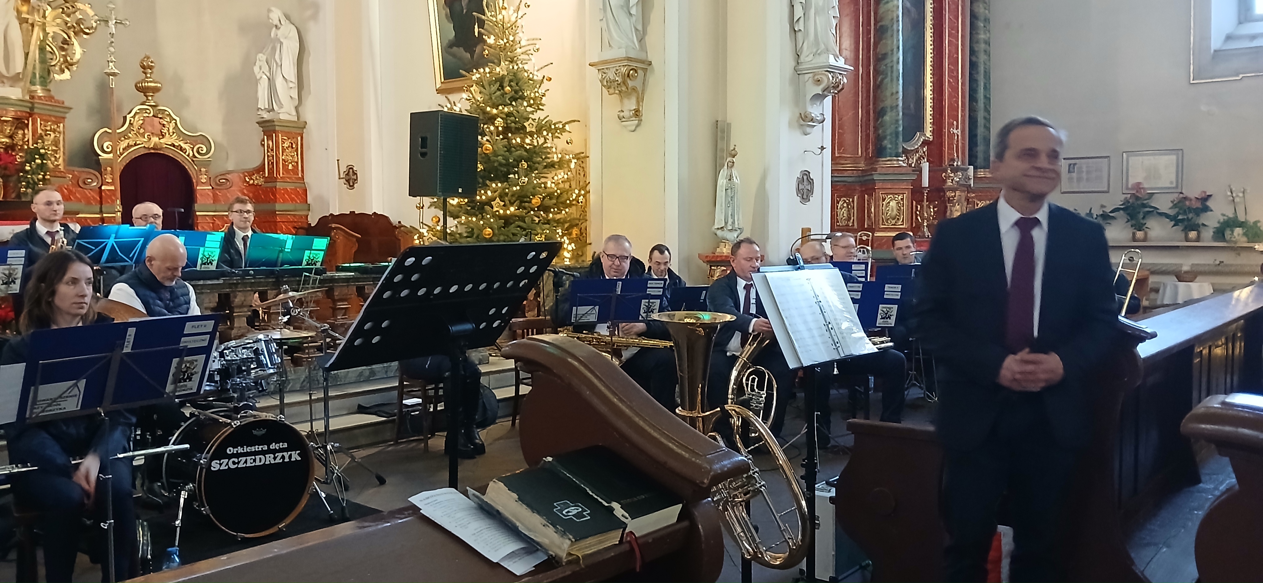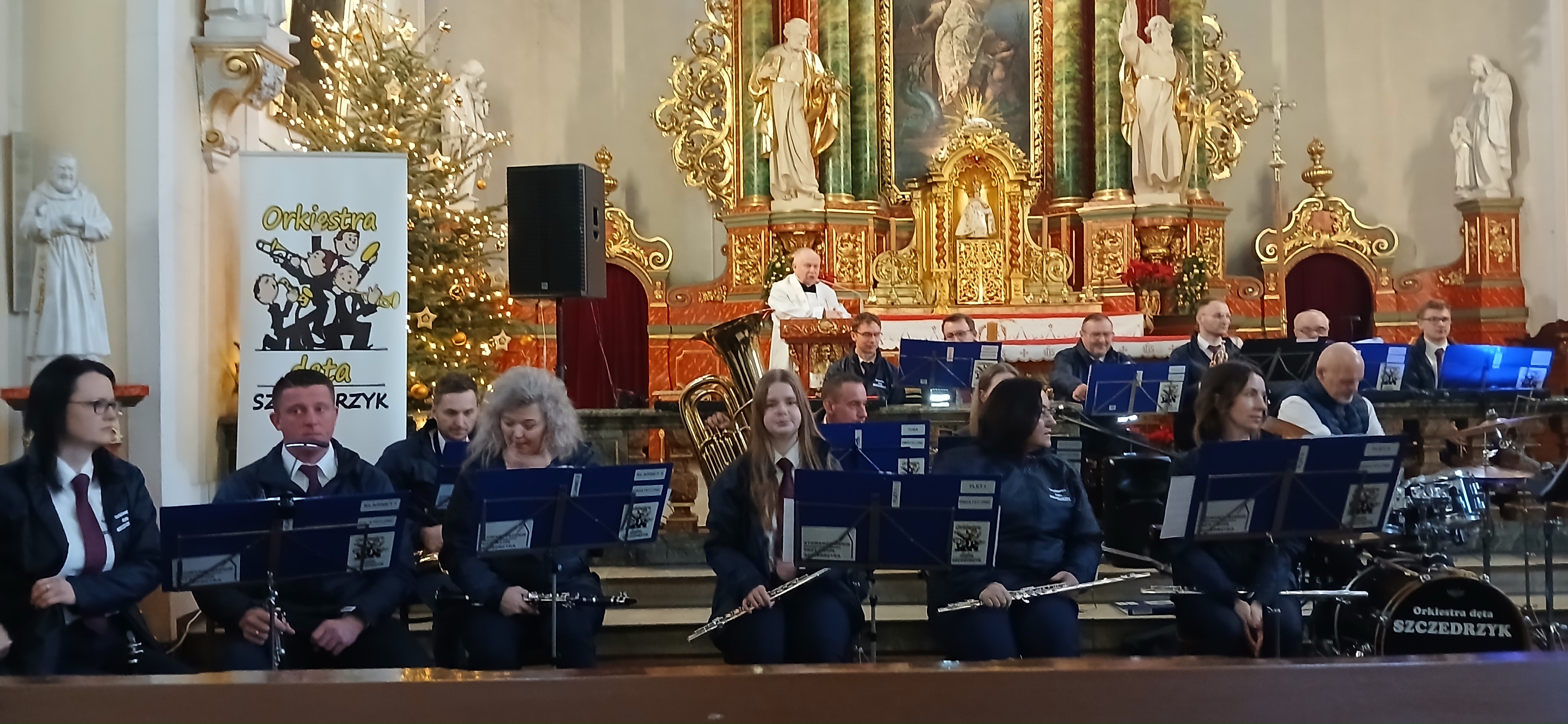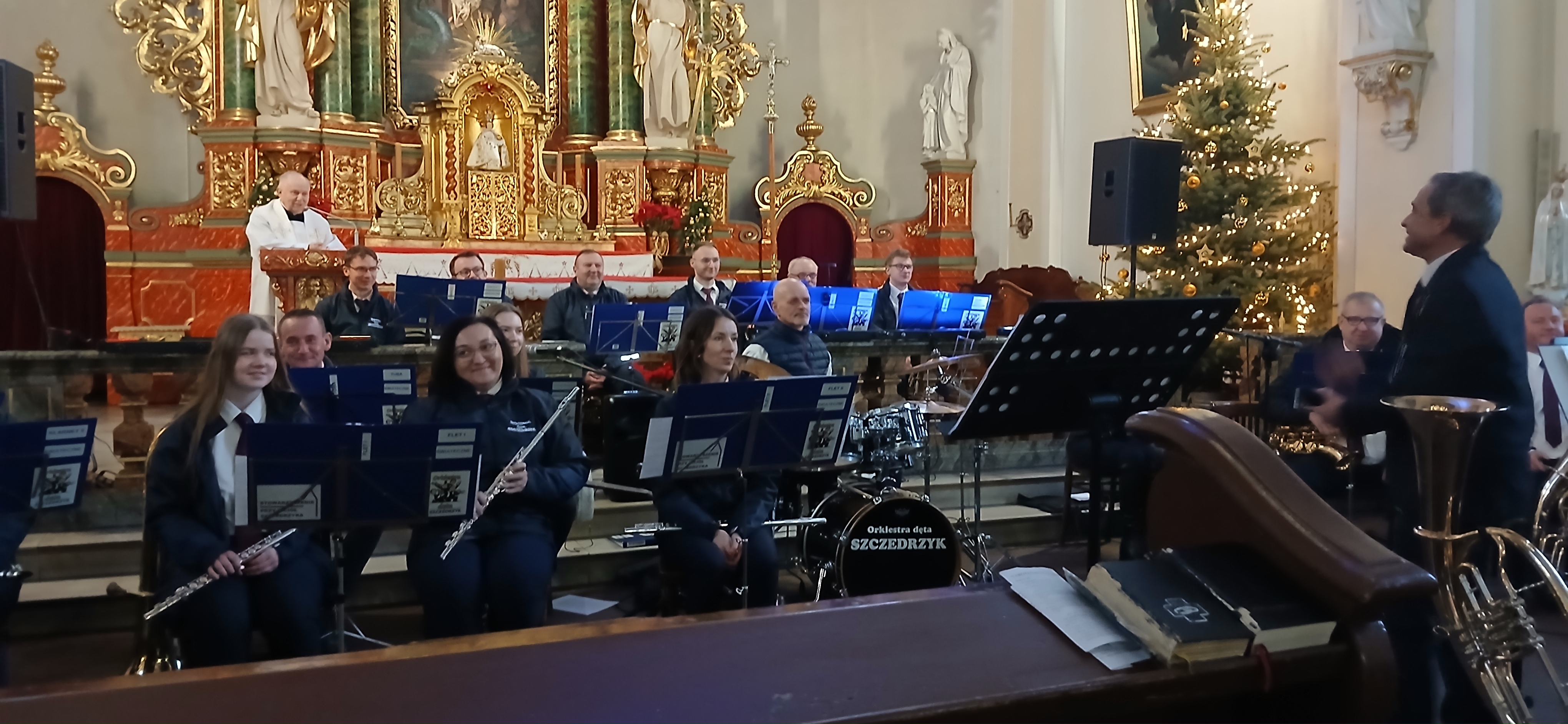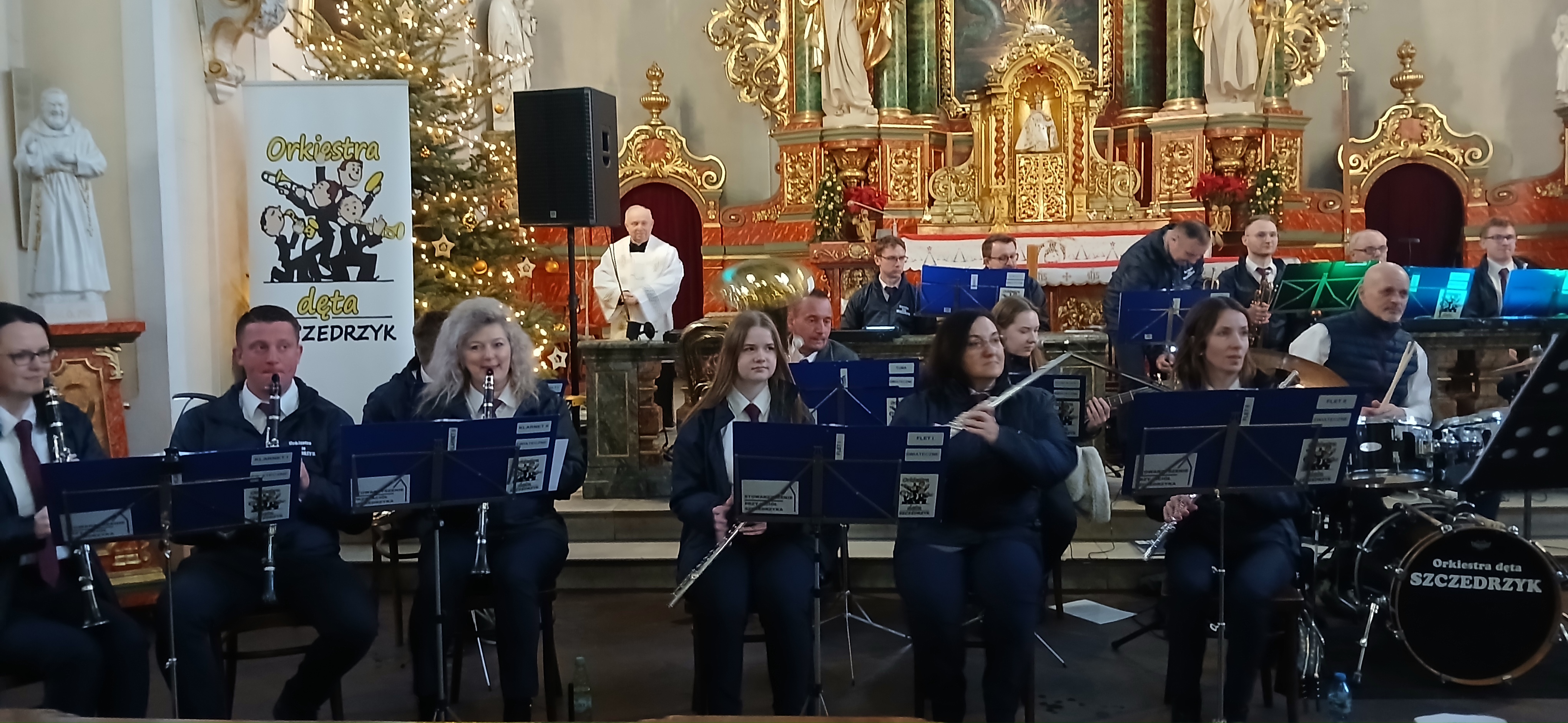 W niedzielne  popołudnie dnia 26 stycznia w naszym parafialnym kościele odbył się świąteczno - noworoczny koncert Orkiestry Dętej Szczedrzyk pod batutą Marka Kulika. Muzycy działający w Stowarzyszeniu Przyjaciół Szczedrzyka przyjechali na zaproszenie księdza Proboszcza Józefa Gorki. Koncert przyciągnał wielu parafian, którzy mieli prawdziwą, ponad godzinną ucztę dla ducha. Muzycy grali kolędy, pastorałki, ale i znane świąteczne standardy muzyczne wzbogacone śpiewem w wykonaniu Norberta Feliksa i Mateusza Mielniczka oraz solówkami instrumetalnymi młodej skrzypaczki Antosi Nowak ze Schodni i trębacza Krystiana Golli. W znanym utwórze "Przekażcie sobie znak pokoju" pięknie zaśpiewała  Zofia Kędziora.