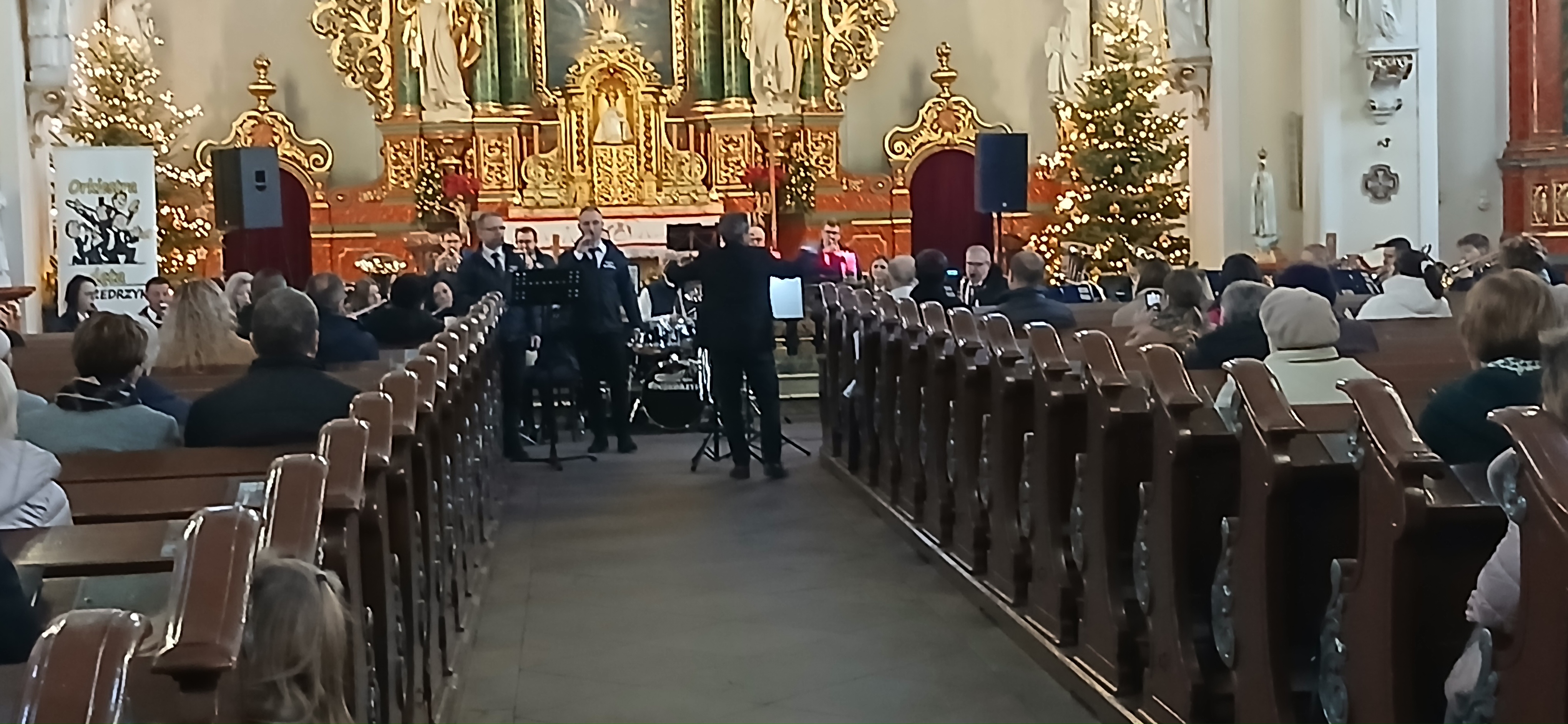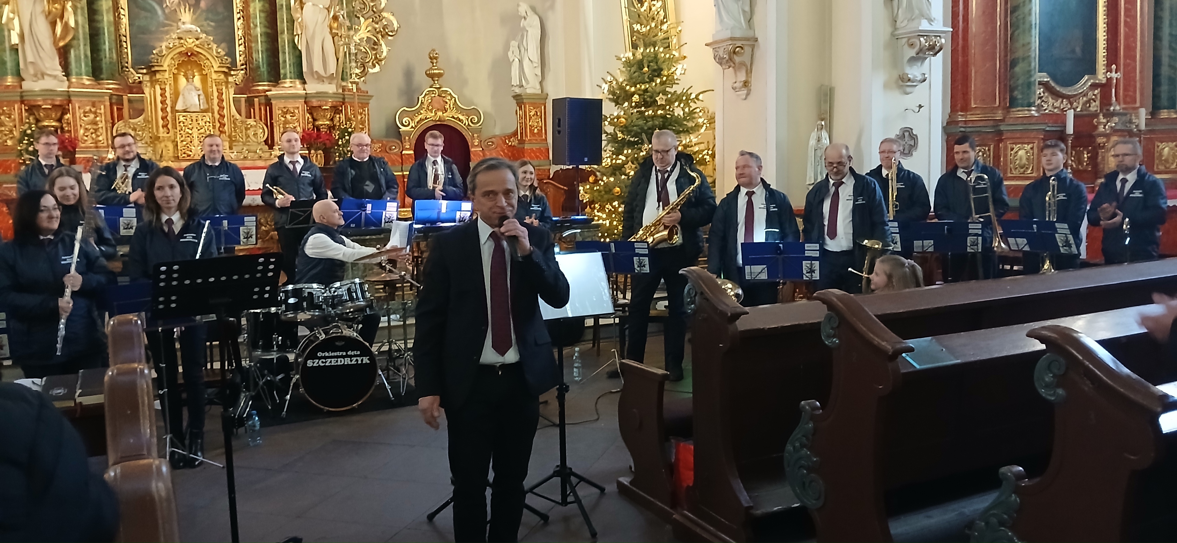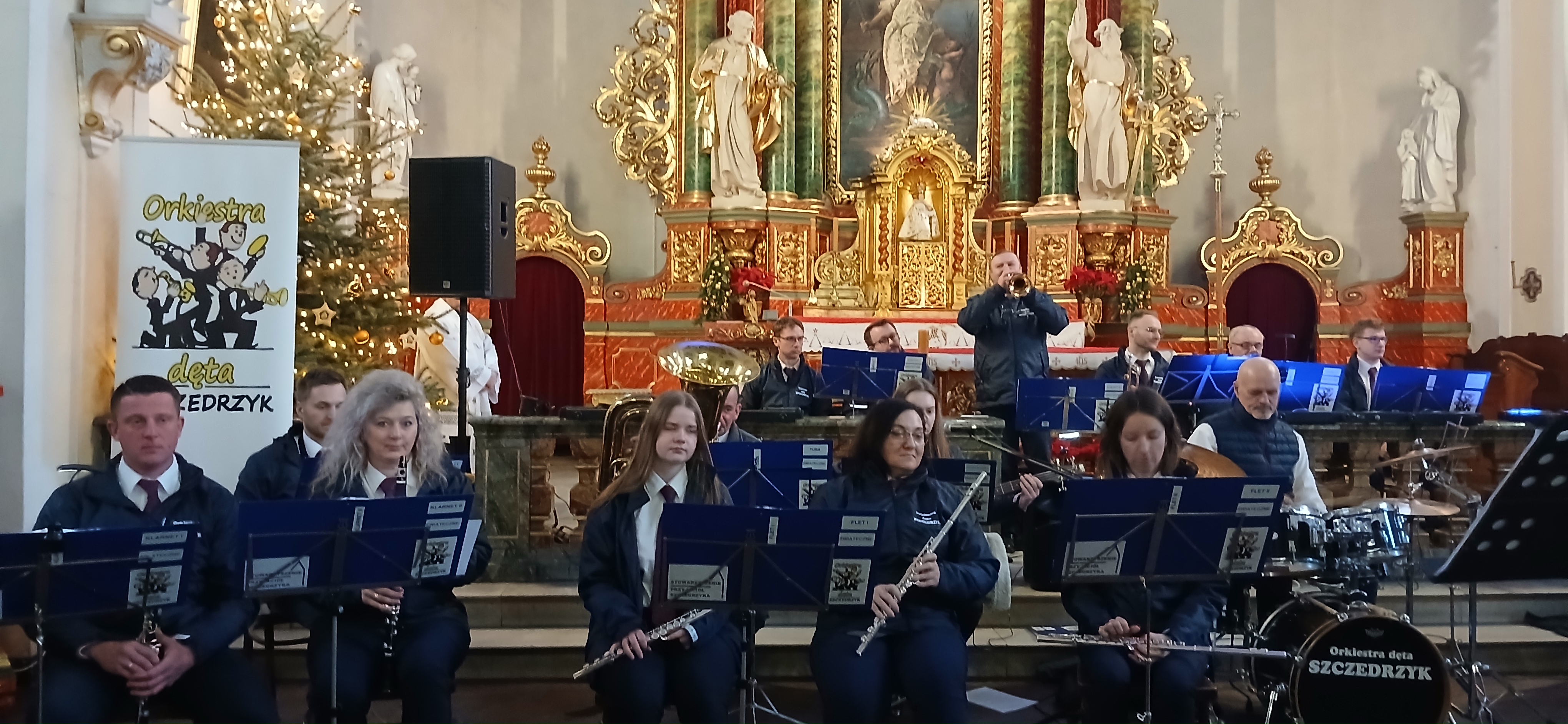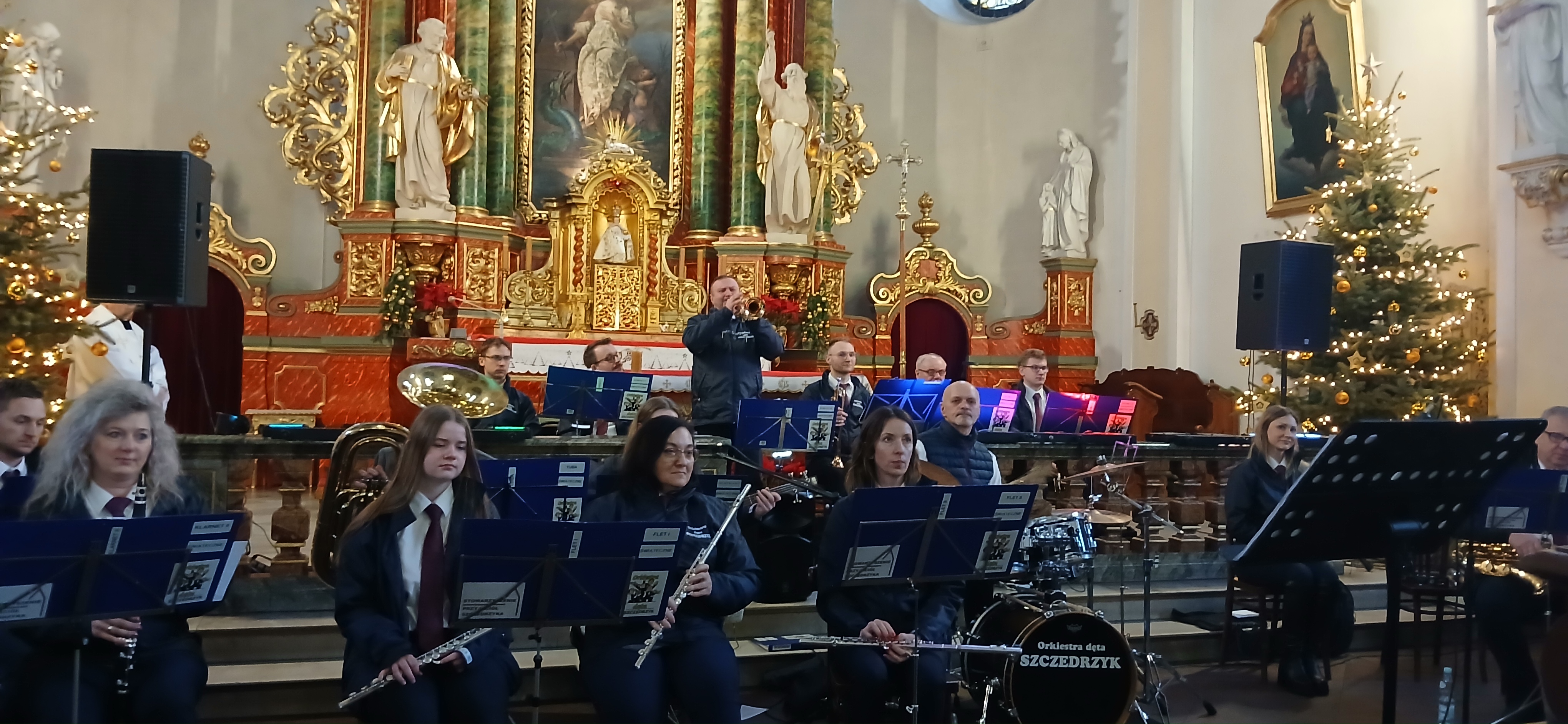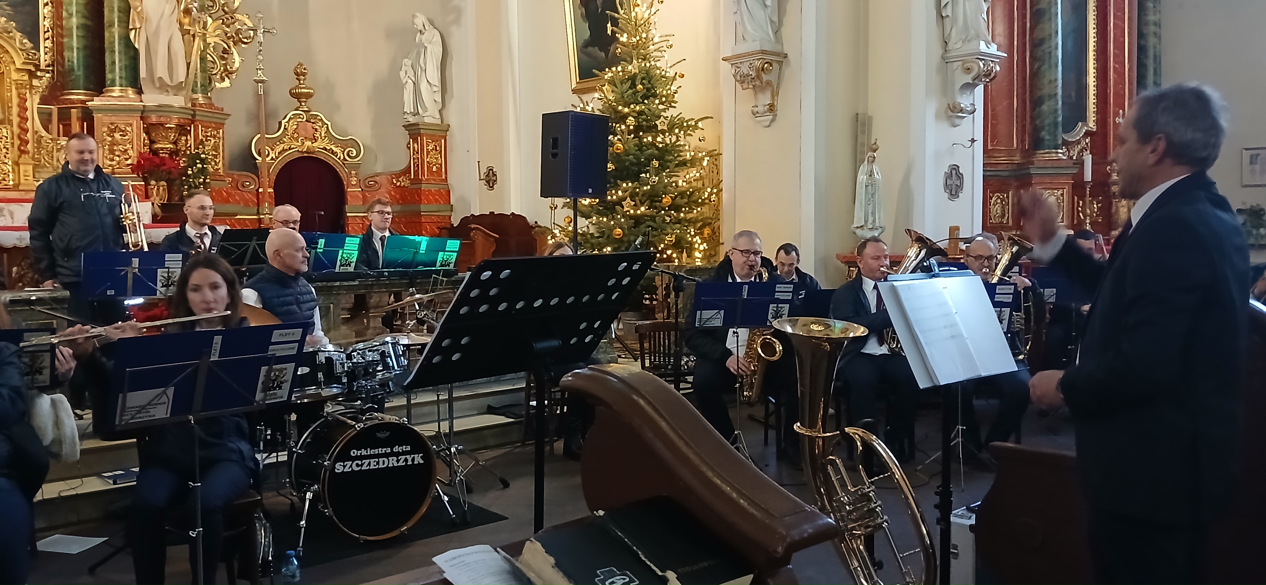 W niedzielne  popołudnie dnia 26 stycznia w naszym parafialnym kościele odbył się świąteczno - noworoczny koncert Orkiestry Dętej Szczedrzyk pod batutą Marka Kulika. Muzycy działający w Stowarzyszeniu Przyjaciół Szczedrzyka przyjechali na zaproszenie księdza Proboszcza Józefa Gorki. Koncert przyciągnał wielu parafian, którzy mieli prawdziwą, ponad godzinną ucztę dla ducha. Muzycy grali kolędy, pastorałki, ale i znane świąteczne standardy muzyczne wzbogacone śpiewem w wykonaniu Norberta Feliksa i Mateusza Mielniczka oraz solówkami instrumetalnymi młodej skrzypaczki Antosi Nowak ze Schodni i trębacza Krystiana Golli. W znanym utwórze "Przekażcie sobie znak pokoju" pięknie zaśpiewała  Zofia Kędziora.