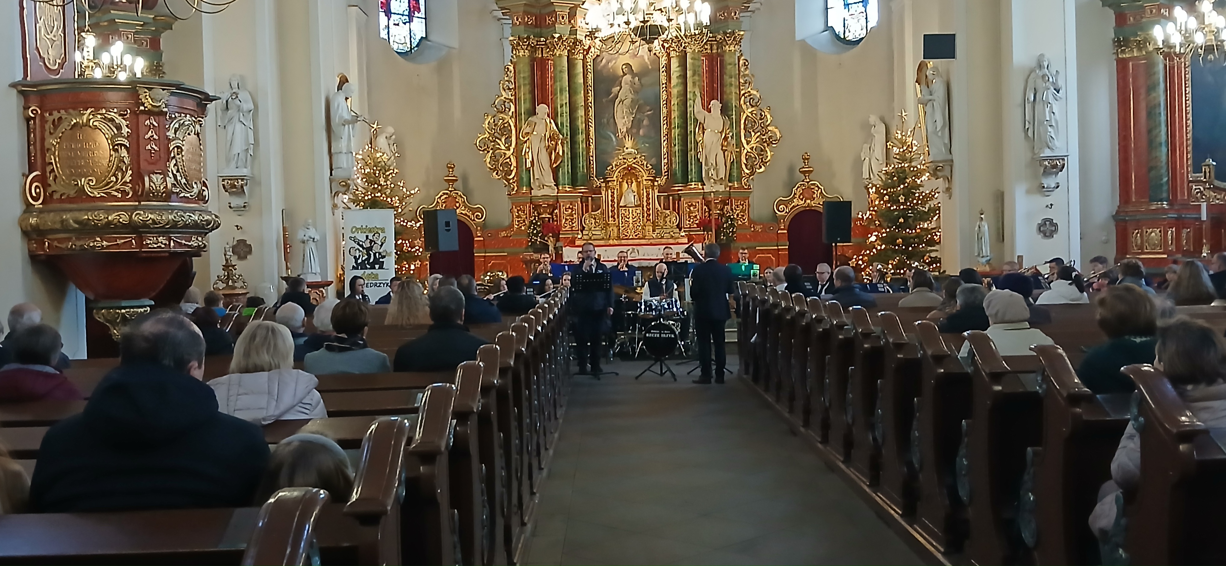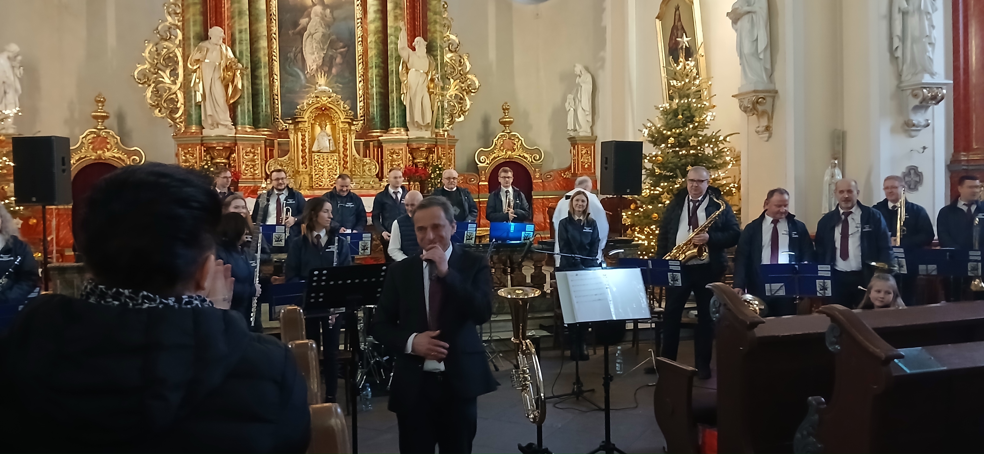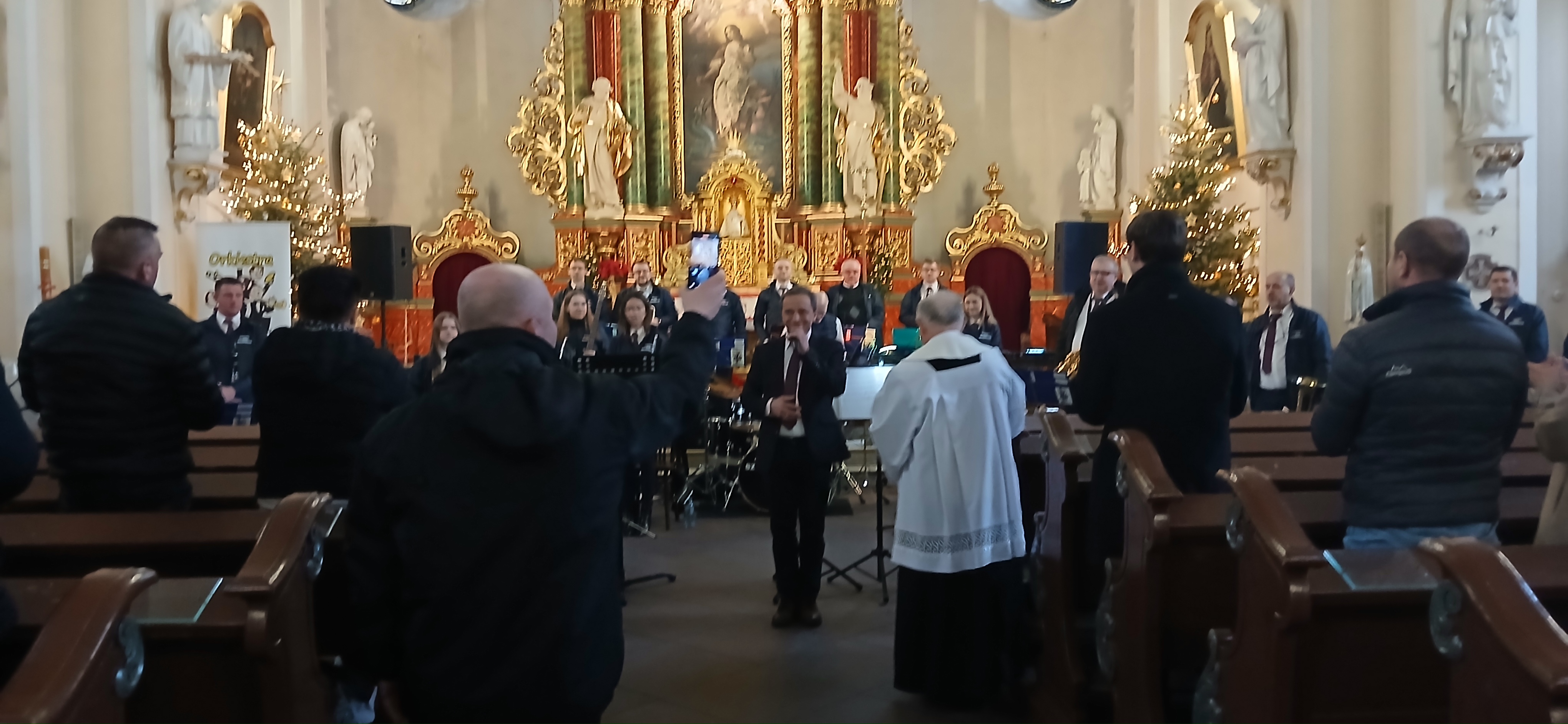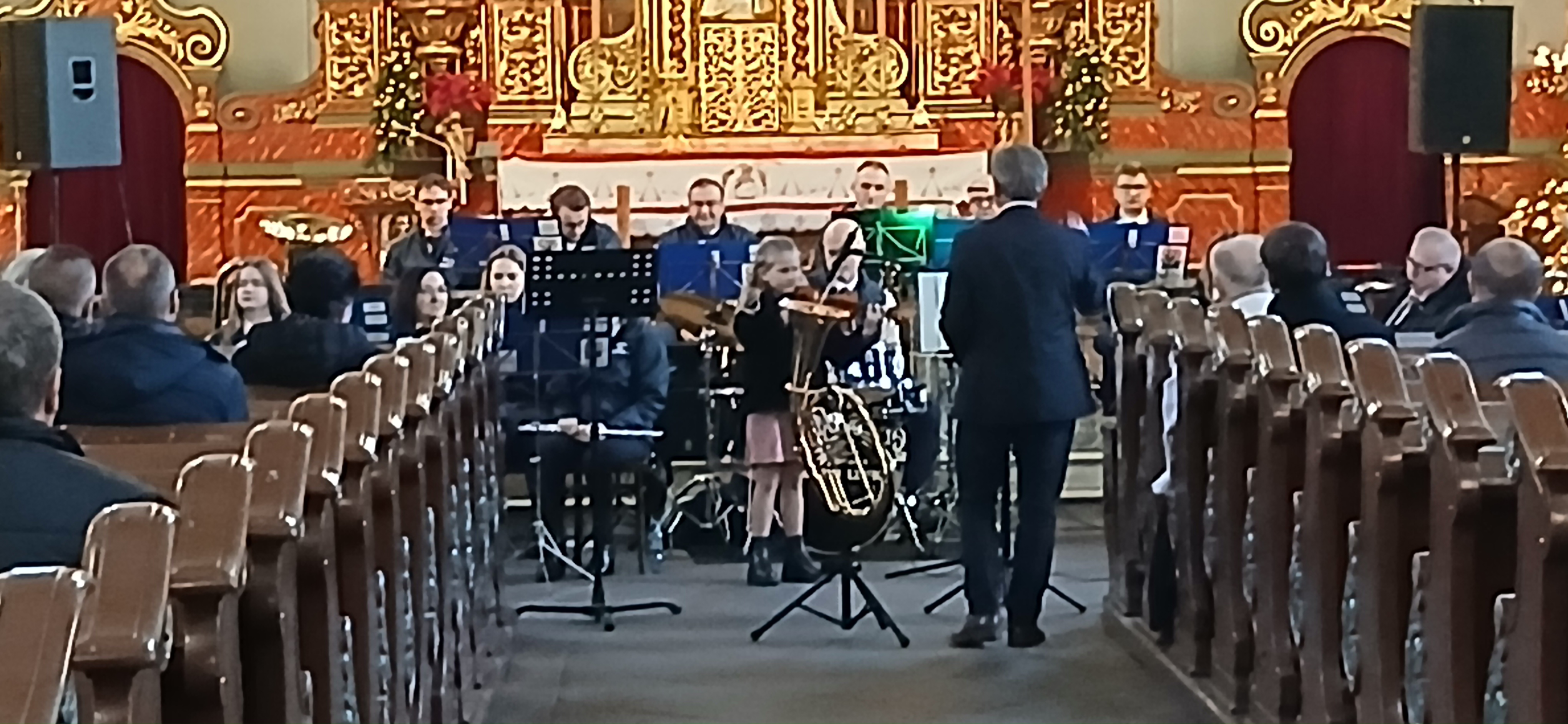 W niedzielne  popołudnie dnia 26 stycznia w naszym parafialnym kościele odbył się świąteczno - noworoczny koncert Orkiestry Dętej Szczedrzyk pod batutą Marka Kulika. Muzycy działający w Stowarzyszeniu Przyjaciół Szczedrzyka przyjechali na zaproszenie księdza Proboszcza Józefa Gorki. Koncert przyciągnał wielu parafian, którzy mieli prawdziwą, ponad godzinną ucztę dla ducha. Muzycy grali kolędy, pastorałki, ale i znane świąteczne standardy muzyczne wzbogacone śpiewem w wykonaniu Norberta Feliksa i Mateusza Mielniczka oraz solówkami instrumetalnymi młodej skrzypaczki Antosi Nowak ze Schodni i trębacza Krystiana Golli. W znanym utwórze "Przekażcie sobie znak pokoju" pięknie zaśpiewała  Zofia Kędziora.