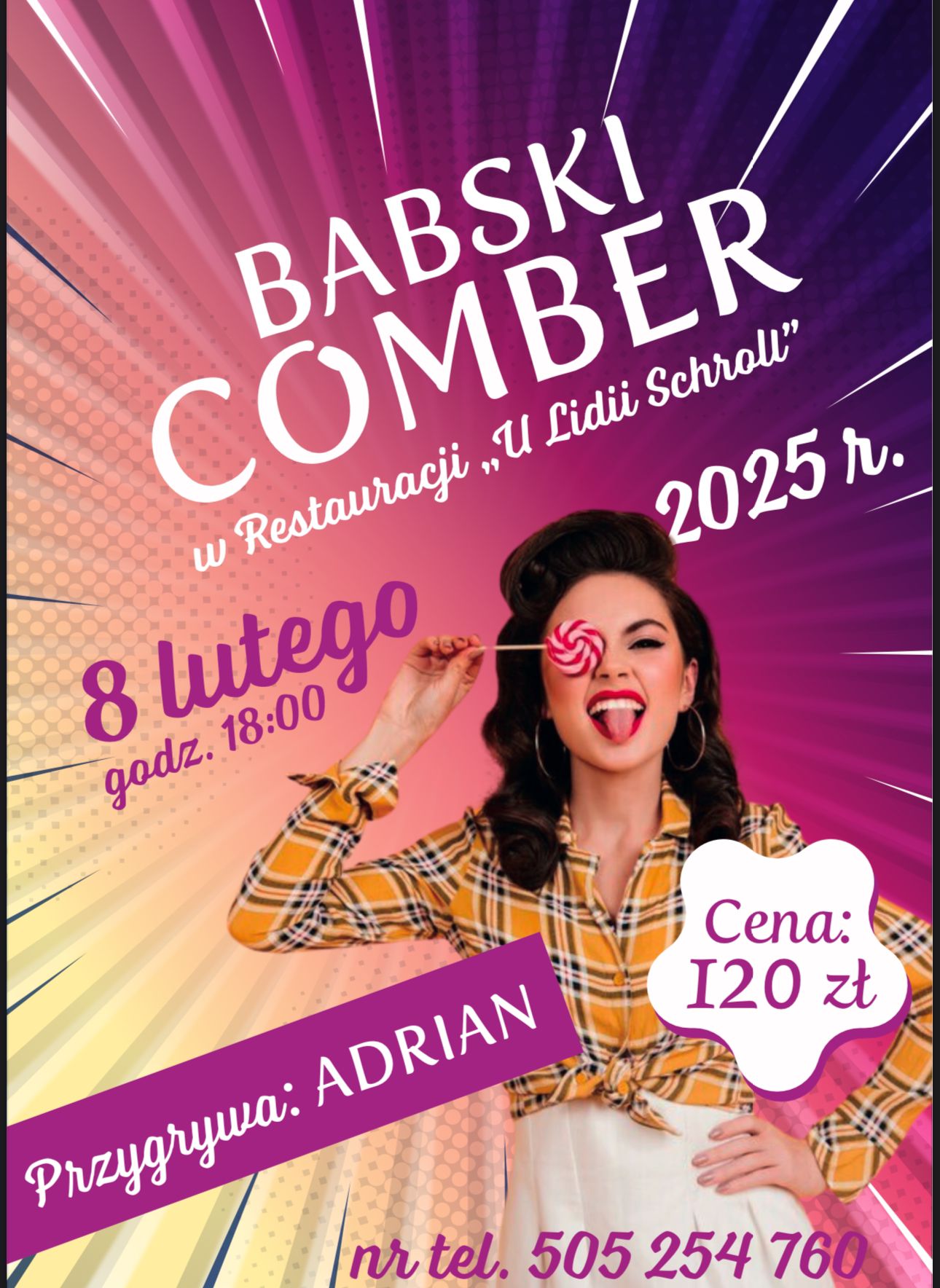 Restauracja Pani Lidii Schroll zaprasza w dniu 8.02 (sobota) o godz. 18.00 na Babski Comber. Koszt imprezy 120 zł. Zgłoszenia proszę kierować do Panii Lidki na nr tel. 505 254 760. Do tańca przygrywać będzie Adrian. Zapraszamy!