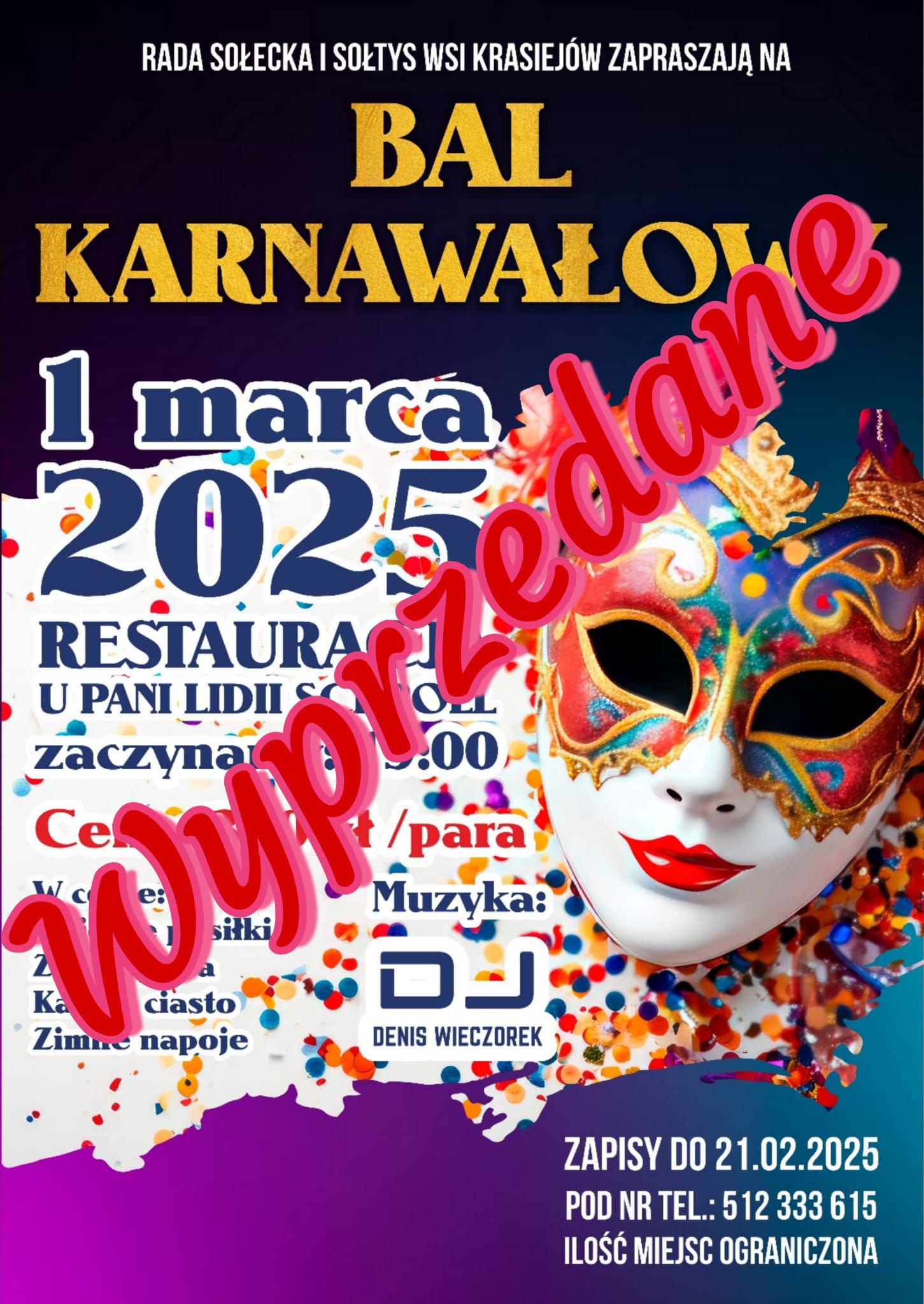 Rada Sołecka i Sołtys wsi Krasiejów zorganizowali zabawę karnawałową dla mieszkańców wsi. Impreza odbyła się w Restauracji u pani Lidii Schroll. Wszystkie bilety wstępu rozeszły się szybko jak przysłowiowe "ciepłe bułeczki". Zabawa okazała się wspaniałą imprezą integrującą, podczas której wszyscy uczestnicy się świetnie bawili. Pomysł należy więc powielić w przyszłości.