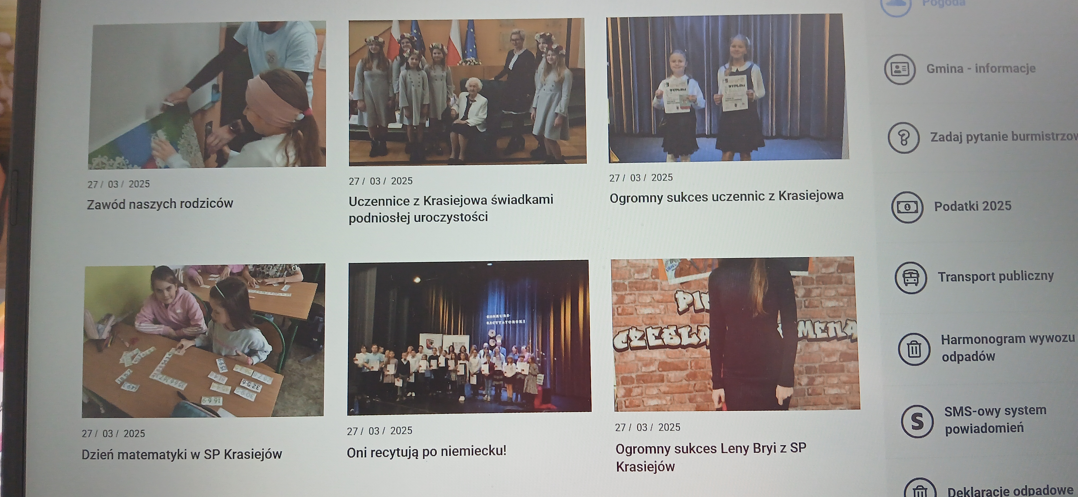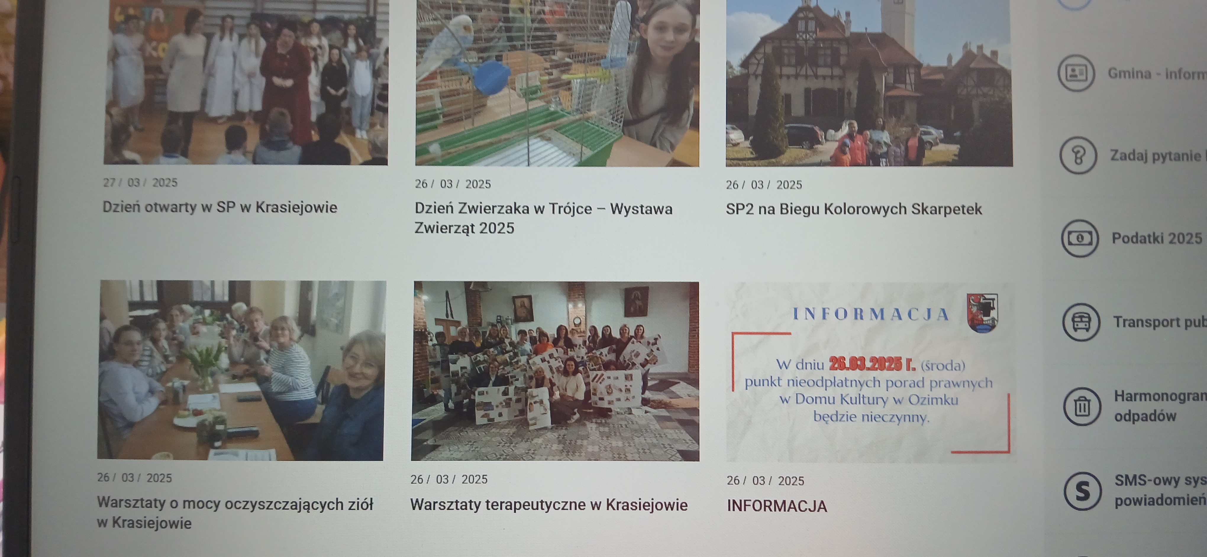 Już dawno nie mieliśmy takiej sytuacji, aby na stronie gminy znalazło się 7 artykułów dotyczących naszej wsi. Pięć informacji: o udziale uczennic w podniosłej uroczystości w Urzędzie Wojewódzkim, sukcesach muzycznych uczniów, Dniu Matematyki i Dniu Otwrtym zaprezentowała Szkoła Podstawowa w Krasiejowie. Gratulujemy!!!. Kolejne dwa posty dotyczyły warsztatów zorganizowanych przez DFK i SMK. Admistratorka strony wsi pozwoliła sobie na zrobienie zdjęcia - screenu strony UMiG Ozimek i zamieszczenie go w galerii.