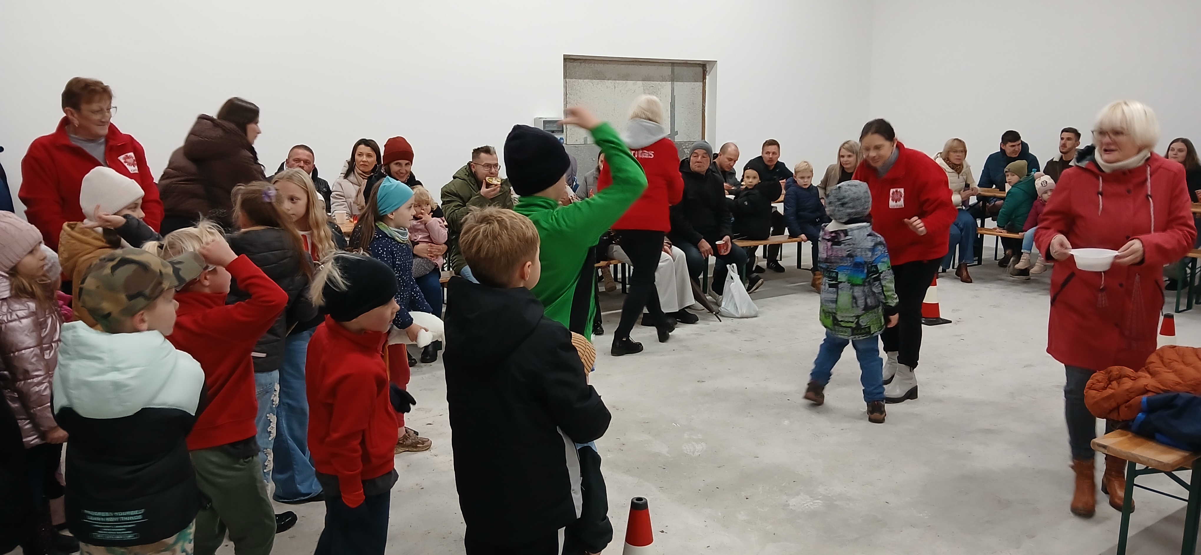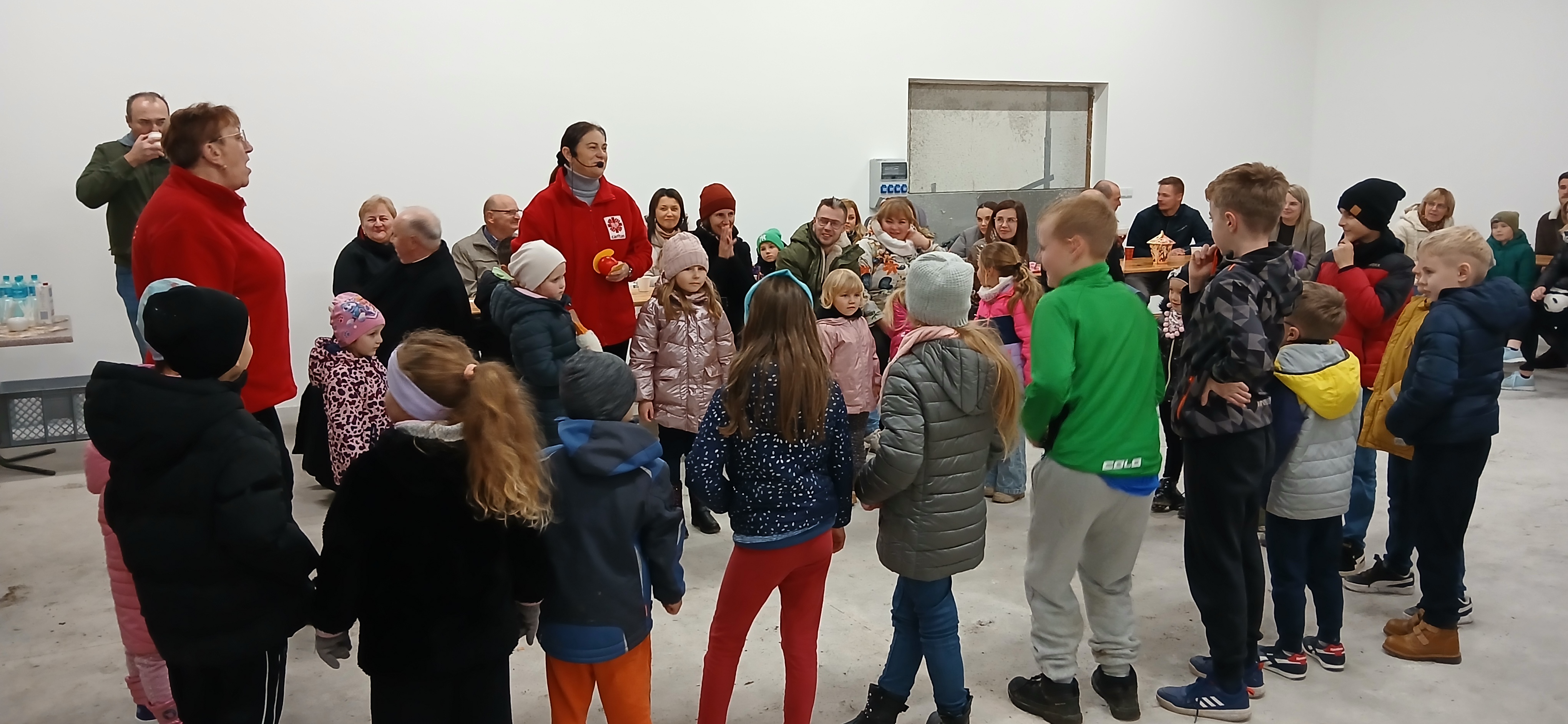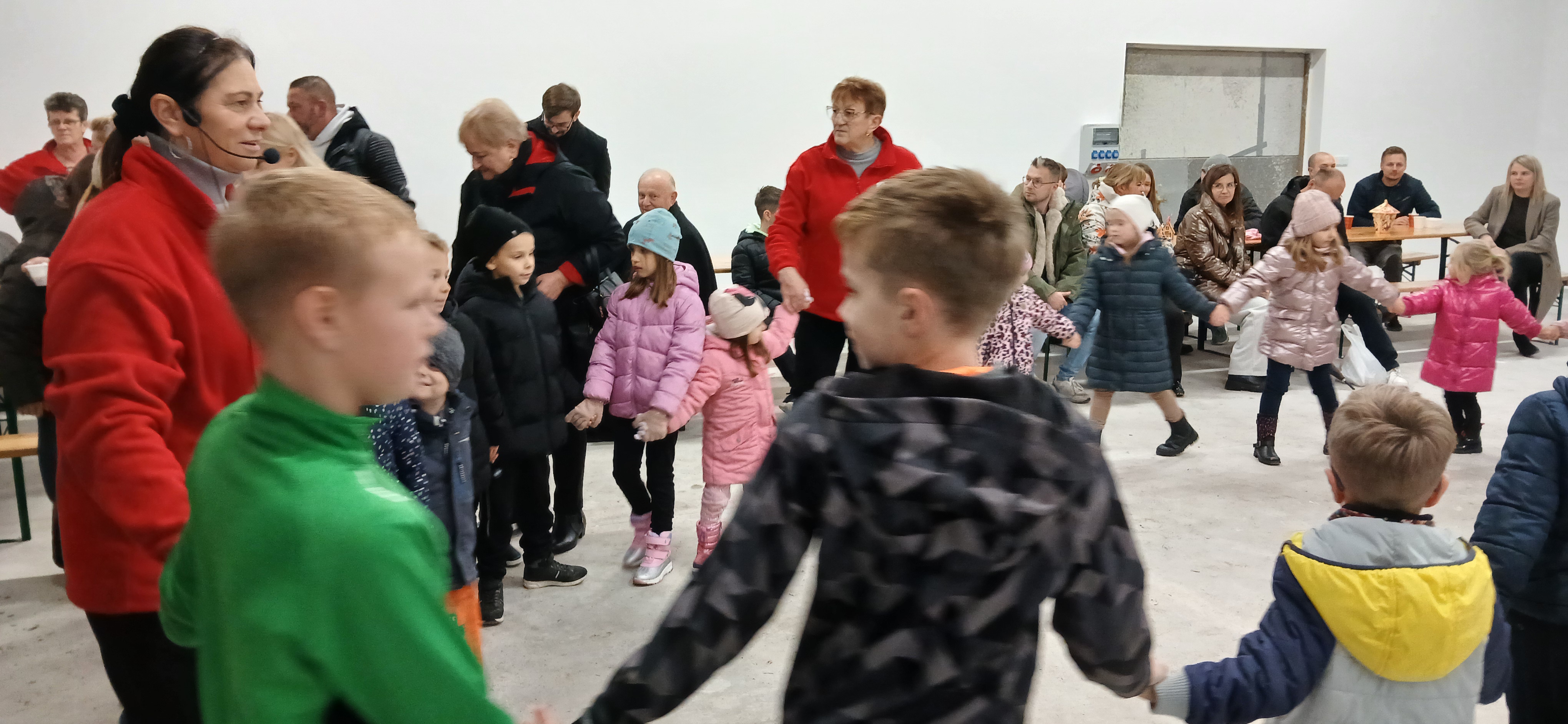 Pani Ewa Kotysz zaopiekowała się wspaniale dziećmi prowadząc przeróżne ciekawe animacje związane z życiem Św. Marcina. W tym celu wykorzystała przygotowane wcześniej eksponaty gąski, koniki, szyszki, no i oczywiście duży wiklinowy kosz z cukierkami, które cieszyły się ogromnym powodzeniem wśrod dzieci. Oprócz zabaw sprawnościowych odbył się konkurs wiedzy o życiu i szlachetnych czynach św. Marcina. Były też tańce- słynna skoczna belgijka i taniec z latarenkami. Do zabawy z dziećmi zaangażowała się również Pani Teresa Wrześniowska. Podczas, gdy Pani Irena Kostka częstowała gości kromkami chleba ze smalcem i rozdawała rogale, pozostałe Panie Edyta Wer, Karina Kaczmarczyk i Gizela Palus częstowały zebranych żurkiem, kawą i herbatą.