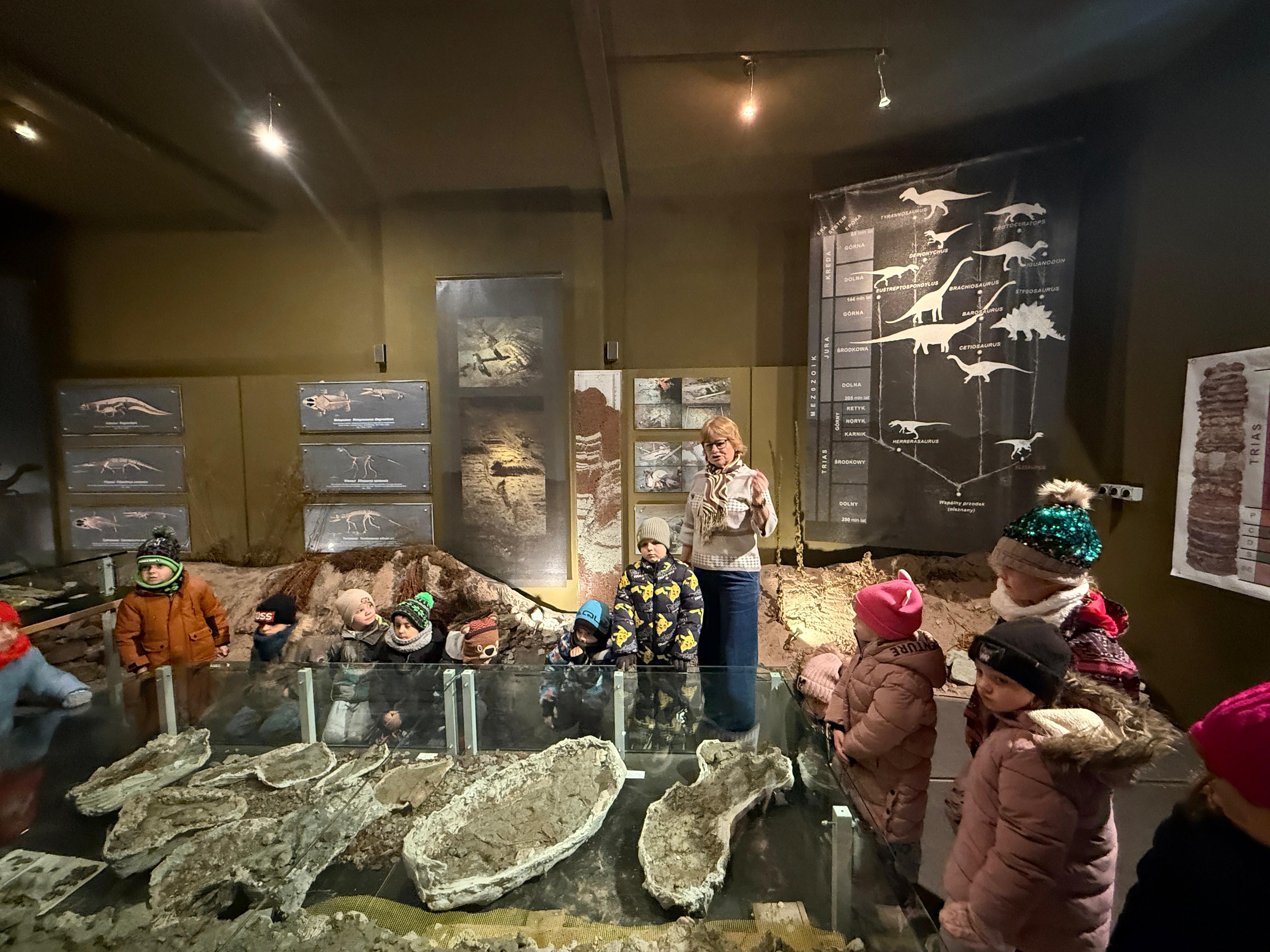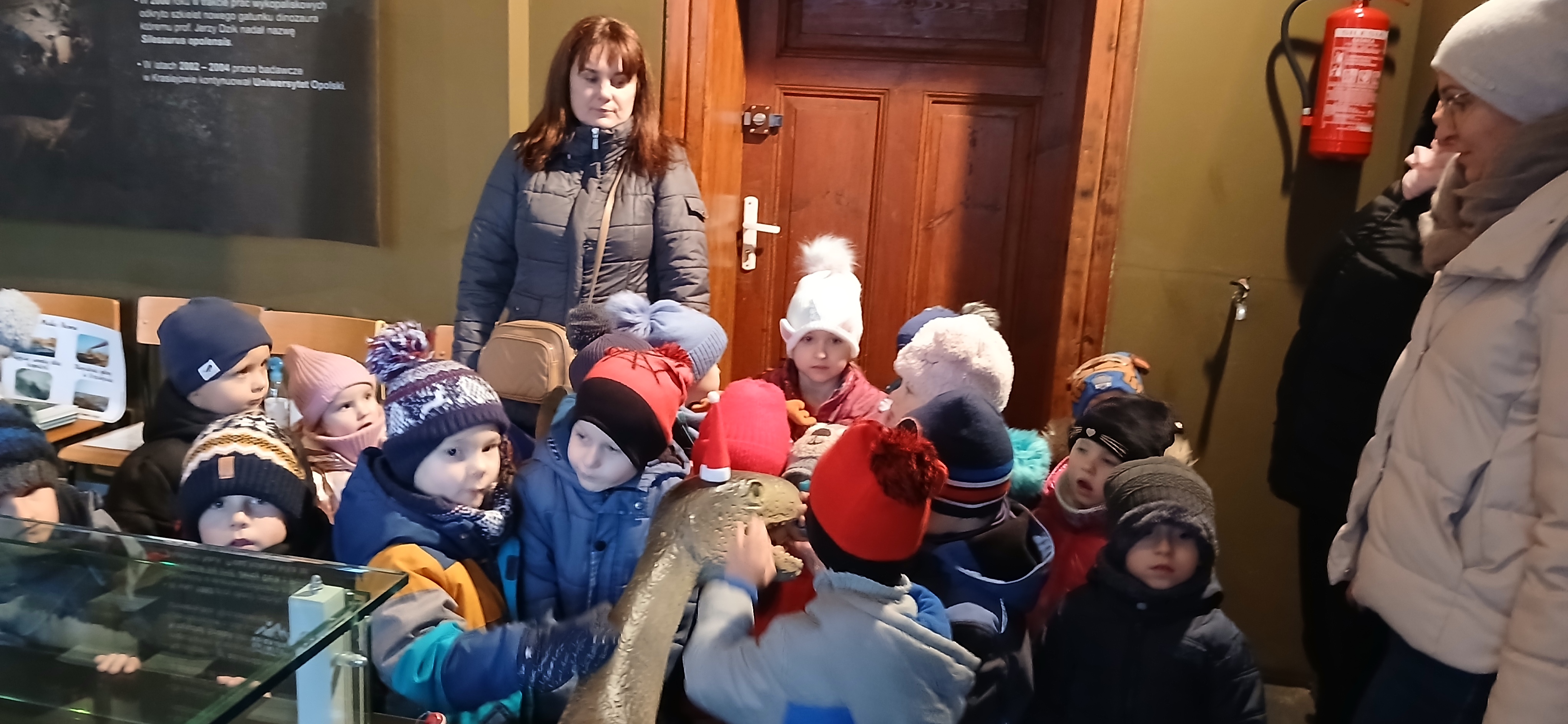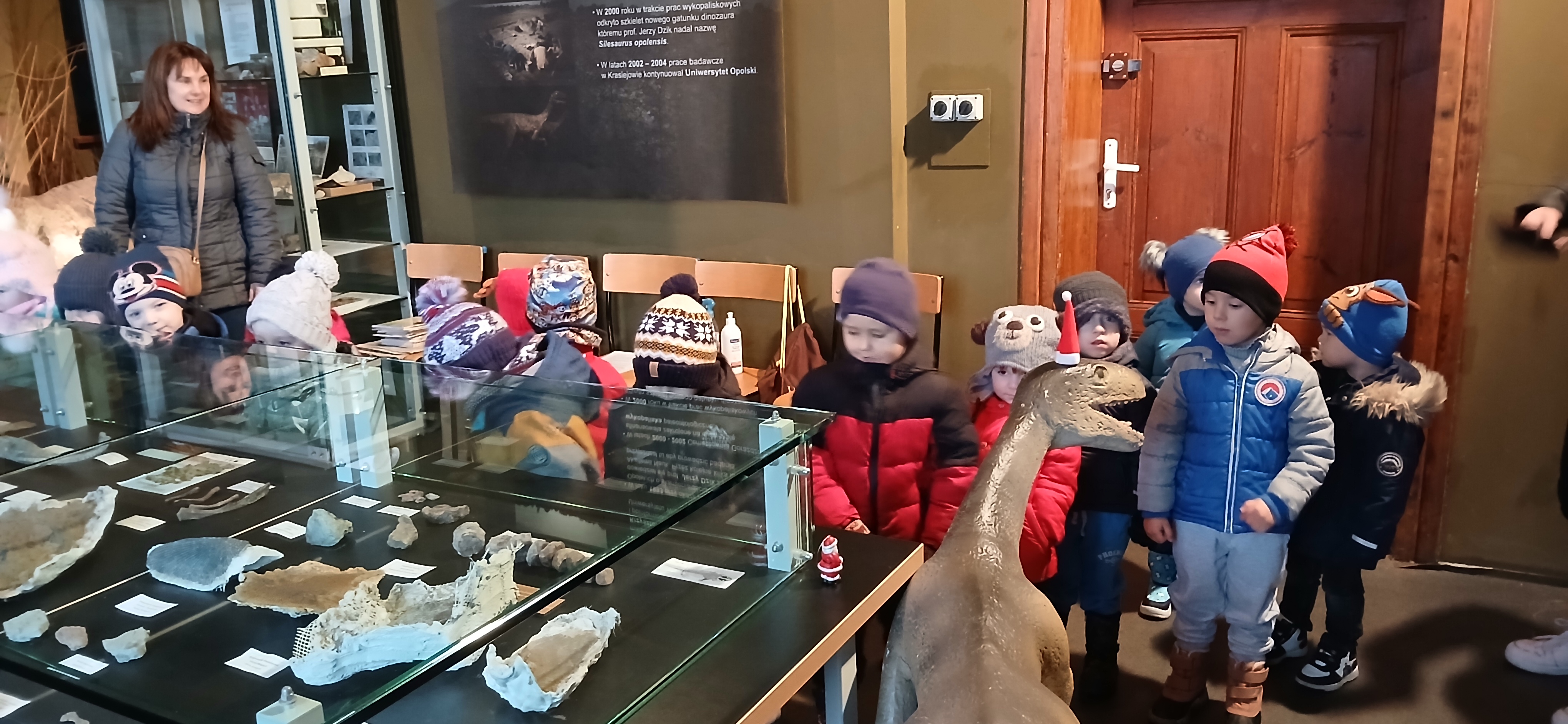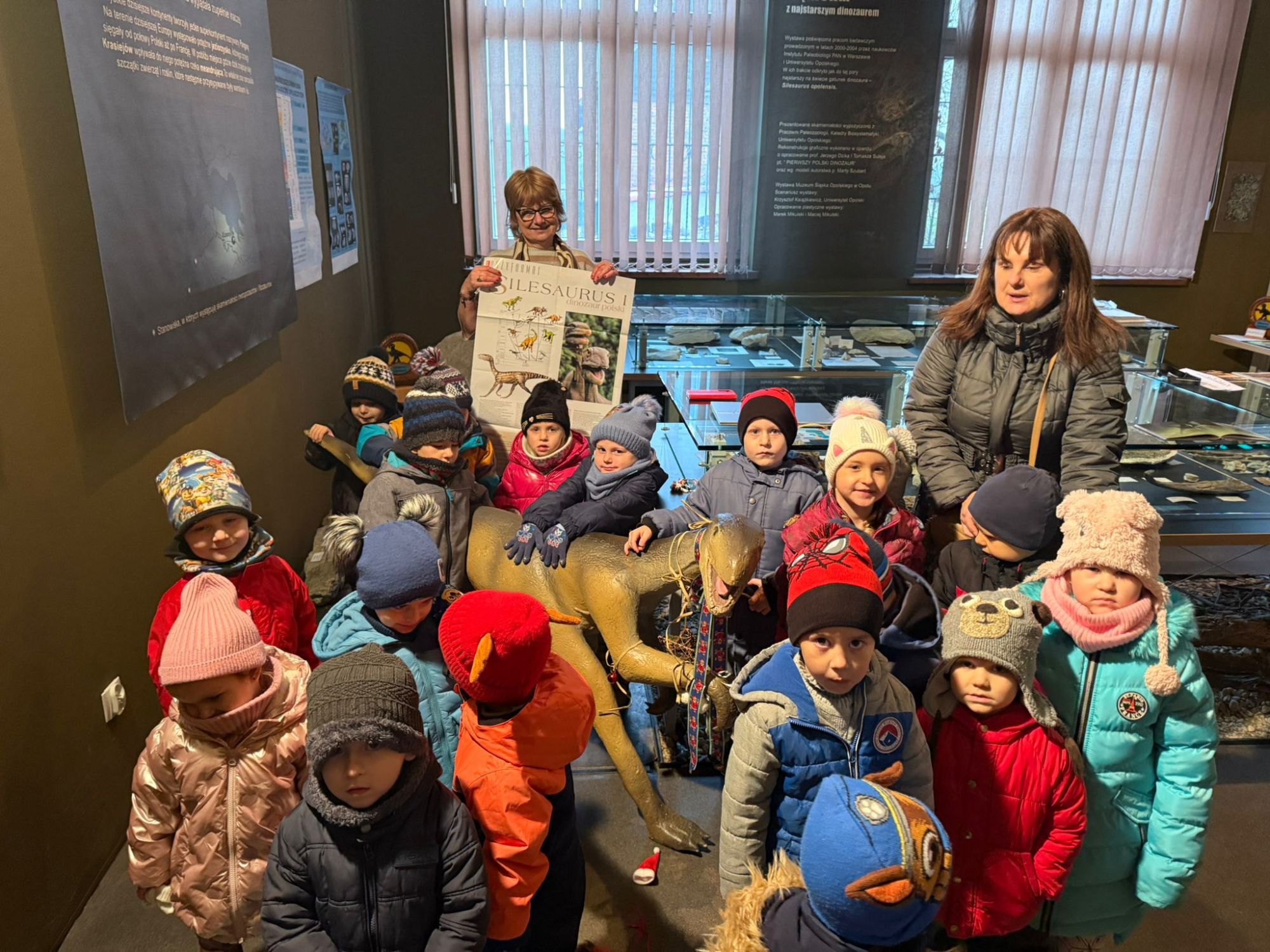W dniu 3 grudnia  dwie grupy przedszkolaków (około 50 osób) wraz z opiekunkami  przybyły do Muzeum Paleontologicznego i Izby Regionalnej w Krasiejowie na zajęcia edukacyjne. Na placu szkolnym rozpoznawały prehistoryczne zwierzęta, które żyły na tym terenie przed 225 milionami lat i odróżniały je od ewolucyjnie późniejszych gatunków dinozaurów, których modele znajdują się na placu szkolnym. Po wejściu do sali muzealnej przywitał dzieci nasz Silesaurus opolensis, który założył na te okoliczność odświętną czapeczkę. Oprowadzająca omówiła, kim jest paleontolog i na czym polega jego praca, pokazywała skamieniałości, a dzieci rozpoznawały części metopozaura w szklanej gablocie. Następnie wspólnie szukali odpowiedzi na pytanie, czy w Krasiejowie mieszkali górnicy i czym różni się ich praca od pracy paleontologa. Dzieci rozpoznawały surowce skalne: węgiel kamienny, wapień, glinę, żwir, bazalt i rudy żelaza, a więc te wszystkie, które górnicy wydobywają obecnie lub były eksploatowane na Górnym Śląsku i na Opolszczyźnie. Kustosz porównała strój i wyposażenie paleontologa i górnika, zademonstrowała latarkę czołówkę i kask ochronny. Wyjaśniła, skąd wzięła się nazwa ulicy Cegielnianej i kto odkrył te lokalne skarby. Po zwiedzeniu muzeum na parterze dzieci udały się do sali regionalnej, aby omówić wybrane zagadnienia z historii wsi i obejrzeć sprzęty, którymi dawniej posługiwali się mieszkańcy, wykonujące różne zanikające już zawody. Dzieci dowiedziały się, ile kościołów było w naszej wsi, dlaczego na wystawie znajdują się duże banknoty i świadectwa szkolne niemieckie, jak wyglądała dawna zabudowa i kiedy był wielki pożar. Maluszkom bardzo podobała się też wystawa z ekspozycją zabawek- przeróżnych samochodów strażackich z prywatnej kolekcji Pana Malisza. Oprowadzająca otrzymała piękne podziękowanie od przedszkolaków. Na zakończenie dzieci z drugiej grupy ubrały odświętnie naszego silezaura kolorowymi bombkami i udały się w drogę powrotną do przedszkola. Zajęcia były dofinansowane z Budżetu Gminy Ozimek.