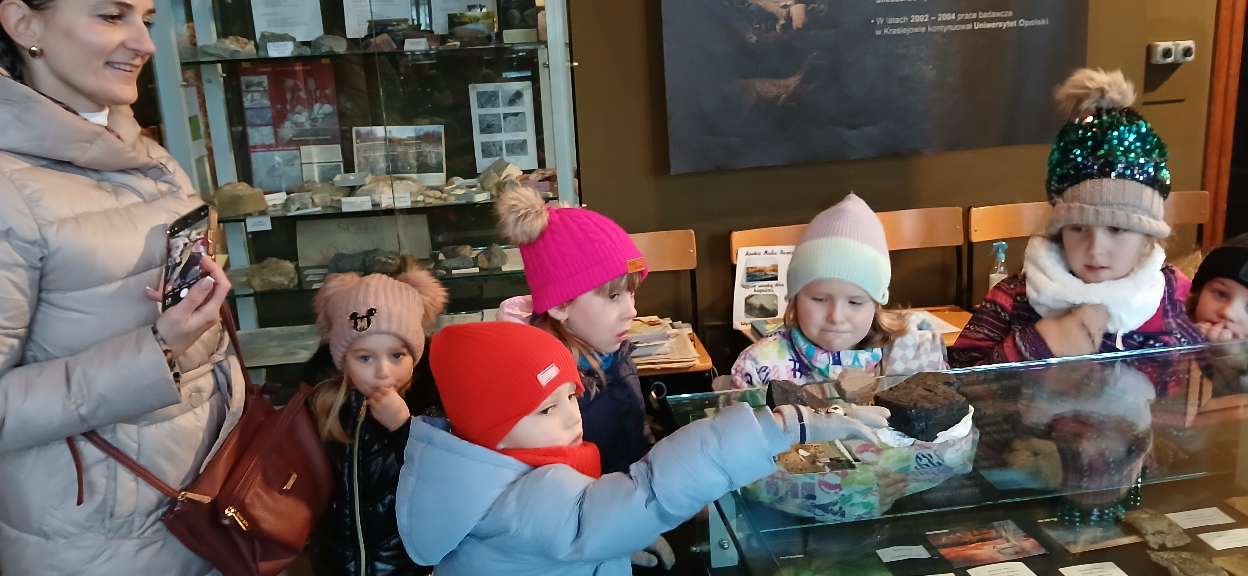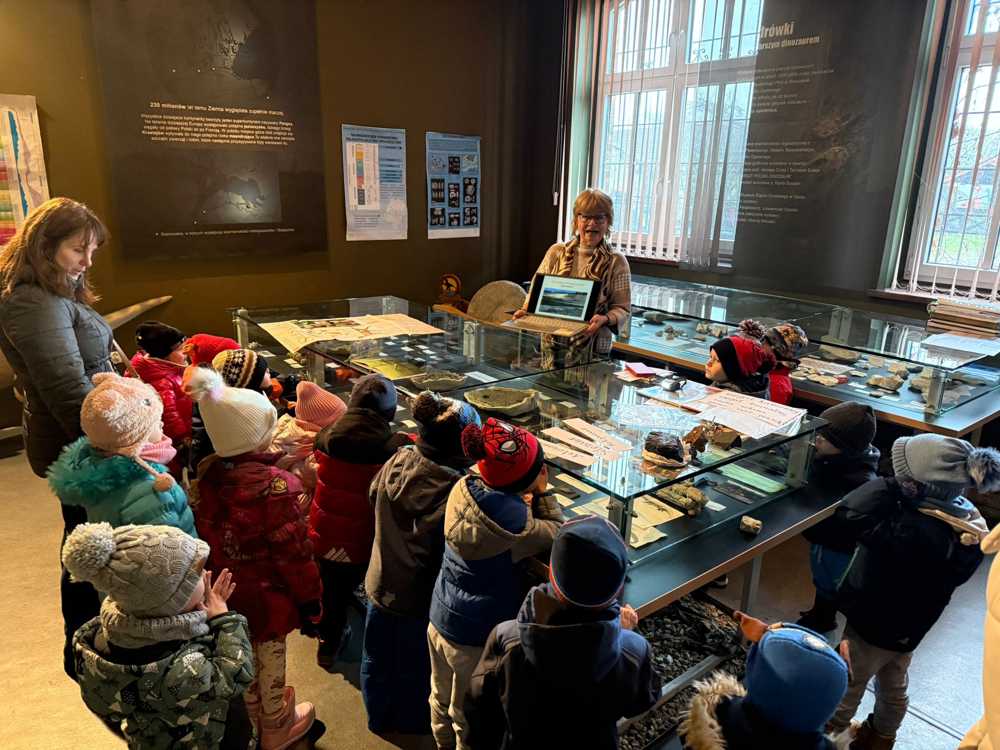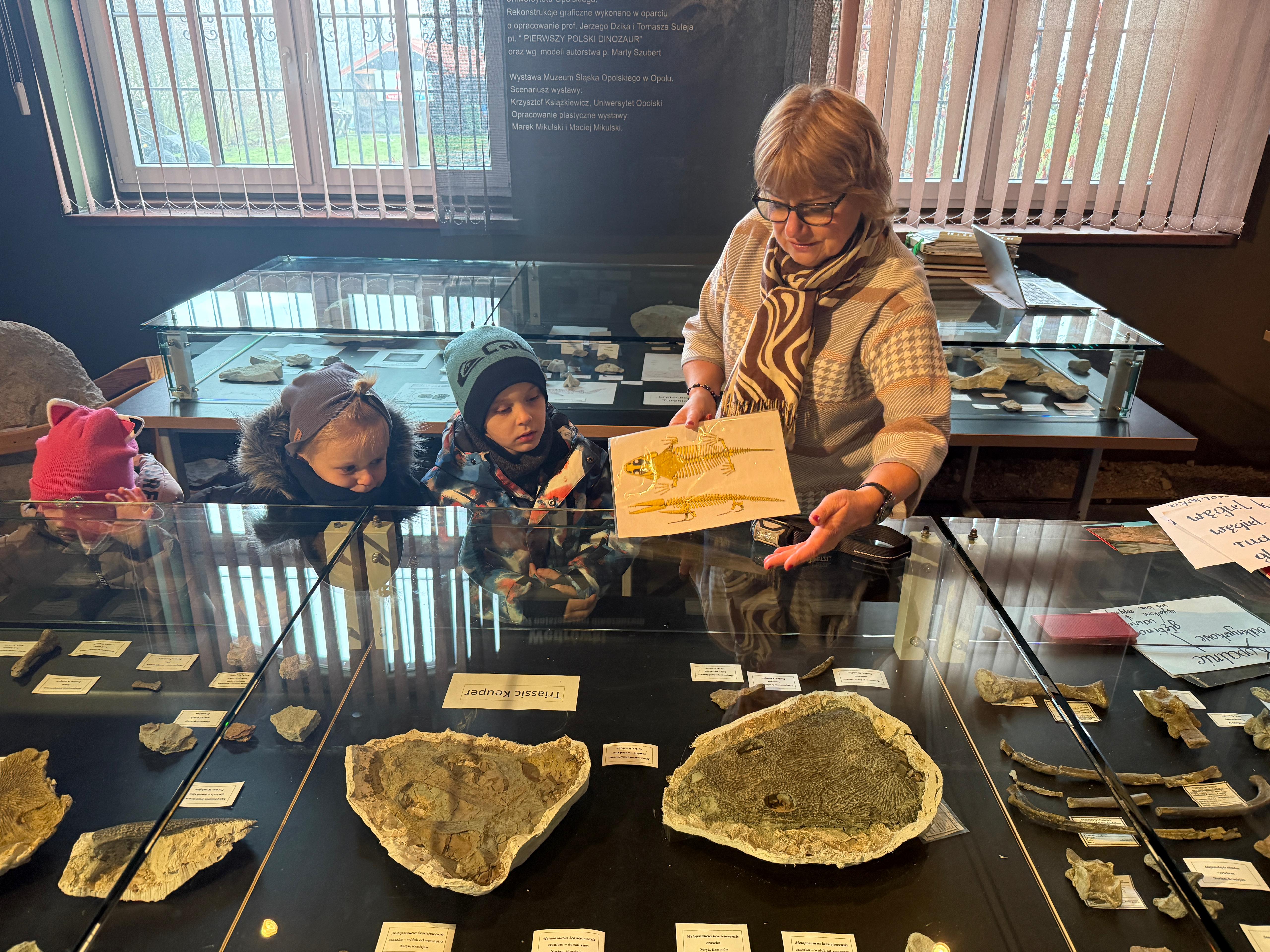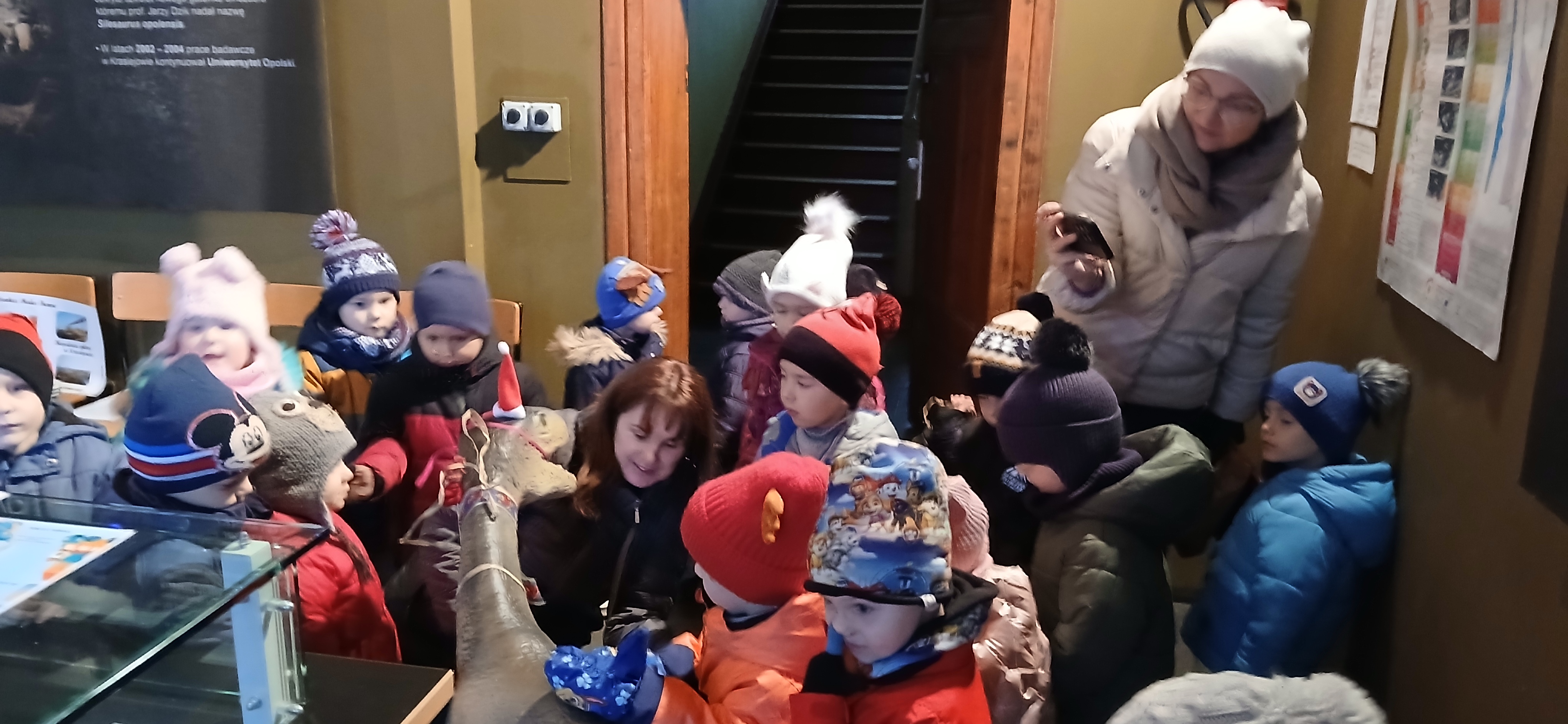 W dniu 3 grudnia  dwie grupy przedszkolaków (około 50 osób) wraz z opiekunkami  przybyły do Muzeum Paleontologicznego i Izby Regionalnej w Krasiejowie na zajęcia edukacyjne. Na placu szkolnym rozpoznawały prehistoryczne zwierzęta, które żyły na tym terenie przed 225 milionami lat i odróżniały je od ewolucyjnie późniejszych gatunków dinozaurów, których modele znajdują się na placu szkolnym. Po wejściu do sali muzealnej przywitał dzieci nasz Silesaurus opolensis, który założył na te okoliczność odświętną czapeczkę. Oprowadzająca omówiła, kim jest paleontolog i na czym polega jego praca, pokazywała skamieniałości, a dzieci rozpoznawały części metopozaura w szklanej gablocie. Następnie wspólnie szukali odpowiedzi na pytanie, czy w Krasiejowie mieszkali górnicy i czym różni się ich praca od pracy paleontologa. Dzieci rozpoznawały surowce skalne: węgiel kamienny, wapień, glinę, żwir, bazalt i rudy żelaza, a więc te wszystkie, które górnicy wydobywają obecnie lub były eksploatowane na Górnym Śląsku i na Opolszczyźnie. Kustosz porównała strój i wyposażenie paleontologa i górnika, zademonstrowała latarkę czołówkę i kask ochronny. Wyjaśniła, skąd wzięła się nazwa ulicy Cegielnianej i kto odkrył te lokalne skarby. Po zwiedzeniu muzeum na parterze dzieci udały się do sali regionalnej, aby omówić wybrane zagadnienia z historii wsi i obejrzeć sprzęty, którymi dawniej posługiwali się mieszkańcy, wykonujące różne zanikające już zawody. Dzieci dowiedziały się, ile kościołów było w naszej wsi, dlaczego na wystawie znajdują się duże banknoty i świadectwa szkolne niemieckie, jak wyglądała dawna zabudowa i kiedy był wielki pożar. Maluszkom bardzo podobała się też wystawa z ekspozycją zabawek- przeróżnych samochodów strażackich z prywatnej kolekcji Pana Malisza. Oprowadzająca otrzymała piękne podziękowanie od przedszkolaków. Na zakończenie dzieci z drugiej grupy ubrały odświętnie naszego silezaura kolorowymi bombkami i udały się w drogę powrotną do przedszkola. Zajęcia były dofinansowane z Budżetu Gminy Ozimek.