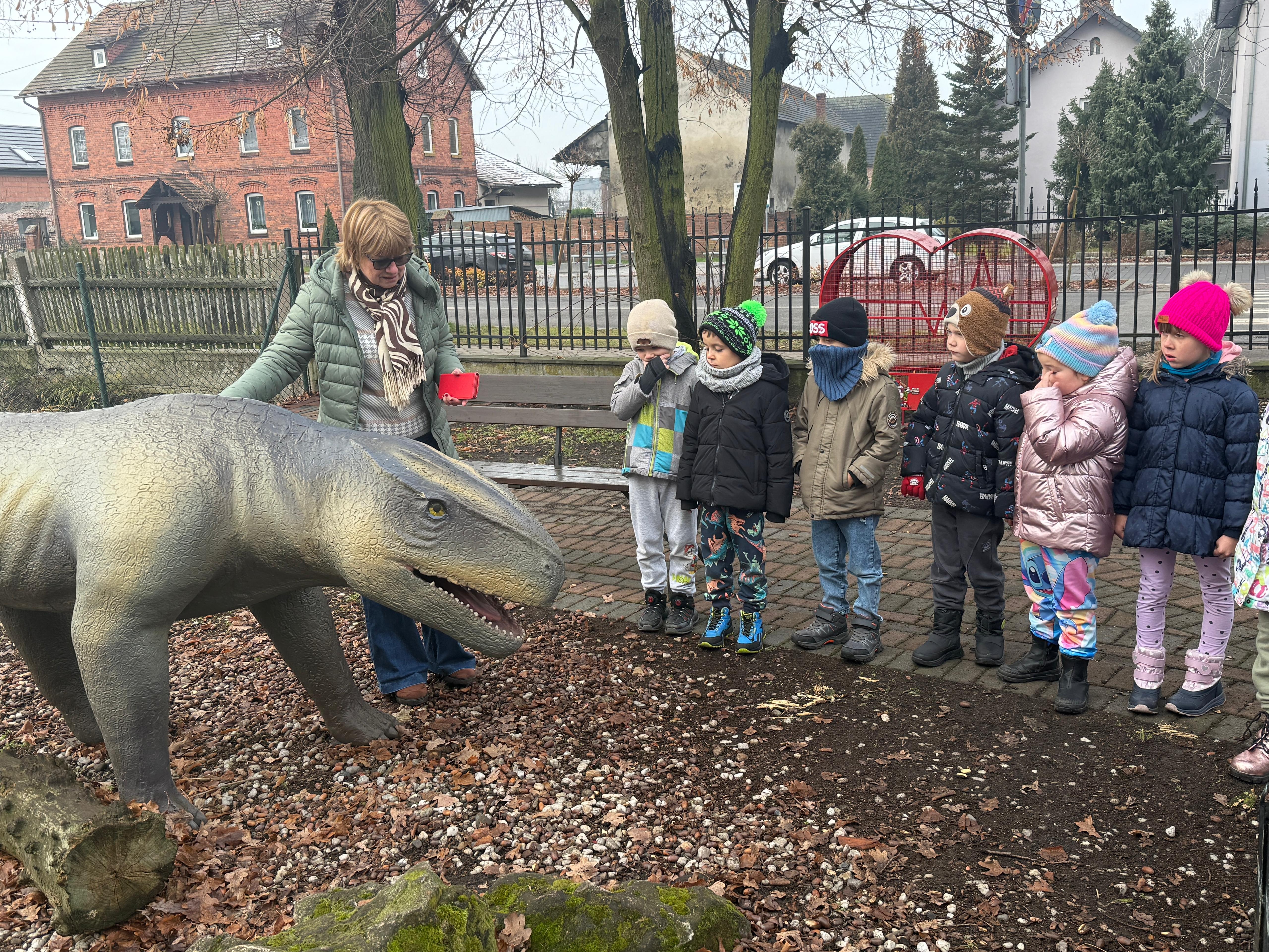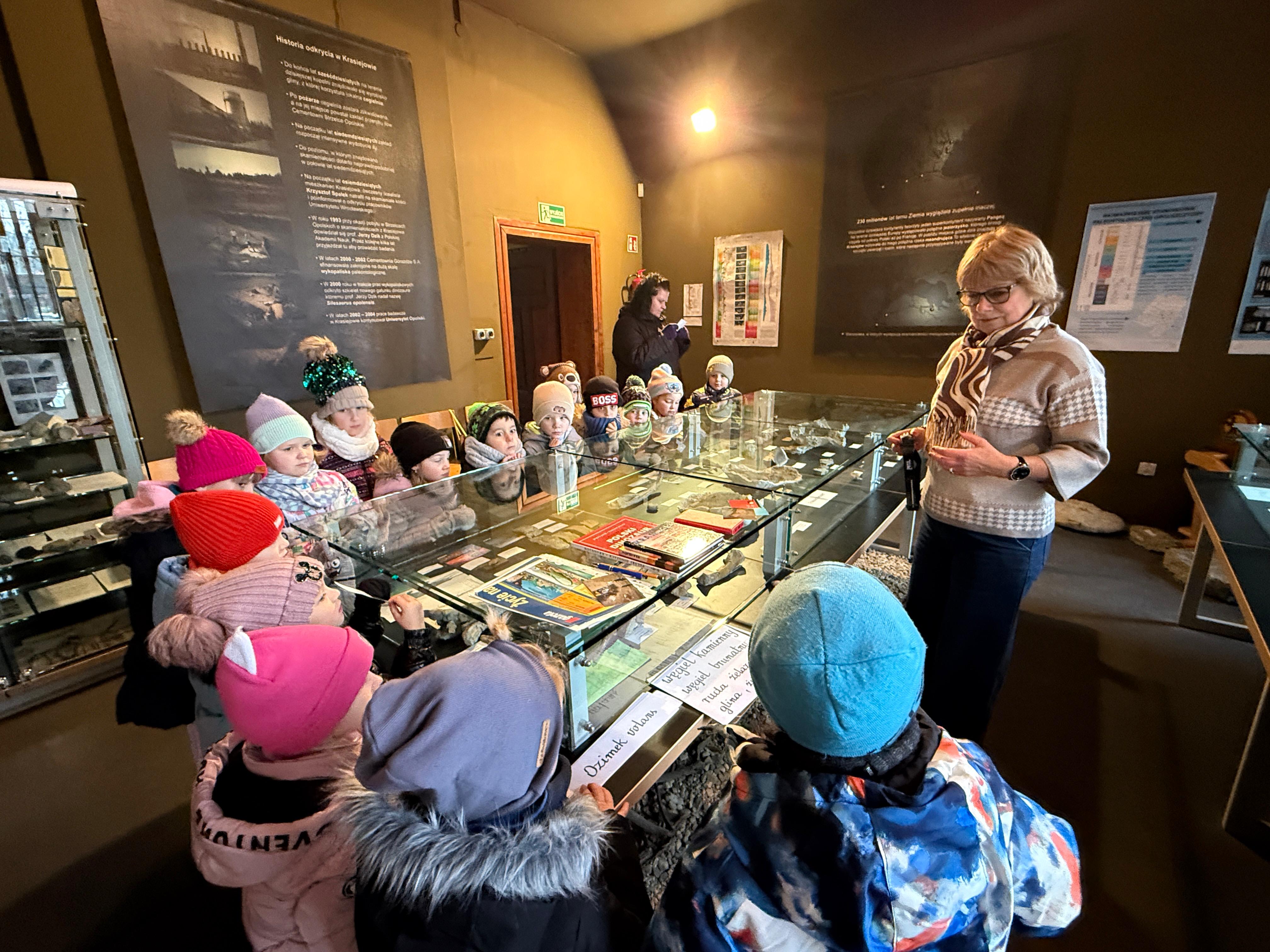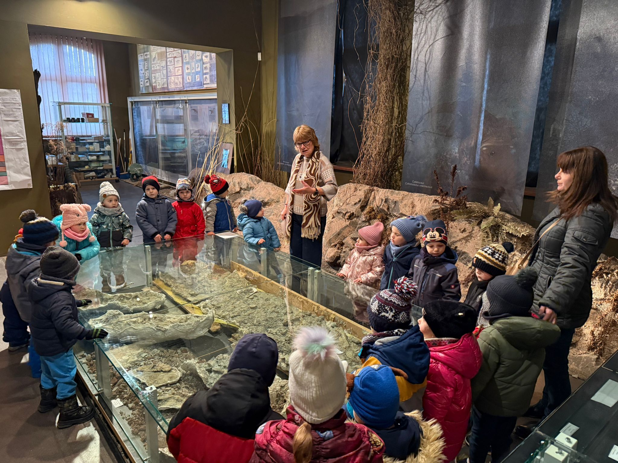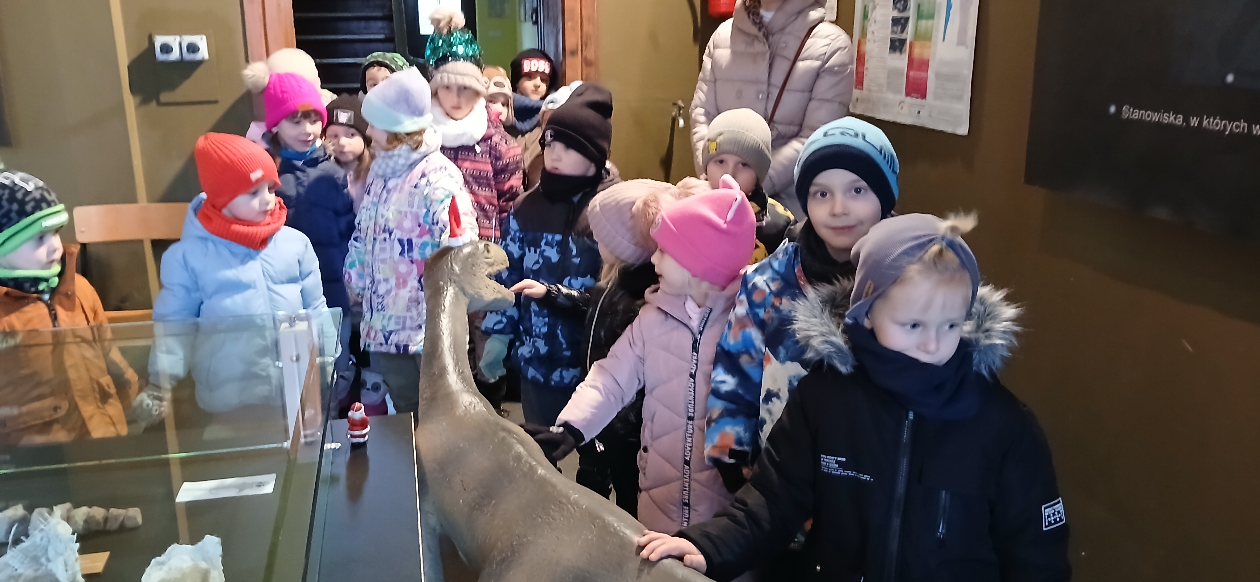 W dniu 3 grudnia  dwie grupy przedszkolaków (około 50 osób) wraz z opiekunkami  przybyły do Muzeum Paleontologicznego i Izby Regionalnej w Krasiejowie na zajęcia edukacyjne. Na placu szkolnym rozpoznawały prehistoryczne zwierzęta, które żyły na tym terenie przed 225 milionami lat i odróżniały je od ewolucyjnie późniejszych gatunków dinozaurów, których modele znajdują się na placu szkolnym. Po wejściu do sali muzealnej przywitał dzieci nasz Silesaurus opolensis, który założył na te okoliczność odświętną czapeczkę. Oprowadzająca omówiła, kim jest paleontolog i na czym polega jego praca, pokazywała skamieniałości, a dzieci rozpoznawały części metopozaura w szklanej gablocie. Następnie wspólnie szukali odpowiedzi na pytanie, czy w Krasiejowie mieszkali górnicy i czym różni się ich praca od pracy paleontologa. Dzieci rozpoznawały surowce skalne: węgiel kamienny, wapień, glinę, żwir, bazalt i rudy żelaza, a więc te wszystkie, które górnicy wydobywają obecnie lub były eksploatowane na Górnym Śląsku i na Opolszczyźnie. Kustosz porównała strój i wyposażenie paleontologa i górnika, zademonstrowała latarkę czołówkę i kask ochronny. Wyjaśniła, skąd wzięła się nazwa ulicy Cegielnianej i kto odkrył te lokalne skarby. Po zwiedzeniu muzeum na parterze dzieci udały się do sali regionalnej, aby omówić wybrane zagadnienia z historii wsi i obejrzeć sprzęty, którymi dawniej posługiwali się mieszkańcy, wykonujące różne zanikające już zawody. Dzieci dowiedziały się, ile kościołów było w naszej wsi, dlaczego na wystawie znajdują się duże banknoty i świadectwa szkolne niemieckie, jak wyglądała dawna zabudowa i kiedy był wielki pożar. Maluszkom bardzo podobała się też wystawa z ekspozycją zabawek- przeróżnych samochodów strażackich z prywatnej kolekcji Pana Malisza. Oprowadzająca otrzymała piękne podziękowanie od przedszkolaków. Na zakończenie dzieci z drugiej grupy ubrały odświętnie naszego silezaura kolorowymi bombkami i udały się w drogę powrotną do przedszkola. Zajęcia były dofinansowane z Budżetu Gminy Ozimek.