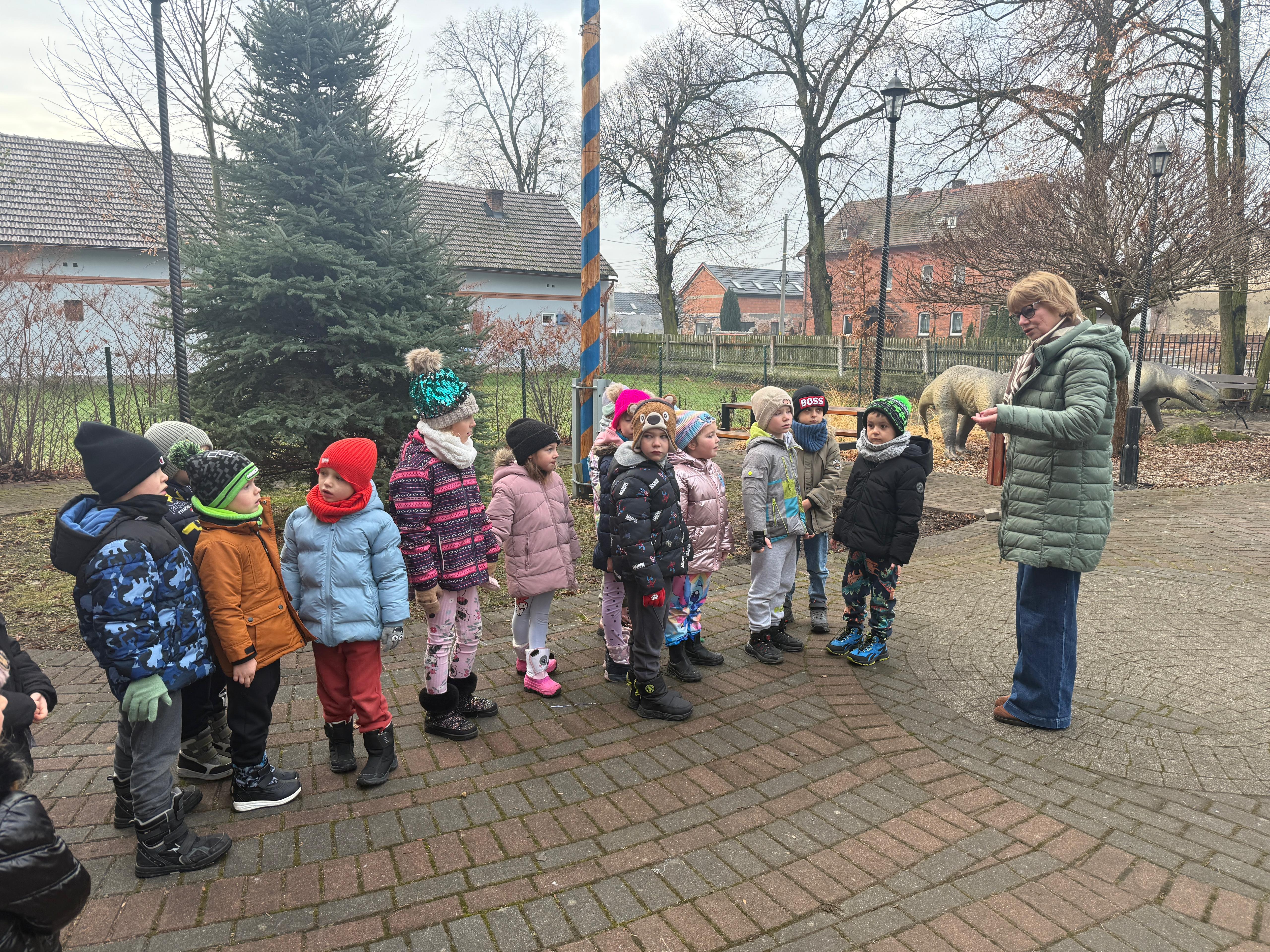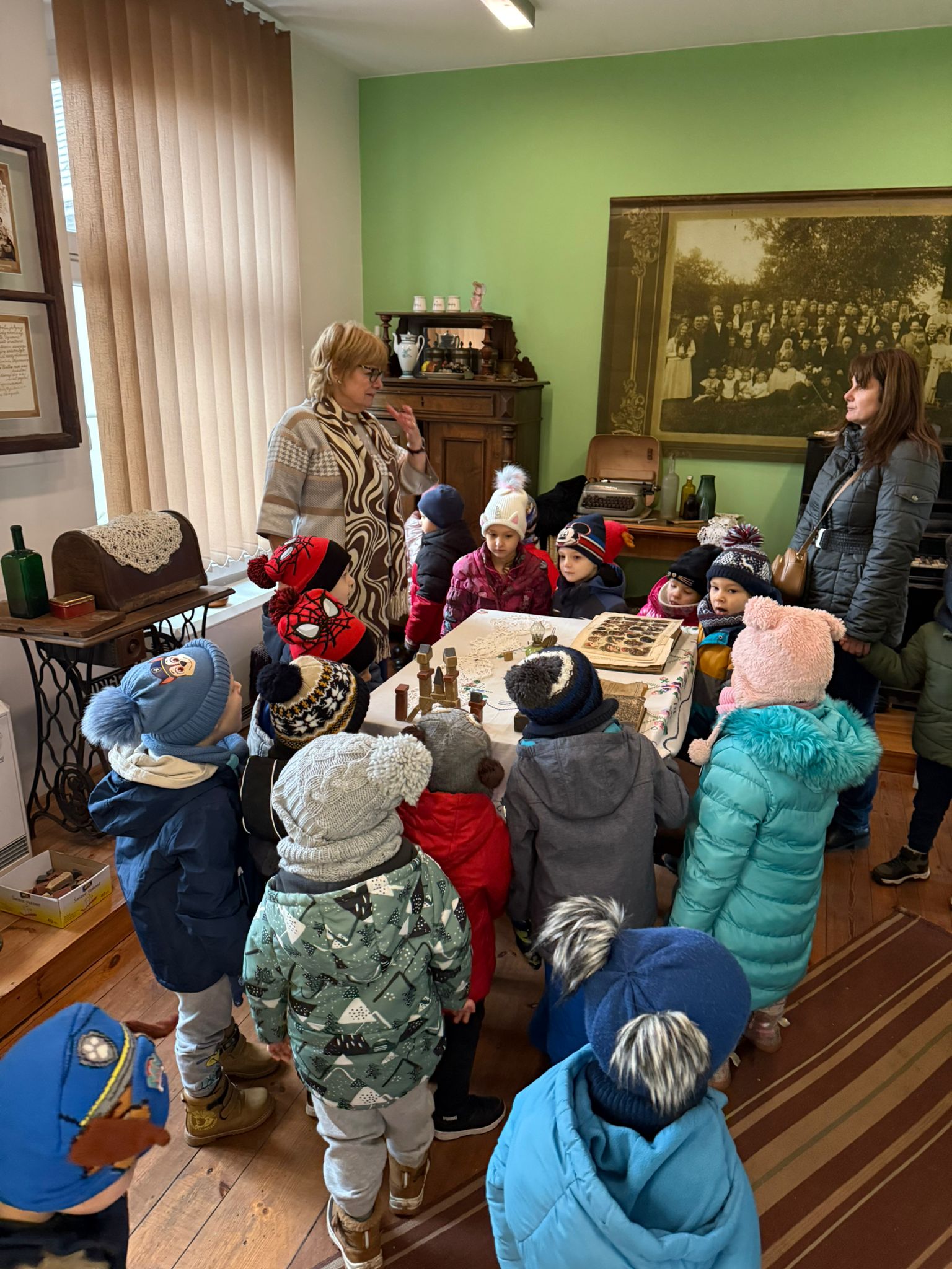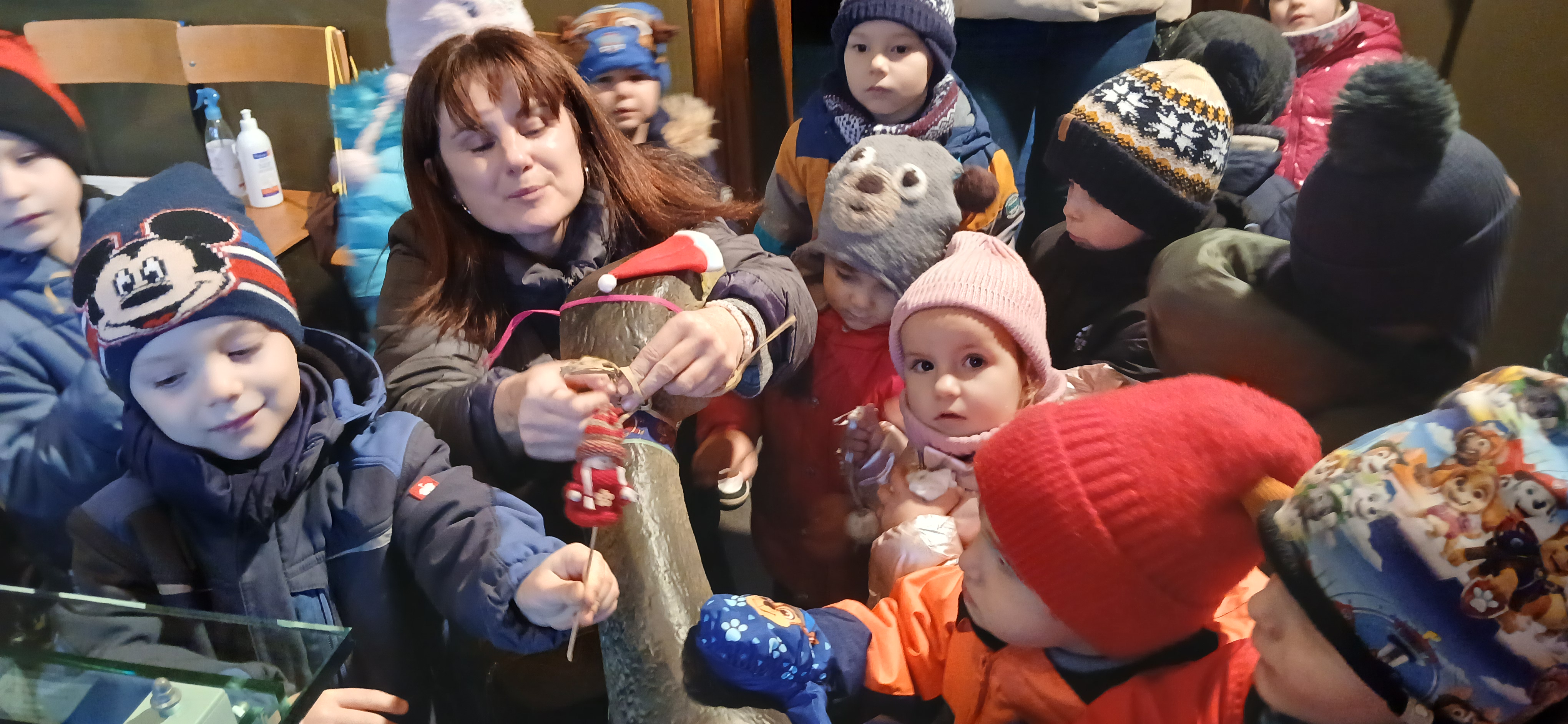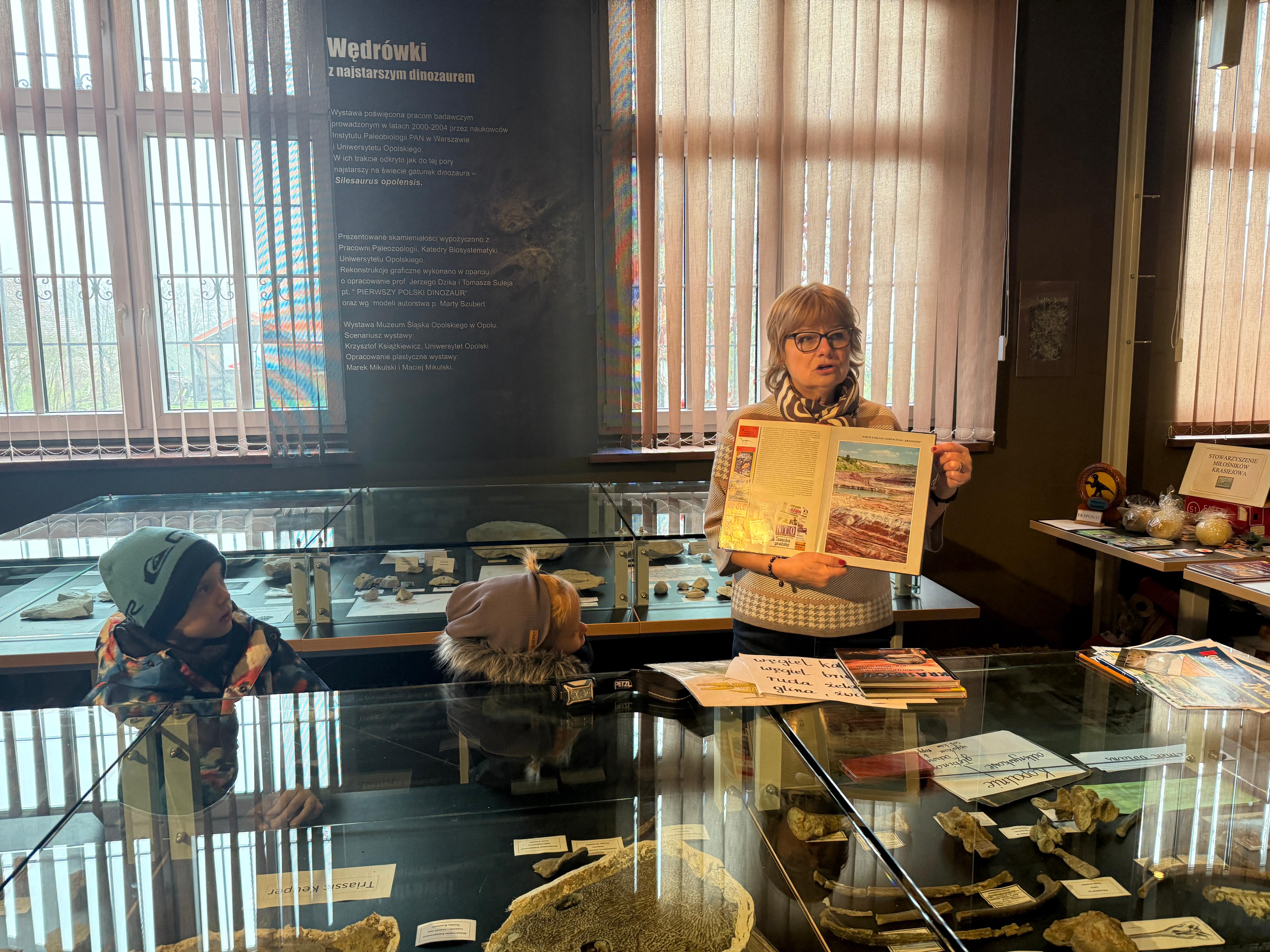 W dniu 3 grudnia  dwie grupy przedszkolaków (około 50 osób) wraz z opiekunkami  przybyły do Muzeum Paleontologicznego i Izby Regionalnej w Krasiejowie na zajęcia edukacyjne. Na placu szkolnym rozpoznawały prehistoryczne zwierzęta, które żyły na tym terenie przed 225 milionami lat i odróżniały je od ewolucyjnie późniejszych gatunków dinozaurów, których modele znajdują się na placu szkolnym. Po wejściu do sali muzealnej przywitał dzieci nasz Silesaurus opolensis, który założył na te okoliczność odświętną czapeczkę. Oprowadzająca omówiła, kim jest paleontolog i na czym polega jego praca, pokazywała skamieniałości, a dzieci rozpoznawały części metopozaura w szklanej gablocie. Następnie wspólnie szukali odpowiedzi na pytanie, czy w Krasiejowie mieszkali górnicy i czym różni się ich praca od pracy paleontologa. Dzieci rozpoznawały surowce skalne: węgiel kamienny, wapień, glinę, żwir, bazalt i rudy żelaza, a więc te wszystkie, które górnicy wydobywają obecnie lub były eksploatowane na Górnym Śląsku i na Opolszczyźnie. Kustosz porównała strój i wyposażenie paleontologa i górnika, zademonstrowała latarkę czołówkę i kask ochronny. Wyjaśniła, skąd wzięła się nazwa ulicy Cegielnianej i kto odkrył te lokalne skarby. Po zwiedzeniu muzeum na parterze dzieci udały się do sali regionalnej, aby omówić wybrane zagadnienia z historii wsi i obejrzeć sprzęty, którymi dawniej posługiwali się mieszkańcy, wykonujące różne zanikające już zawody. Dzieci dowiedziały się, ile kościołów było w naszej wsi, dlaczego na wystawie znajdują się duże banknoty i świadectwa szkolne niemieckie, jak wyglądała dawna zabudowa i kiedy był wielki pożar. Maluszkom bardzo podobała się też wystawa z ekspozycją zabawek- przeróżnych samochodów strażackich z prywatnej kolekcji Pana Malisza. Oprowadzająca otrzymała piękne podziękowanie od przedszkolaków. Na zakończenie dzieci z drugiej grupy ubrały odświętnie naszego silezaura kolorowymi bombkami i udały się w drogę powrotną do przedszkola. Zajęcia były dofinansowane z Budżetu Gminy Ozimek.